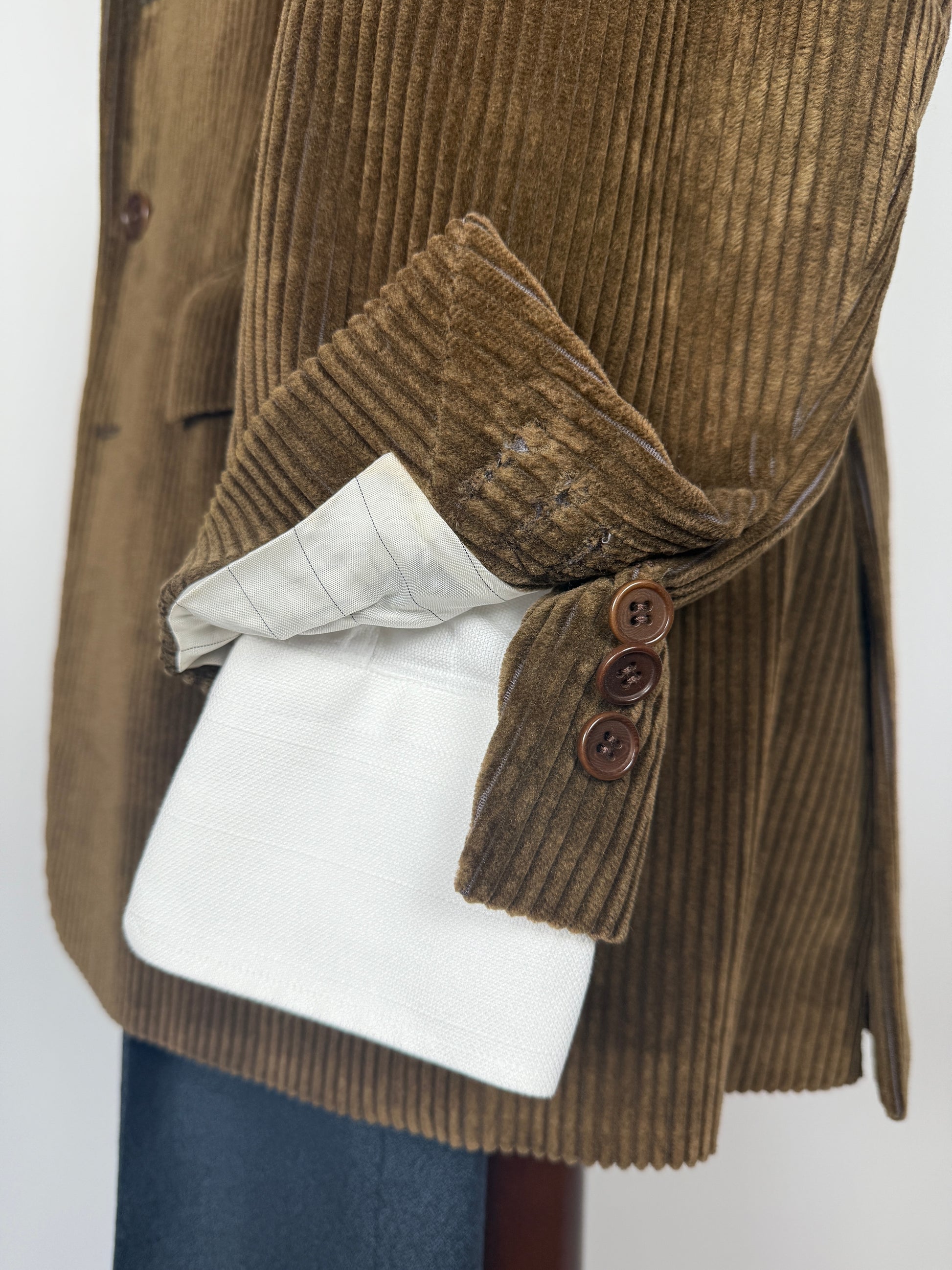 Dettaglio delle asole ai polsi funzionanti, in stile sartoriale.
