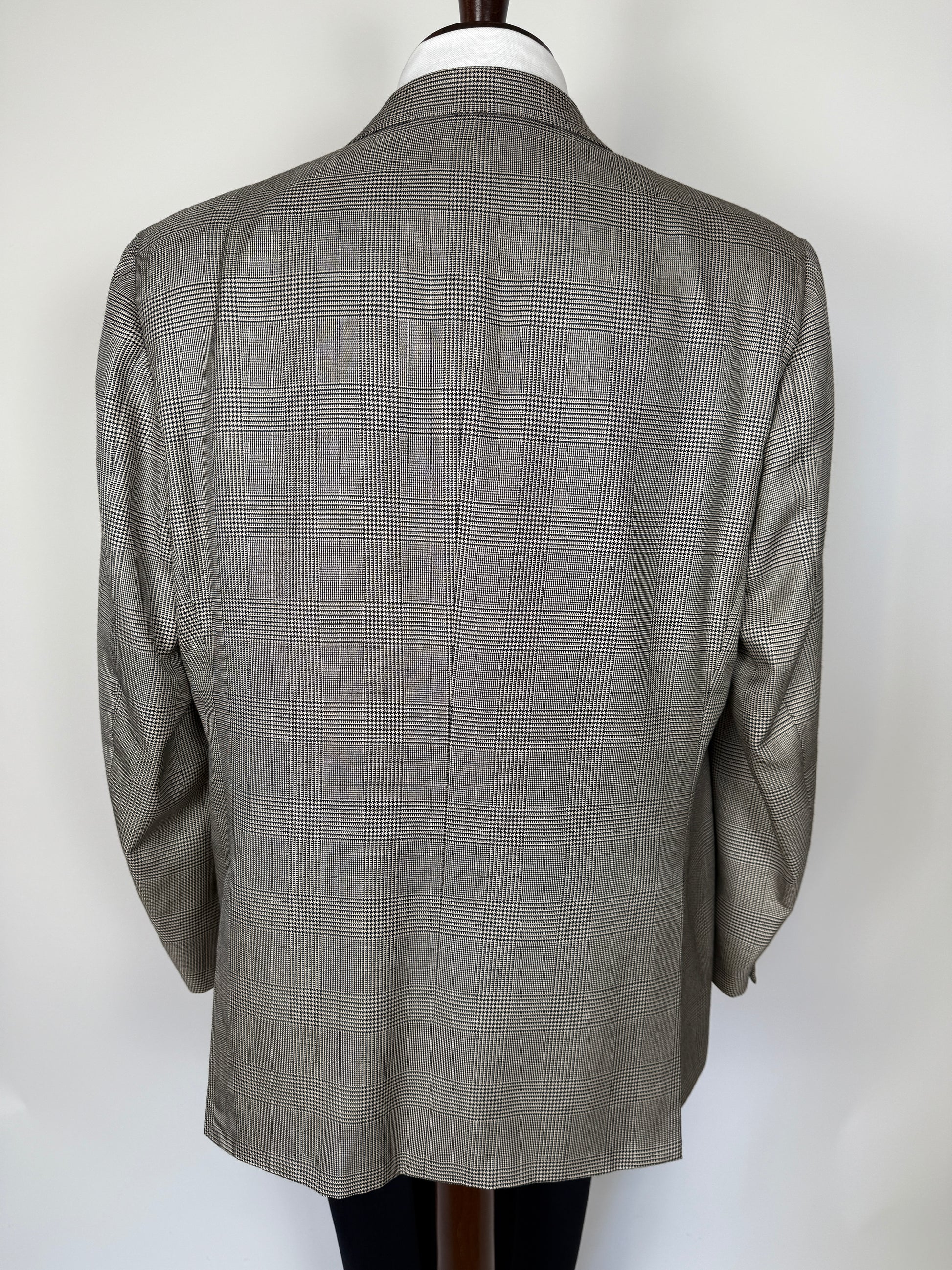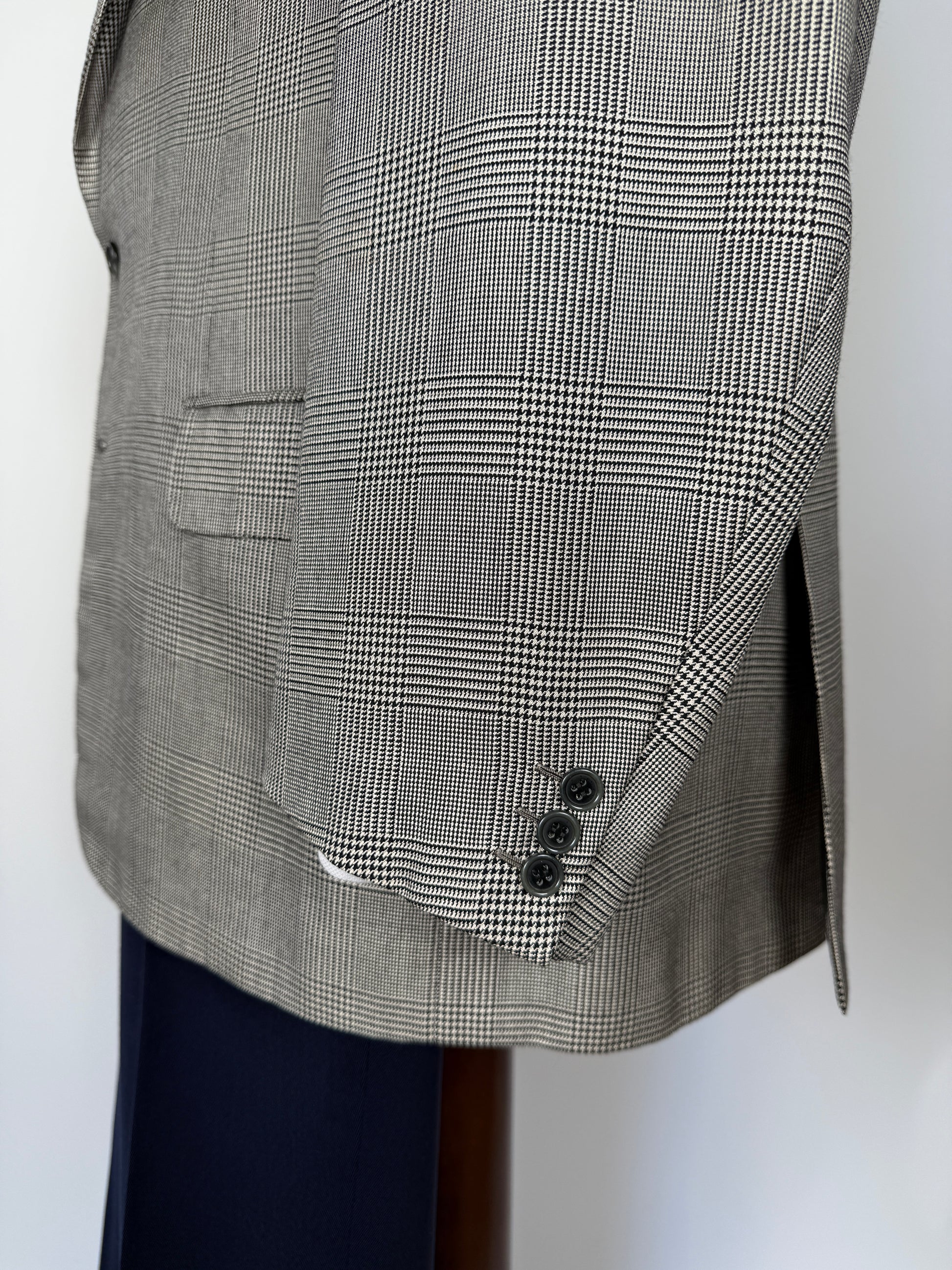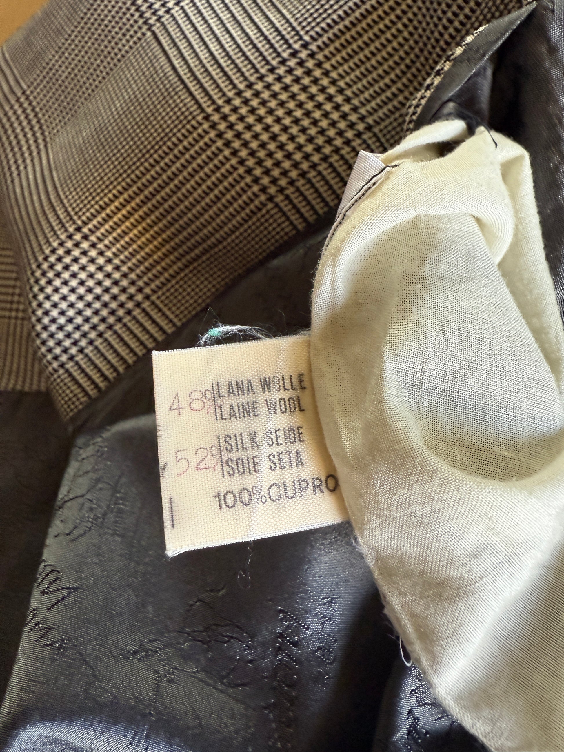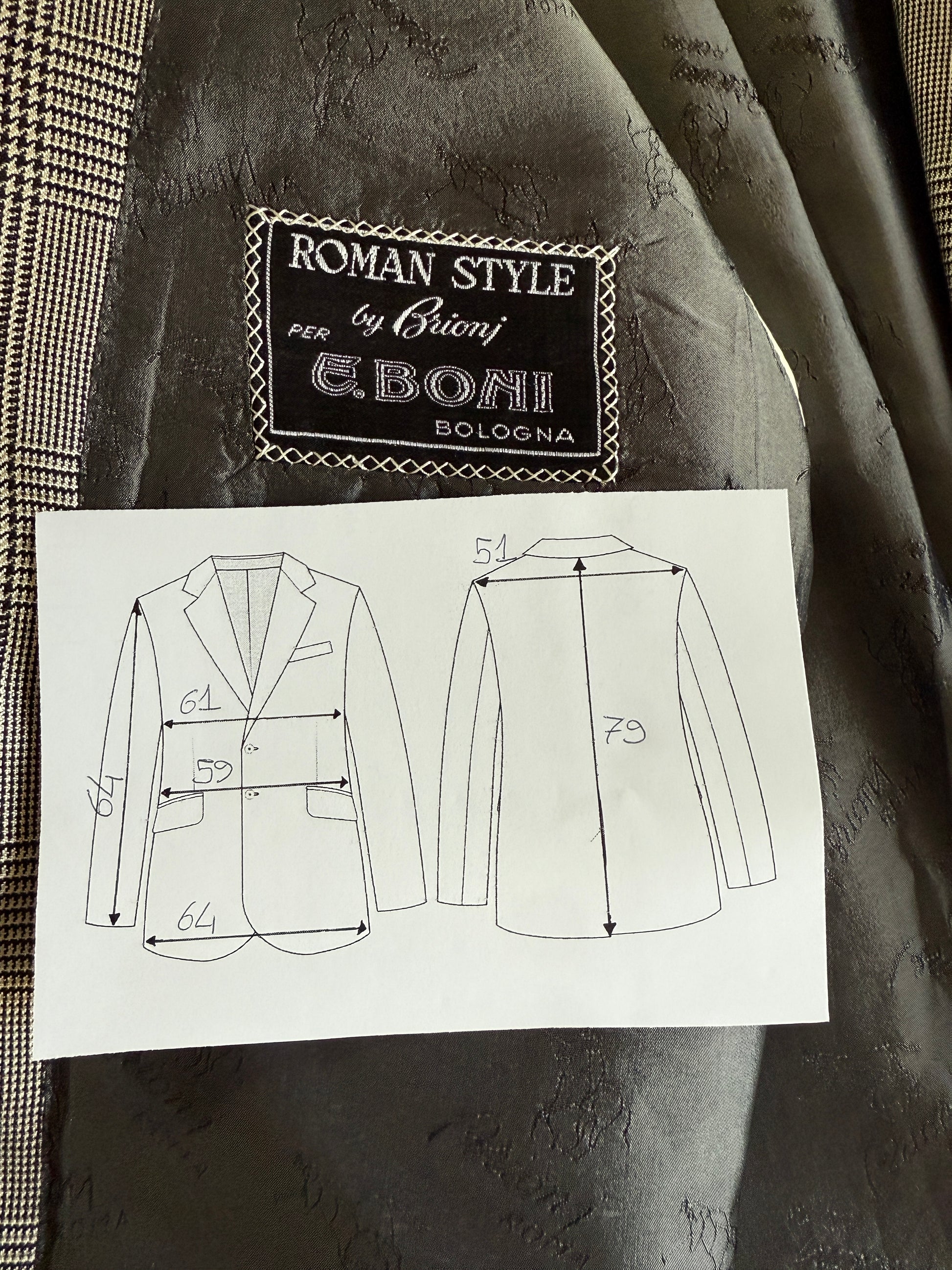 Splendida giacca Brioni anni ‘80 in tessuto principe di Galles pettinato, composizione 52% seta e 48% lana.