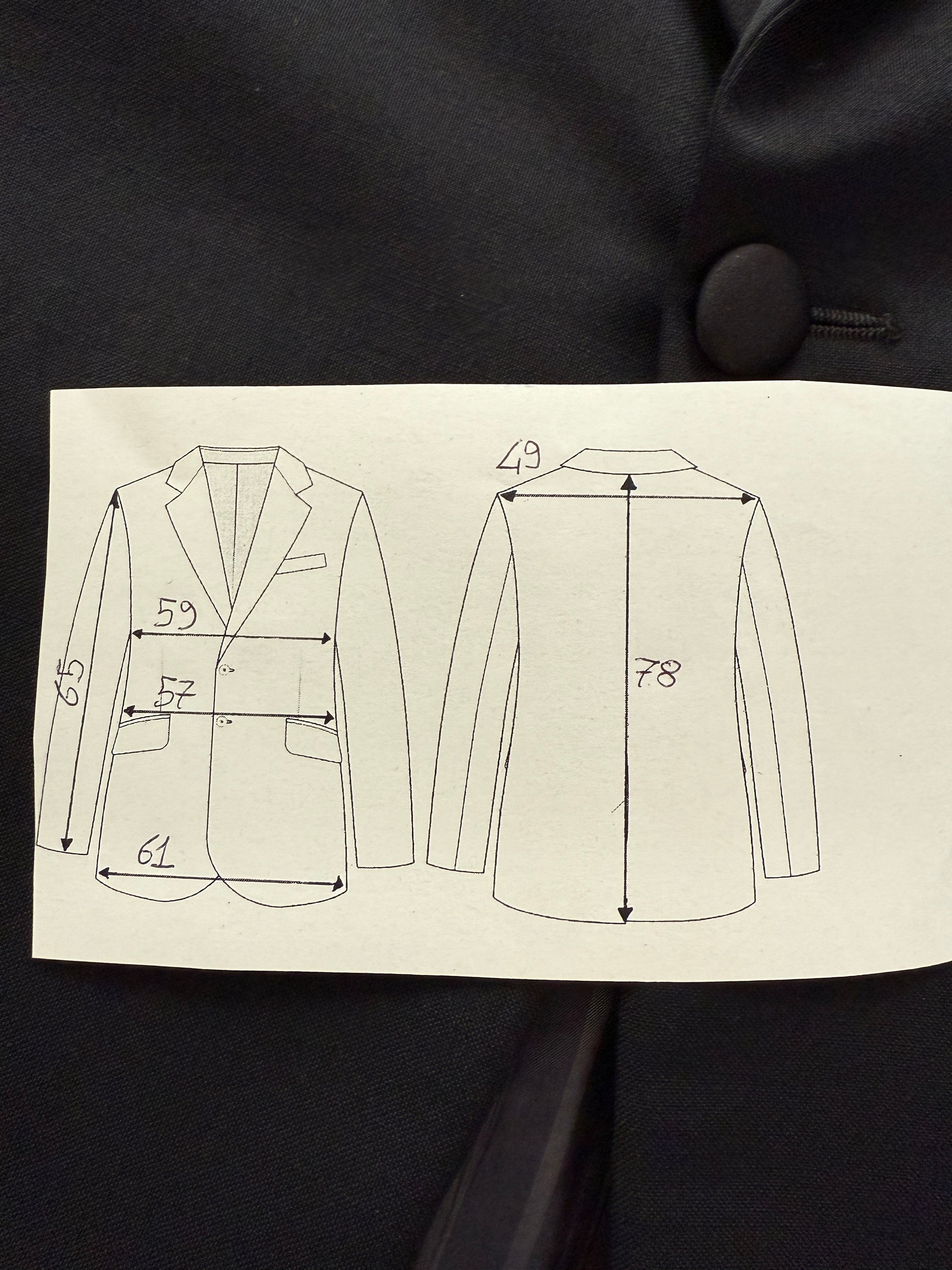 🔎Esempio pratico: la giacca usata come modello in questa guida (v. foto) ha una misura torace di 54 cm. Si tratta della giacca di un abito anni '90 dal taglio generale abbastanza morbido; inoltre, l'abito è un 3 pezzi e va quindi considerato un po' più di margine di vestibilità della giacca per poter indossare comodamente il gilet. Perciò, come da nostra prassi enunciata sopra consideriamo un margine di vestibilità di 6-7 cm: la taglia della giacca sarà quindi 54-6 o 7 = 47 o 48, che corrisponde a una tg. 46/48.