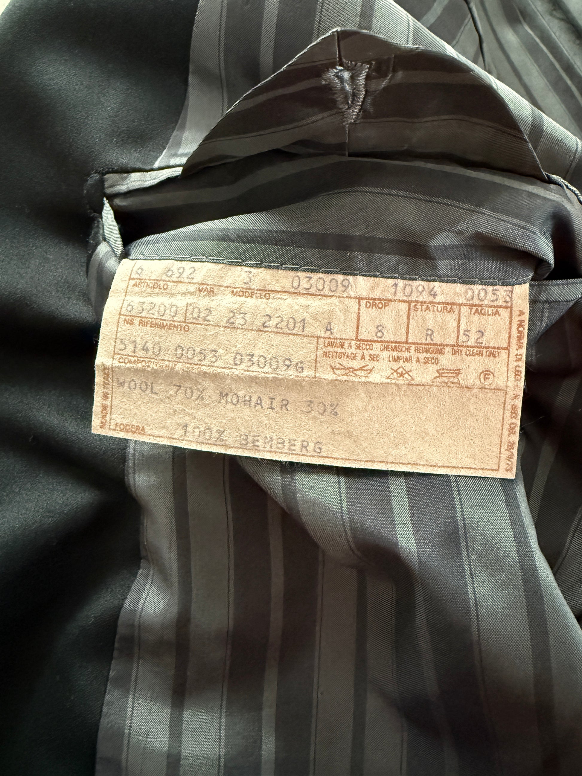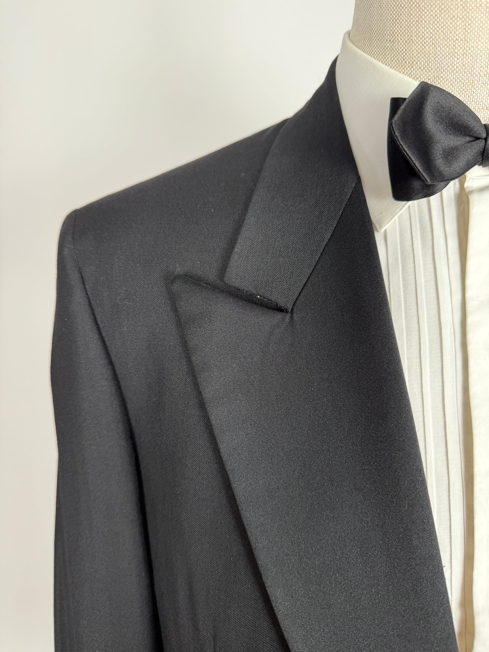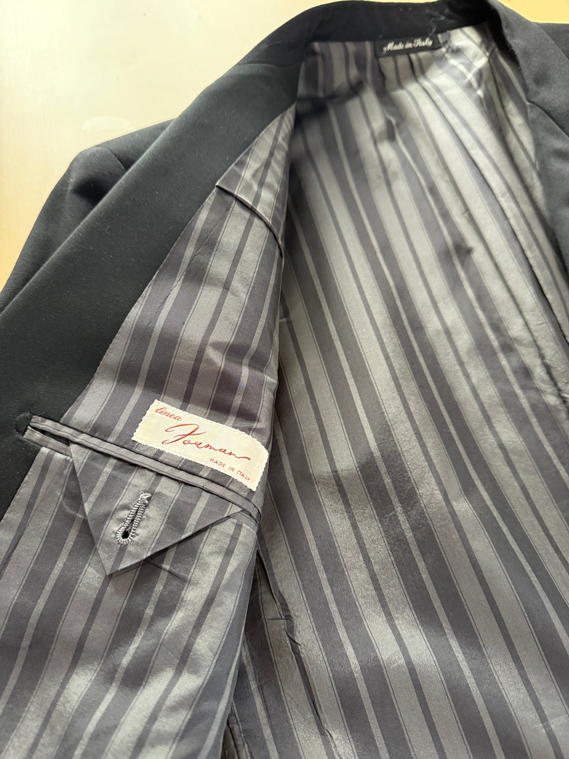 Giacca da smoking anni ‘80, in tela 70% lana e 30% mohair: tessuto dal peso medio-leggero, adatto anche ad un uso estivo. Colore nero.