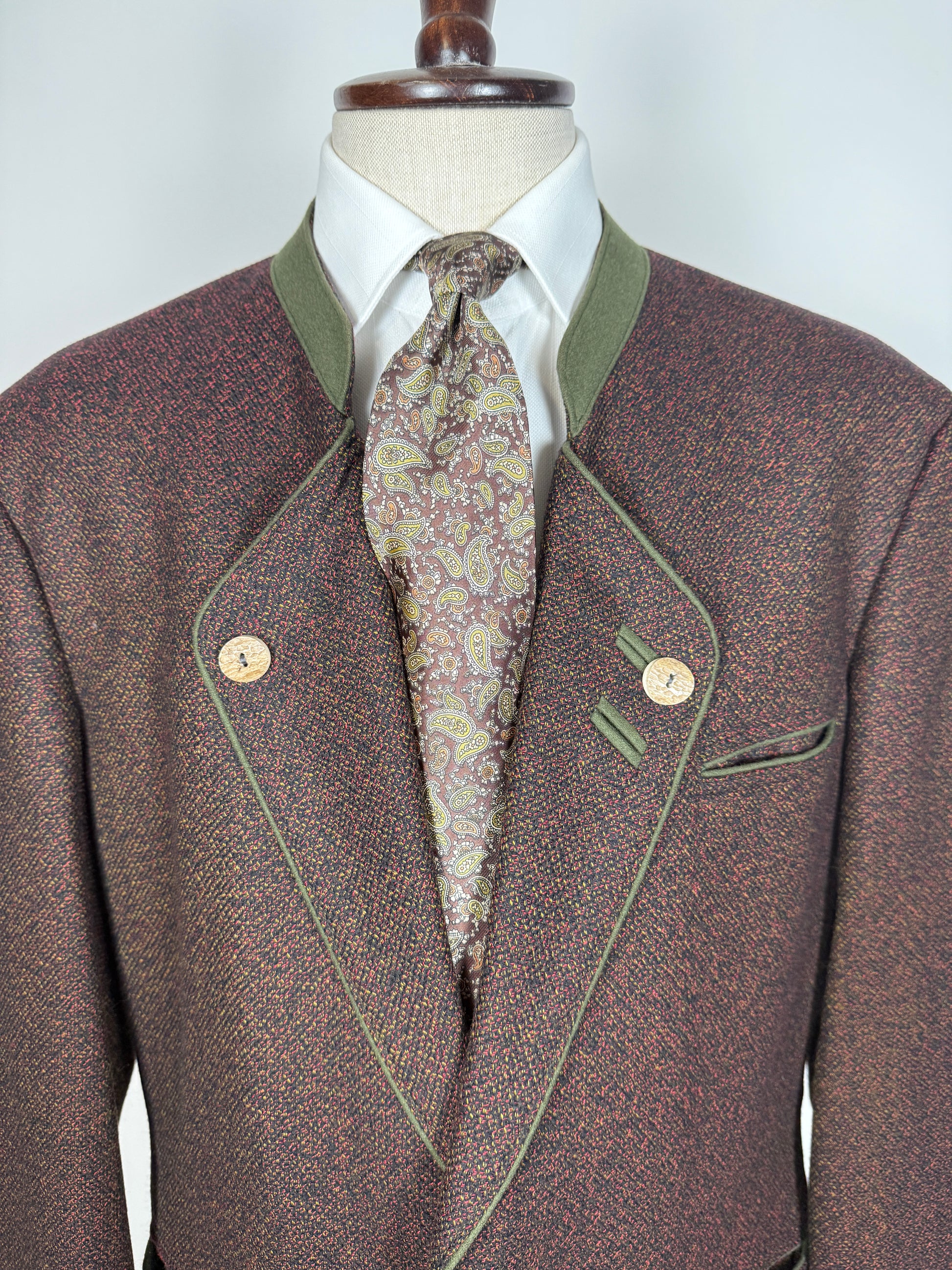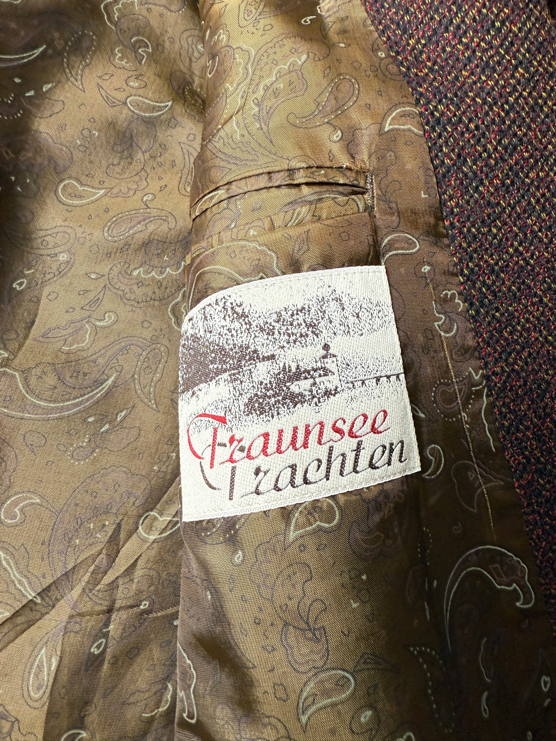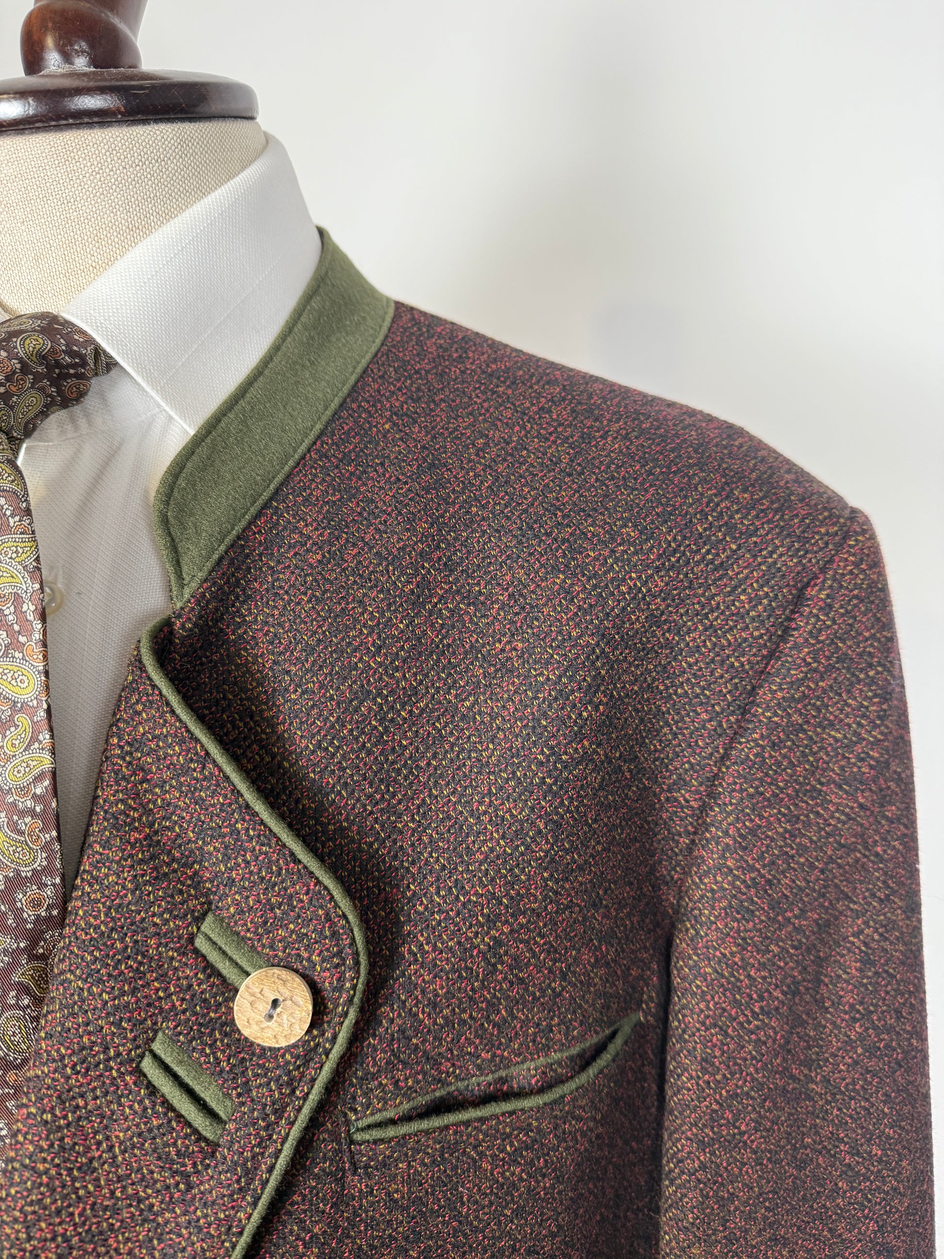 Giacca da tipico Tracht (costume tradizionale) tirolese, in un bel tessuto 90% lana e 10% cashmere colore blu, rosso e giallo in mélange.