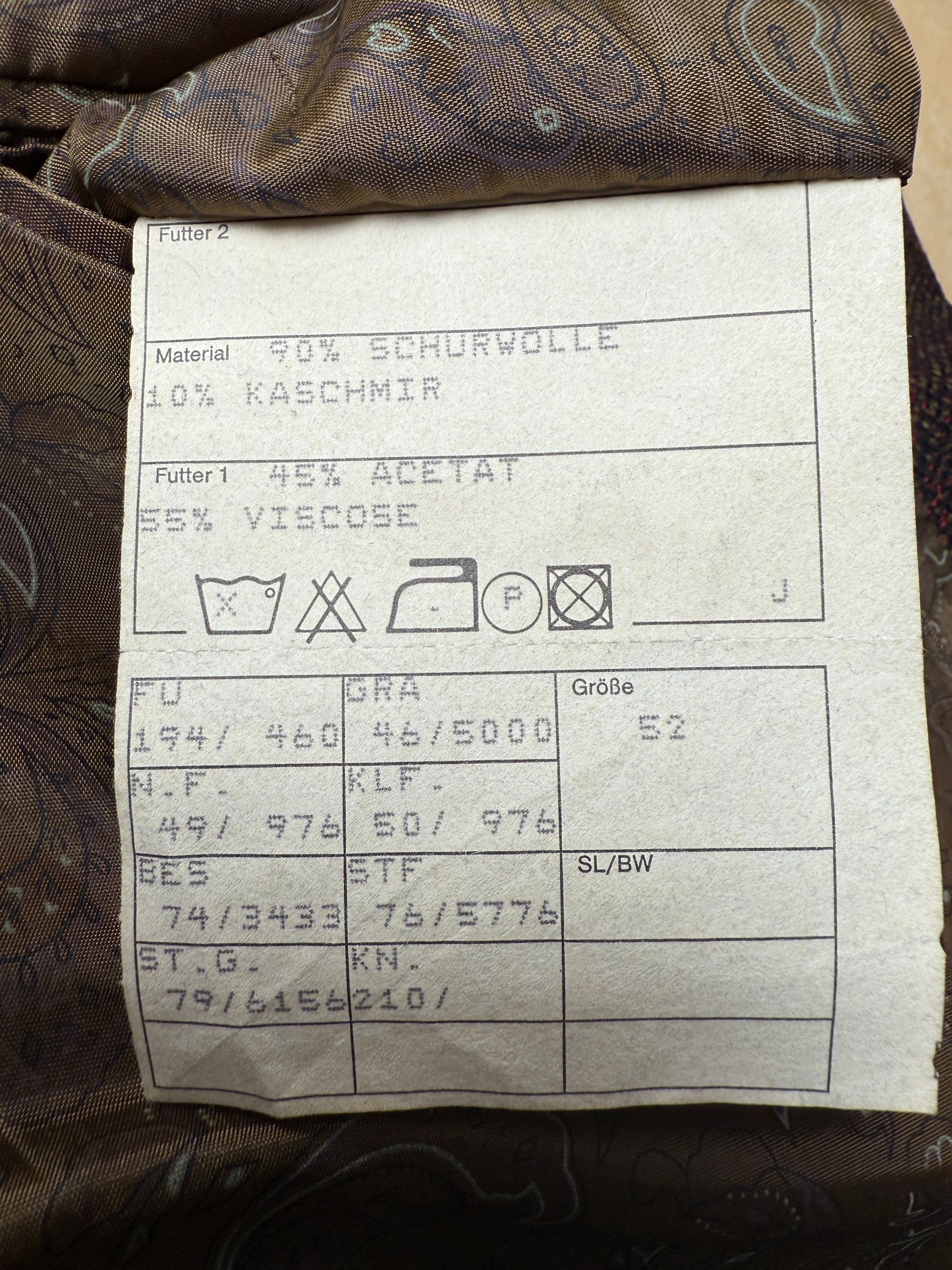Taglia indicata 52, ma veste abbondante, indicativamente una 52/54: vedere le misure in cm complete nell’ultima foto.