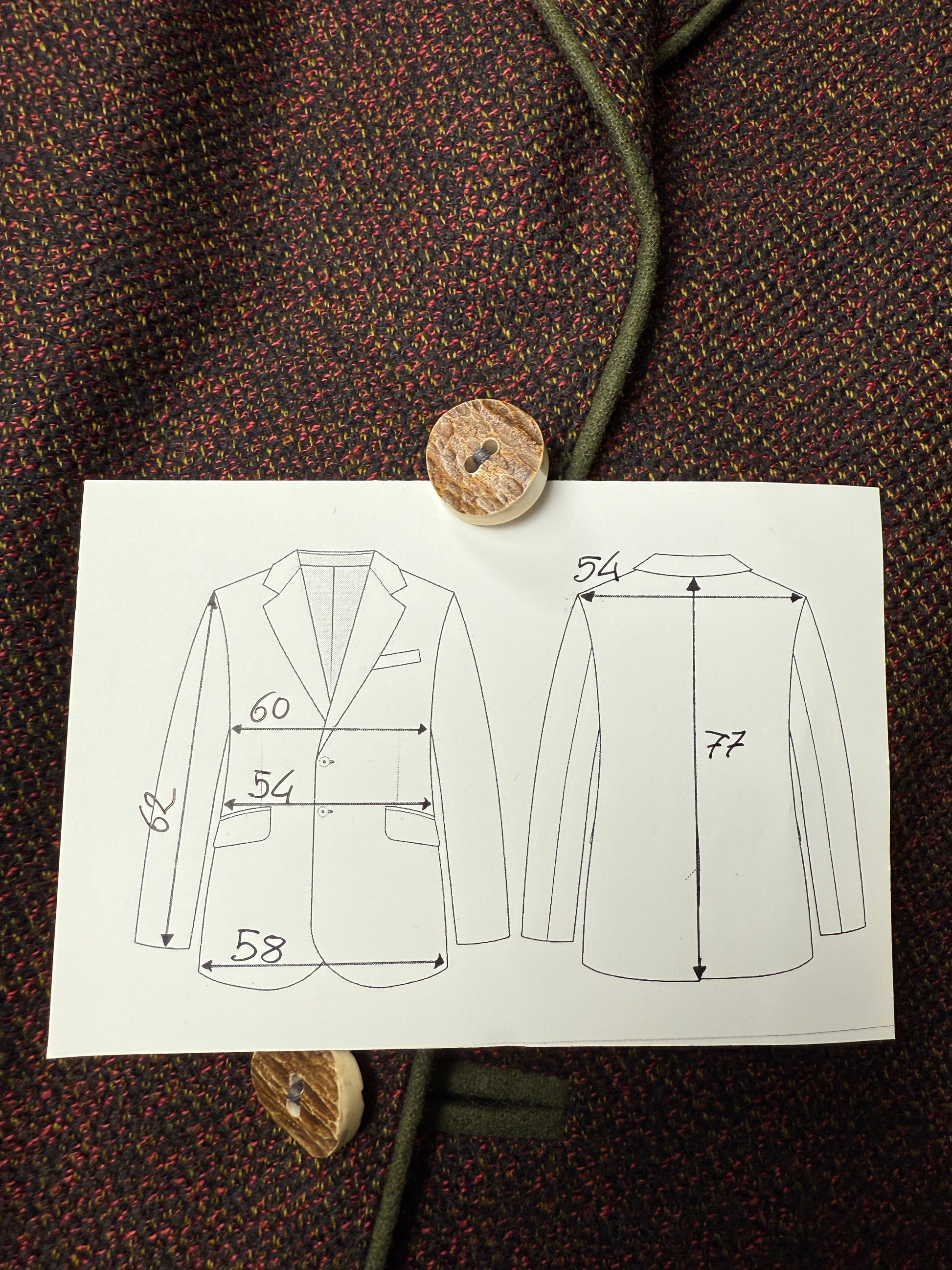 🔎Esempio pratico: la giacca usata come modello in questa guida (v. foto) ha una misura torace di 54 cm. Si tratta della giacca di un abito anni '90 dal taglio generale abbastanza morbido; inoltre, l'abito è un 3 pezzi e va quindi considerato un po' più di margine di vestibilità della giacca per poter indossare comodamente il gilet. Perciò, come da nostra prassi enunciata sopra consideriamo un margine di vestibilità di 6-7 cm: la taglia della giacca sarà quindi 54-6 o 7 = 47 o 48, che corrisponde a una tg. 46/48.
