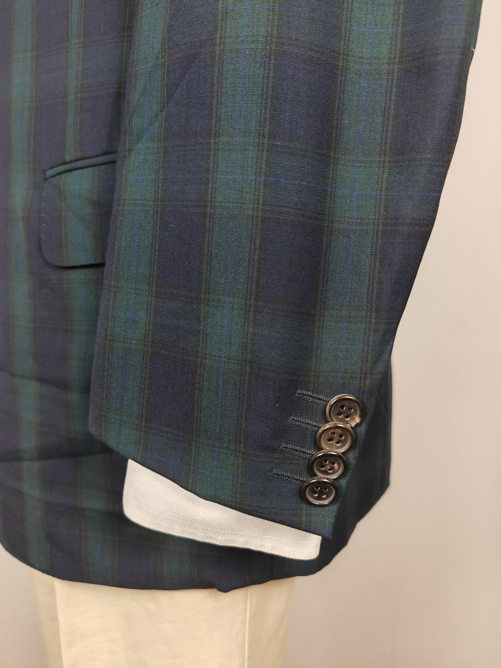 Stupenda giacca/blazer estiva di Ermenegildo Zegna servizio made-to-measure, in leggerissimo fresco lana 100% con motivo tartan verde e blu navy.