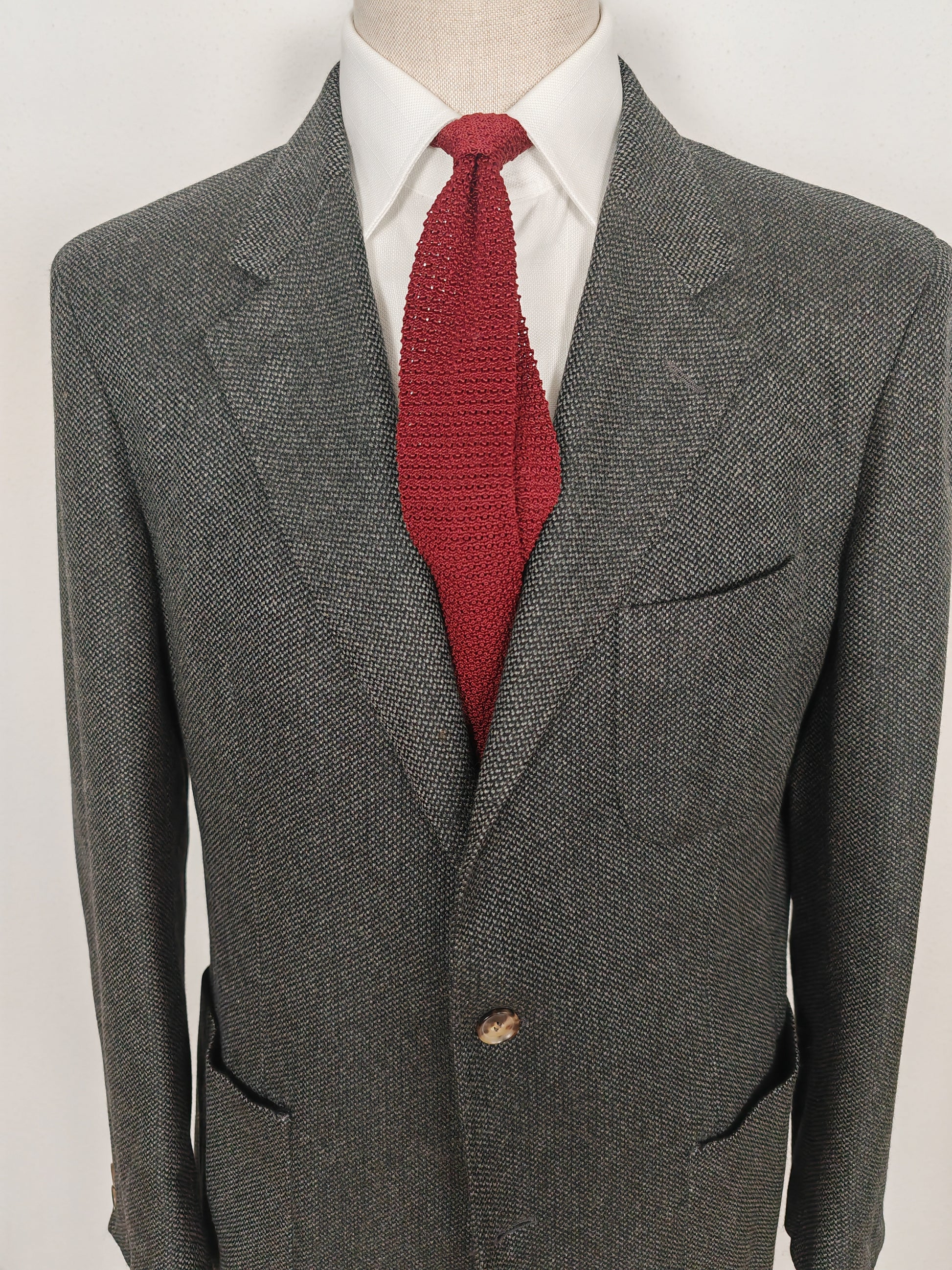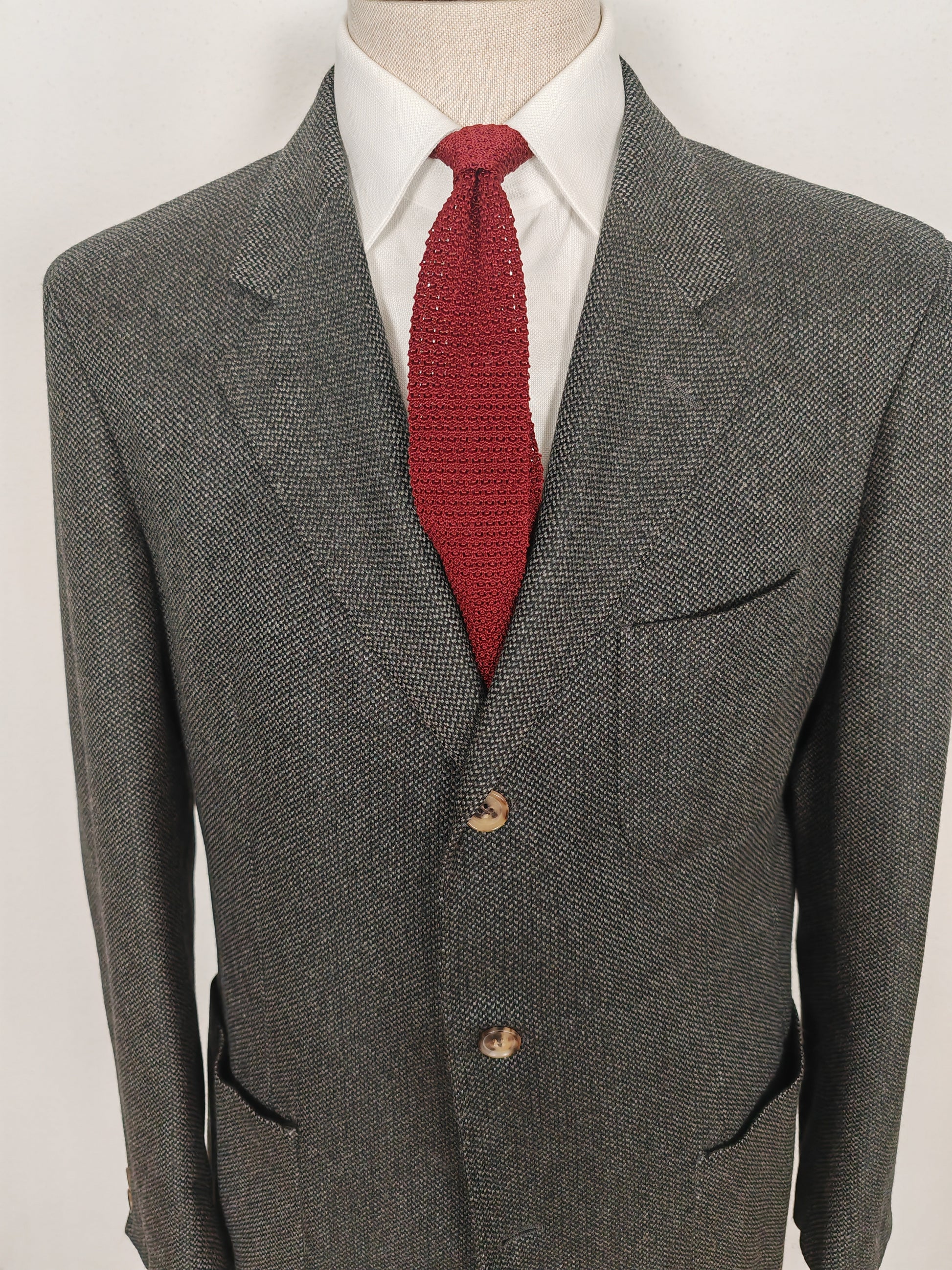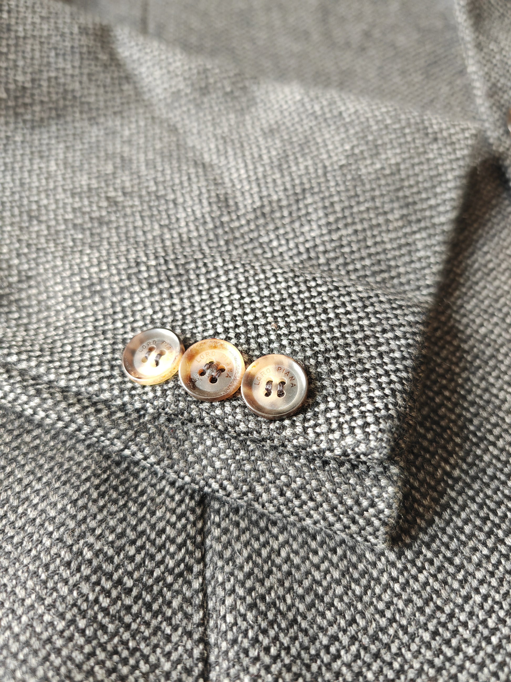 Completely unlined and with a deconstructed and soft fit, un padded shoulders . 3-button cut with soft lapels, patch pockets, double vent. The lapels can be closed completely, with a button behind the right lapel.