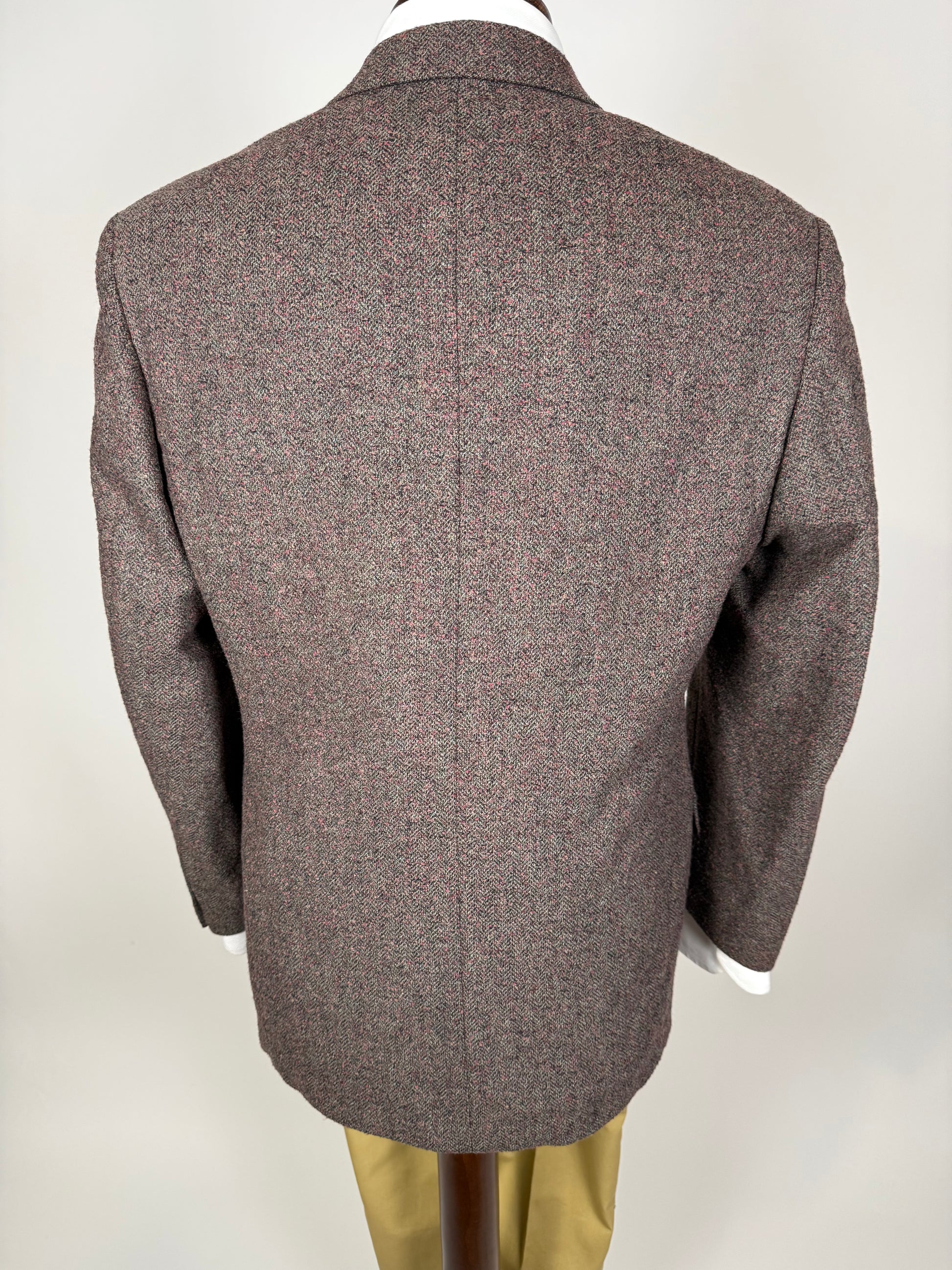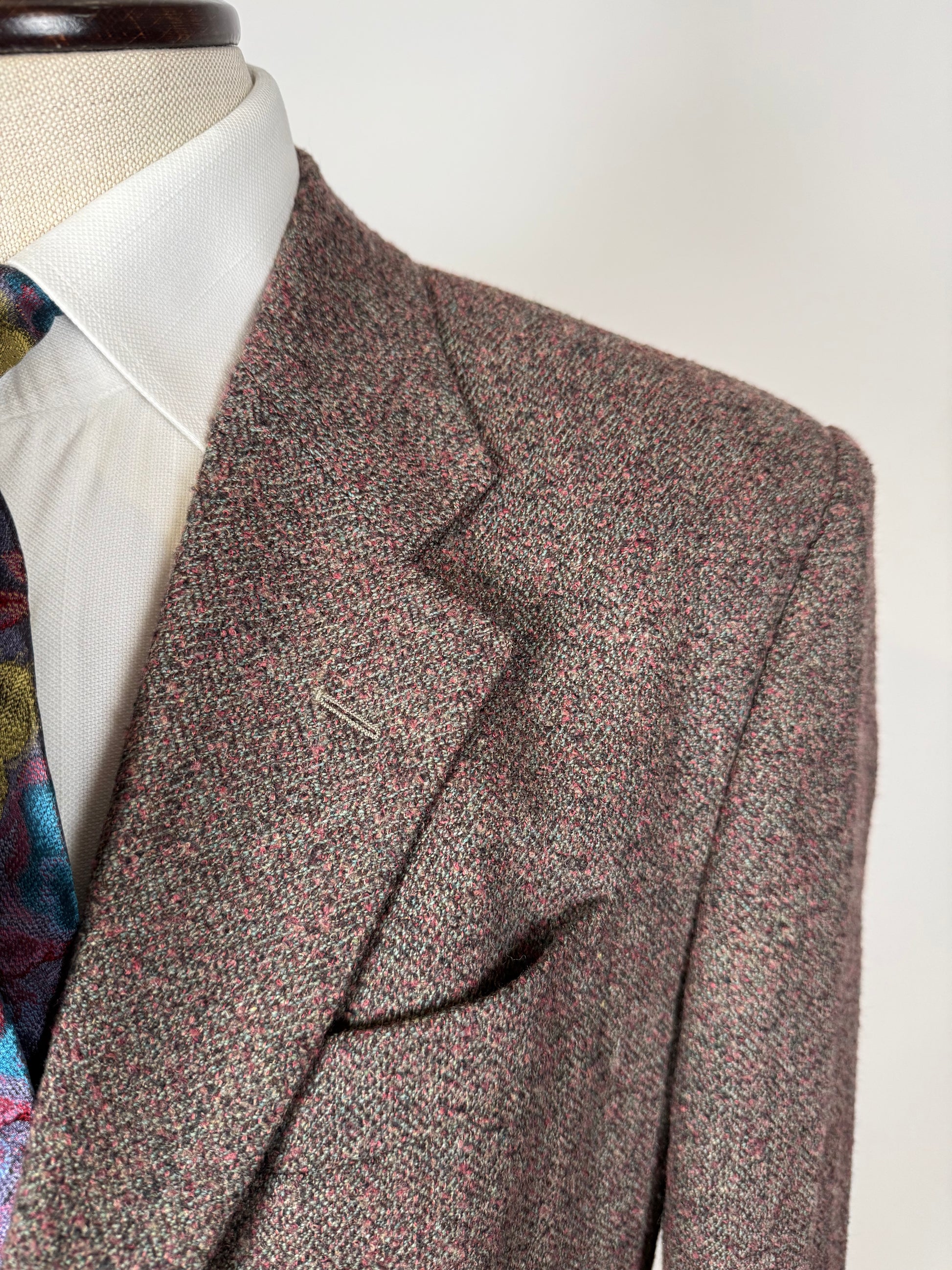 Bellissimo tessuto in tweed bouclé con effetto mélange multicolore, tipico del marchio, sulle tinte accese del rosa/lilla su base marrone-vinaccia. Trama effetto herringbone spigato.