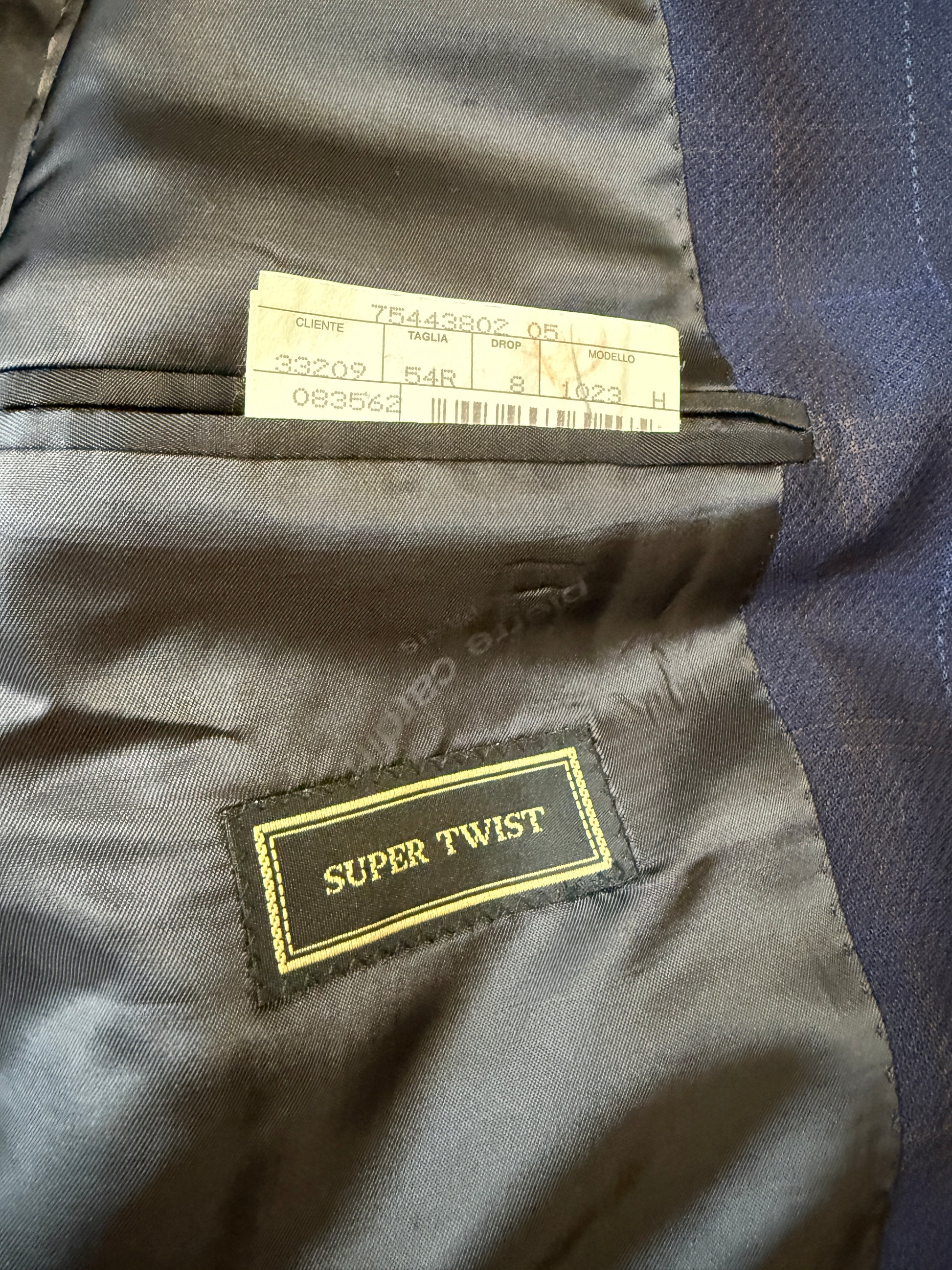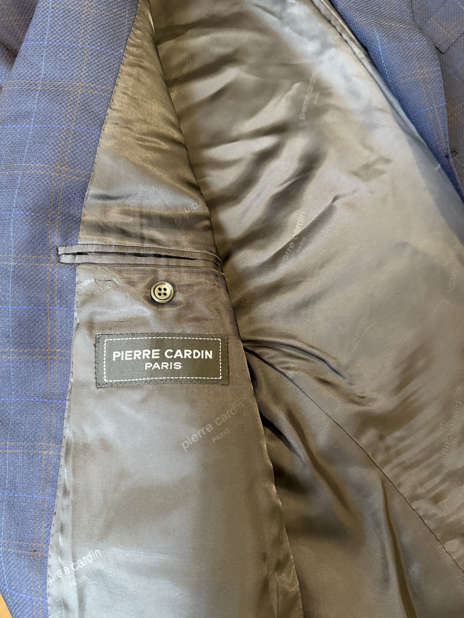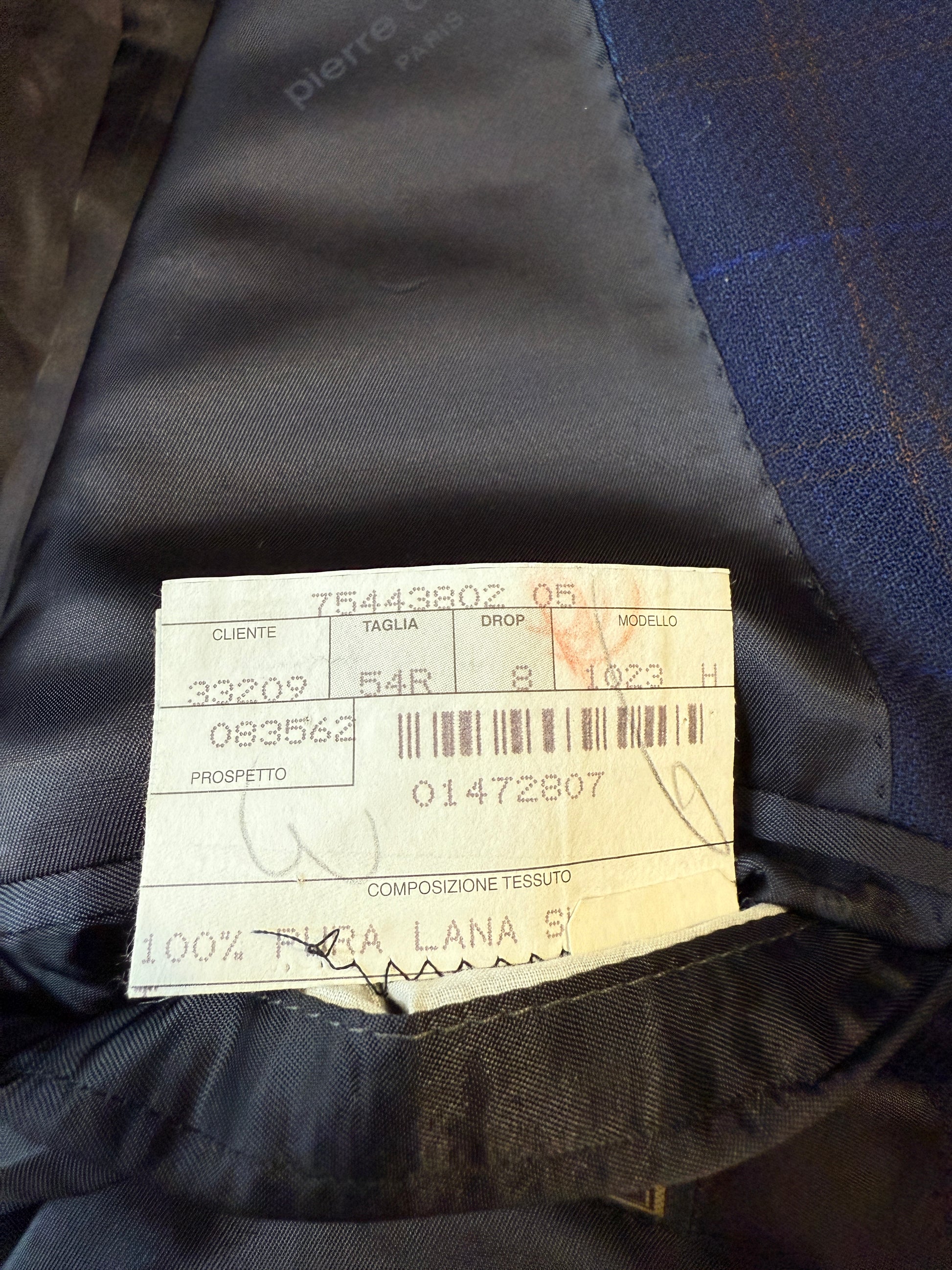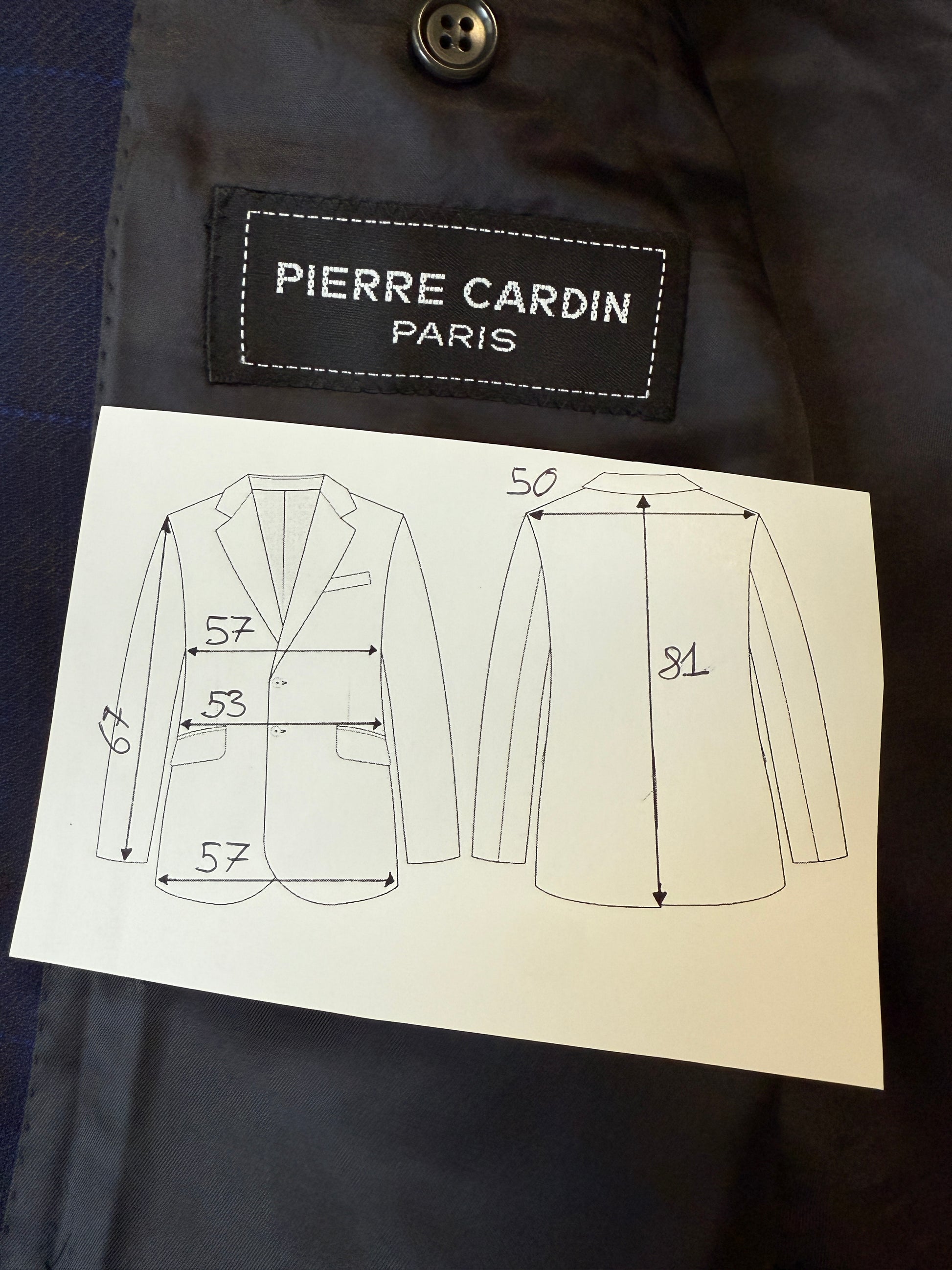 La giacca ha una confezione di livello eccellente, come da prassi di questo marchio, con costruzione completamente intelata (full canvas). Fodera con firme stampate Pierre Cardin.