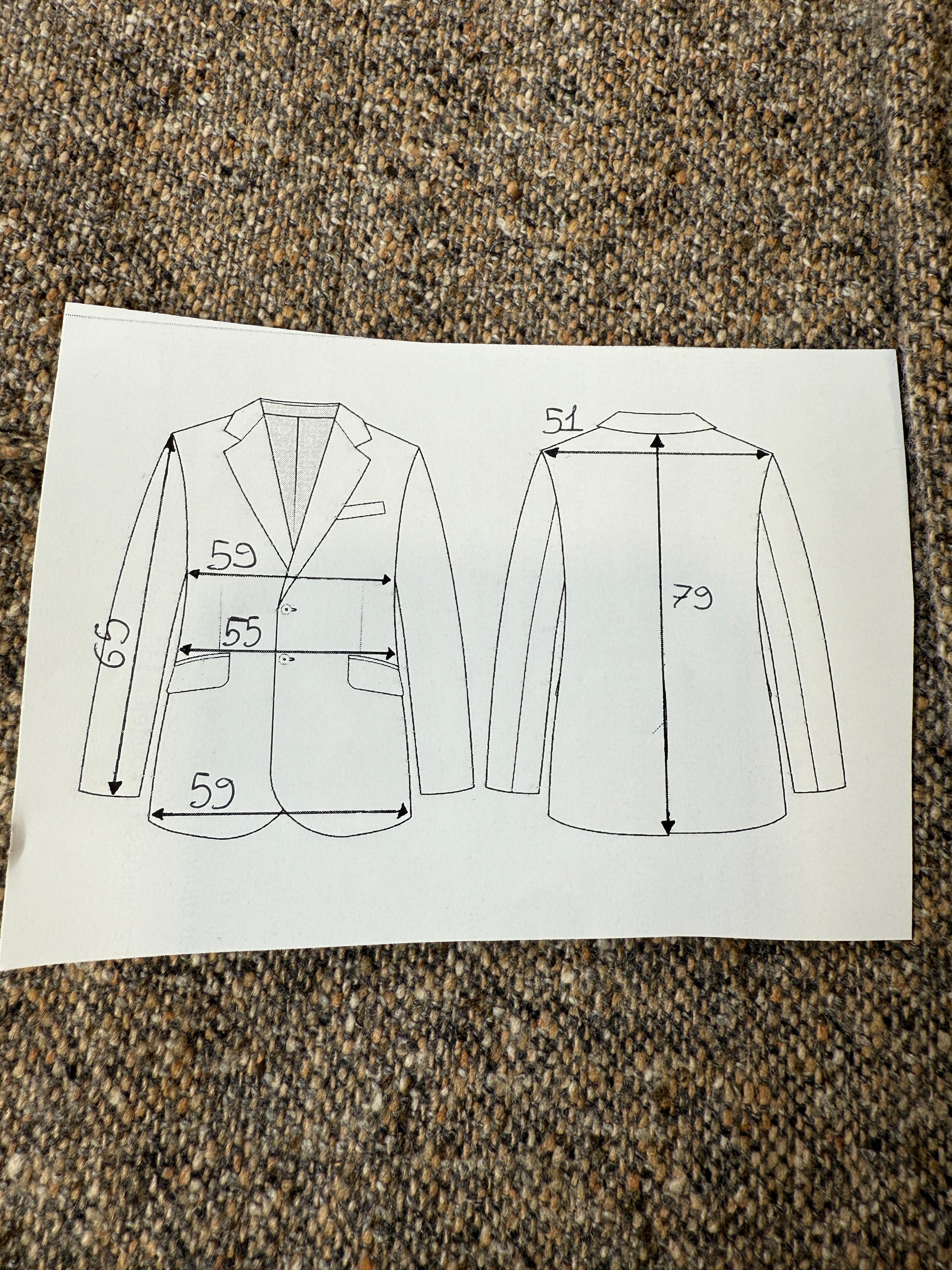 🔎Esempio pratico: la giacca usata come modello in questa guida (v. foto) ha una misura torace di 54 cm. Si tratta della giacca di un abito anni '90 dal taglio generale abbastanza morbido; inoltre, l'abito è un 3 pezzi e va quindi considerato un po' più di margine di vestibilità della giacca per poter indossare comodamente il gilet. Perciò, come da nostra prassi enunciata sopra consideriamo un margine di vestibilità di 6-7 cm: la taglia della giacca sarà quindi 54-6 o 7 = 47 o 48, che corrisponde a una tg. 46/48.