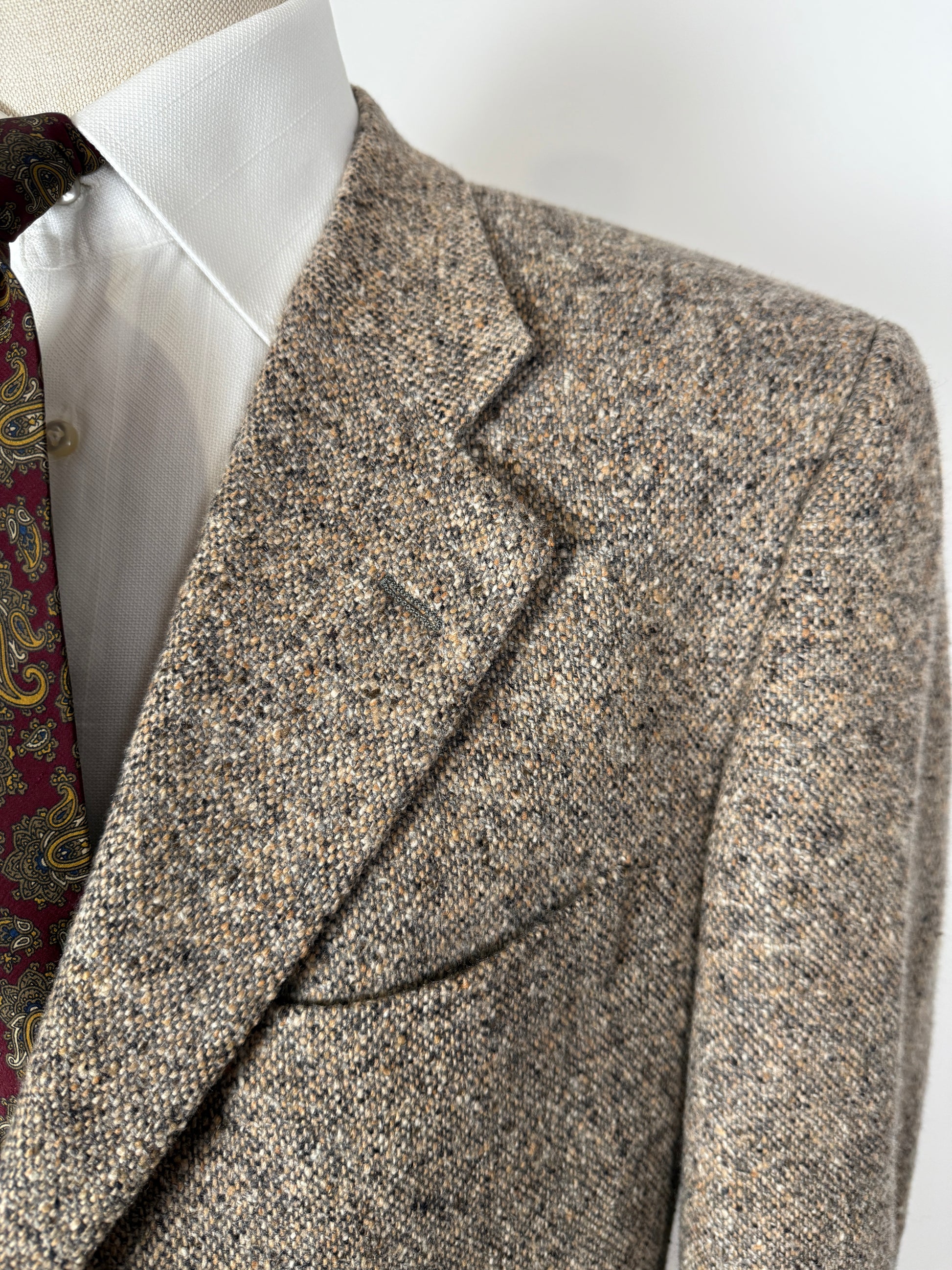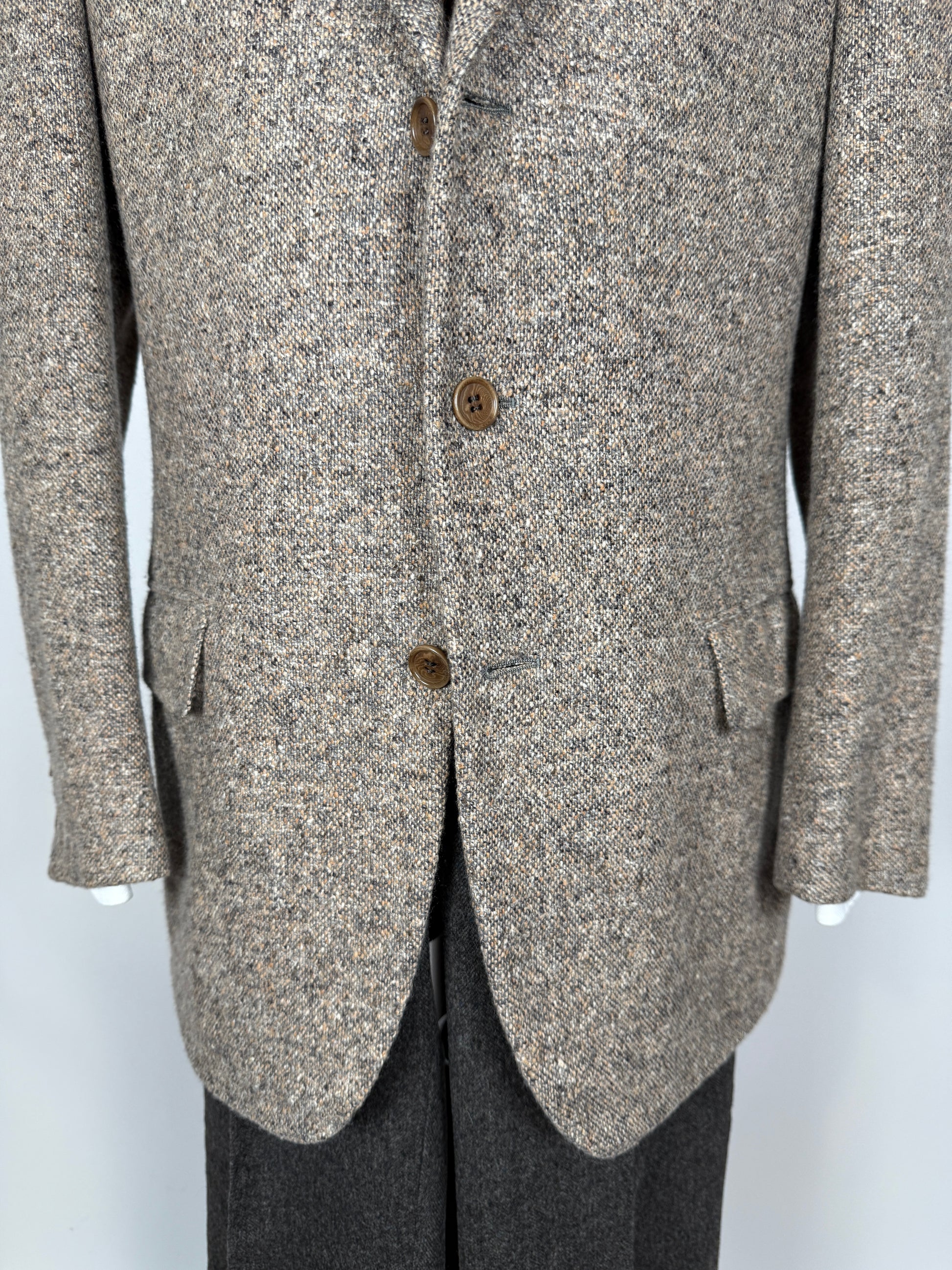 Giacca anni '90 di Postacchini Bologna, confezionata con uno straordinario tessuto in 100% cashmere con effetto donegal bottonato. Colore beige/corda, con puntolini di filato multicolore.