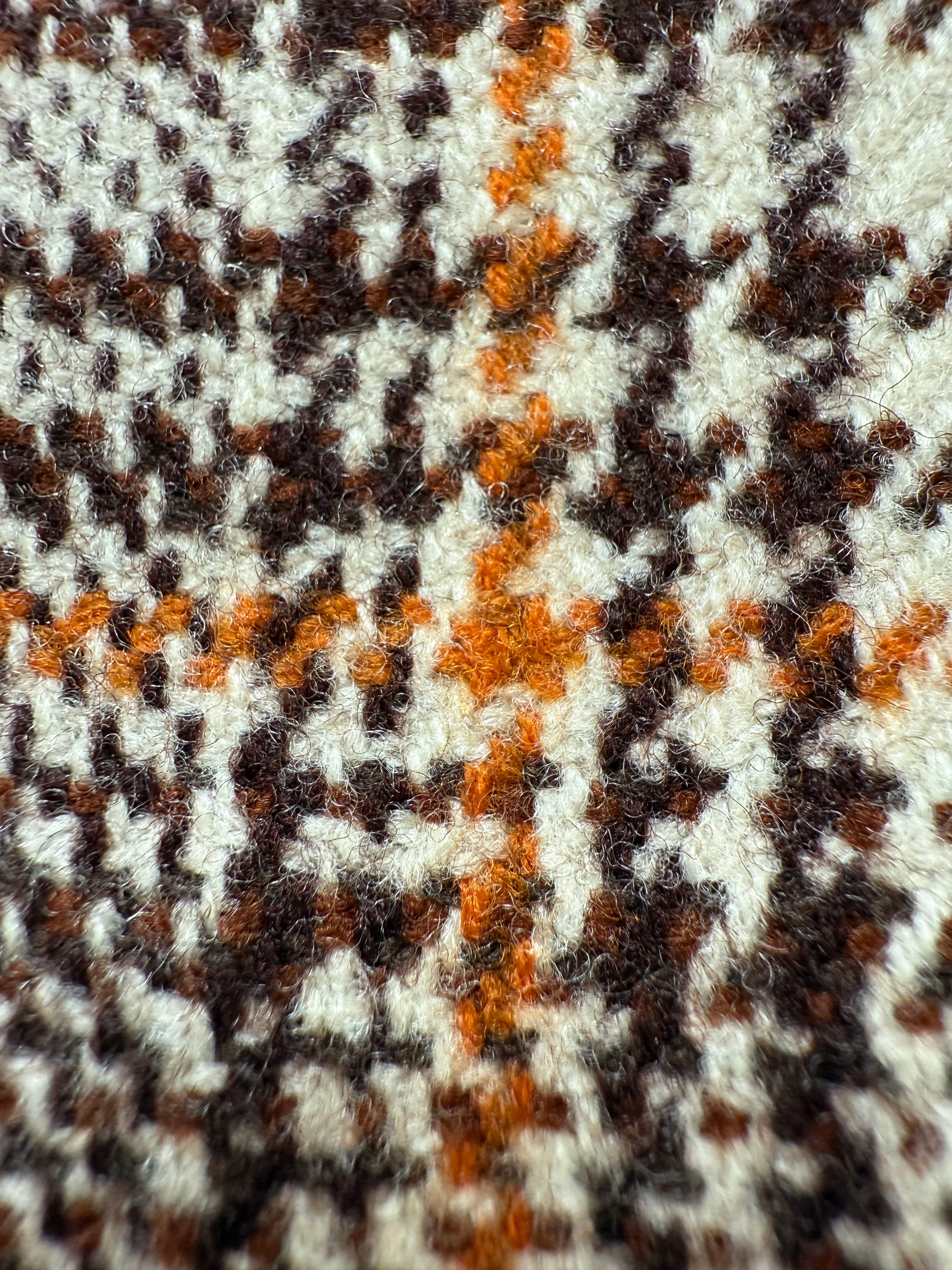 Il tessuto è uno splendido tweed molto pesante, con fantasia principe di Galles in marrone e arancio su fondo panna. L’effetto è un bel marrone tabacco.