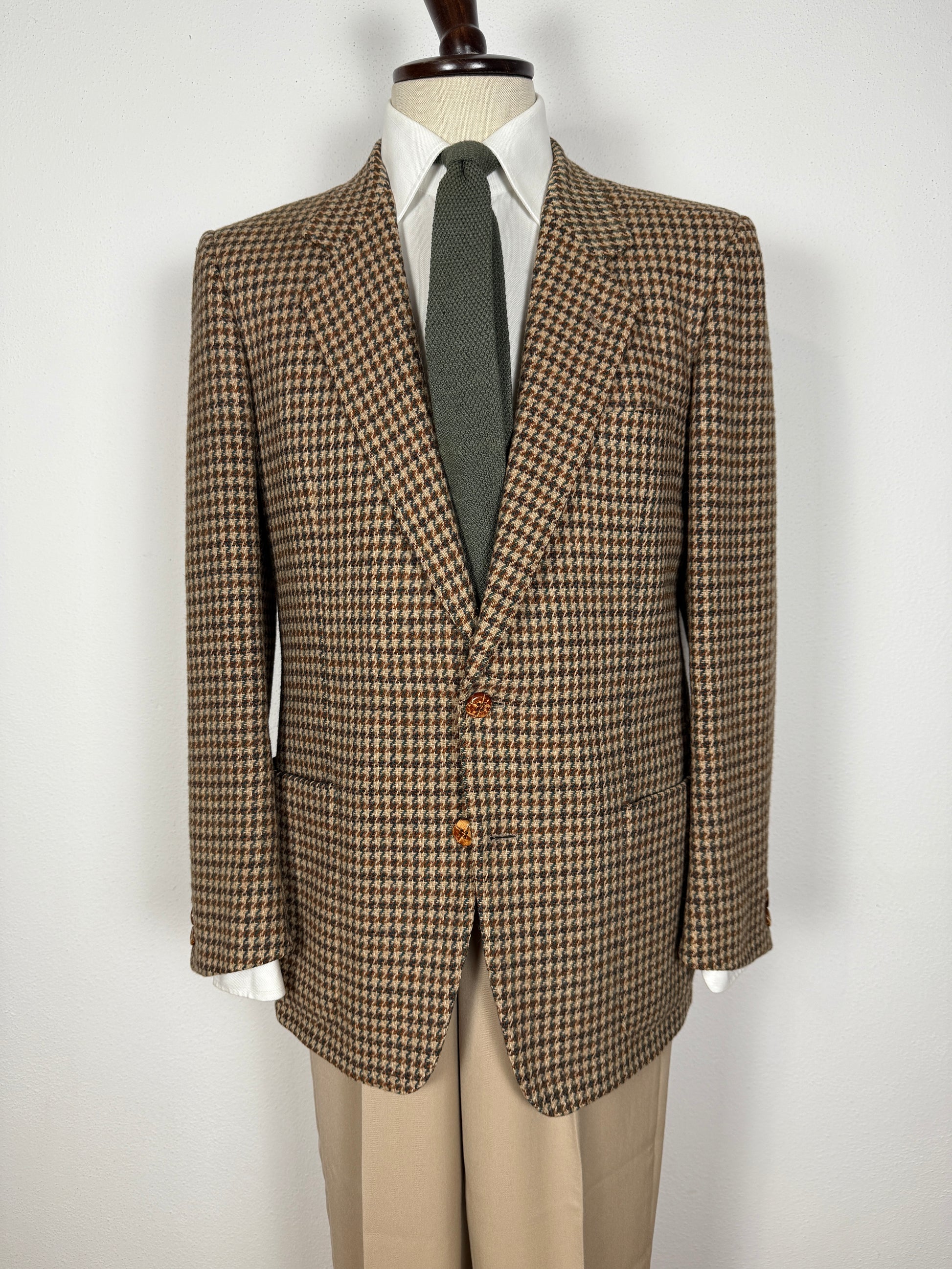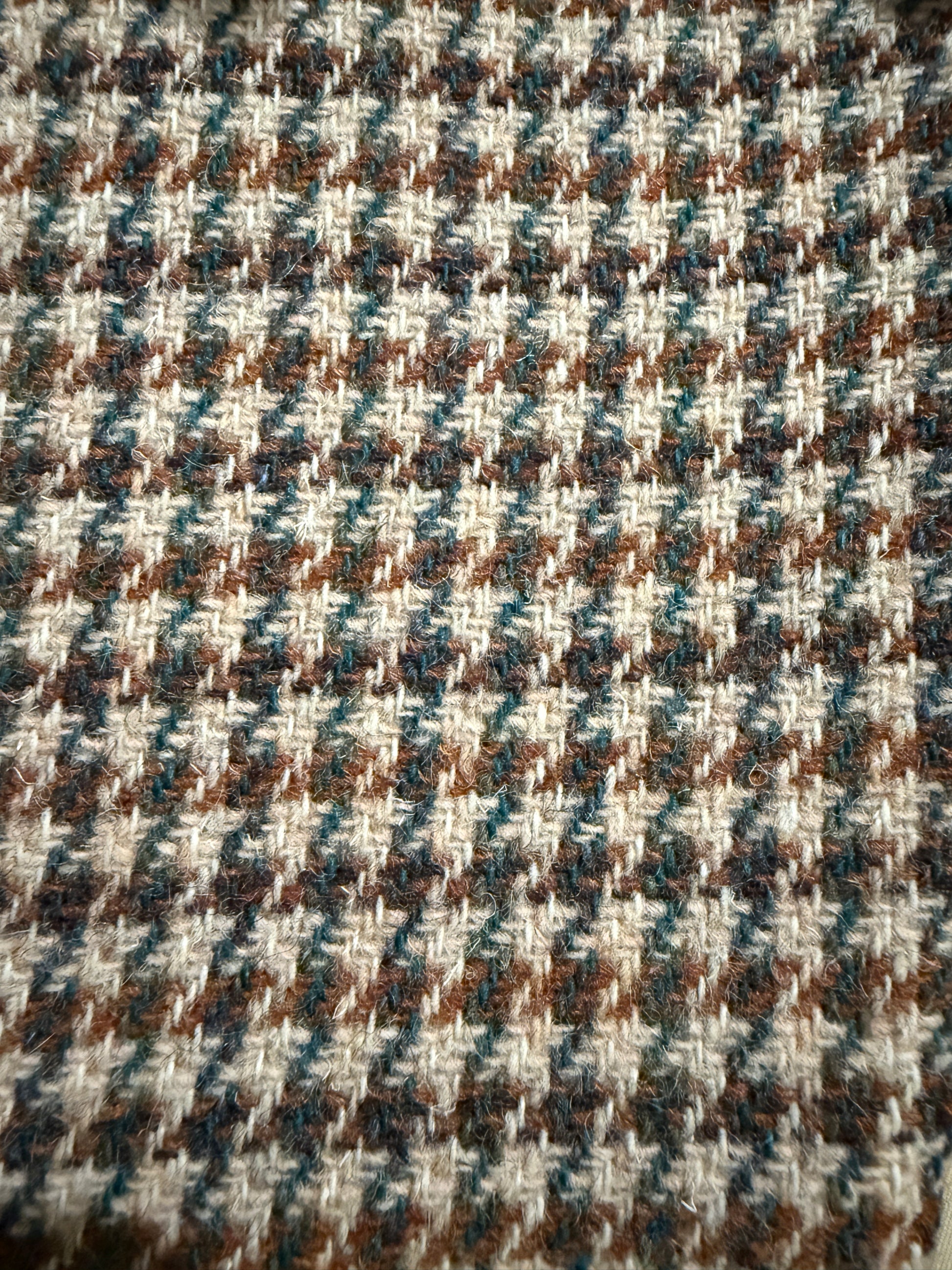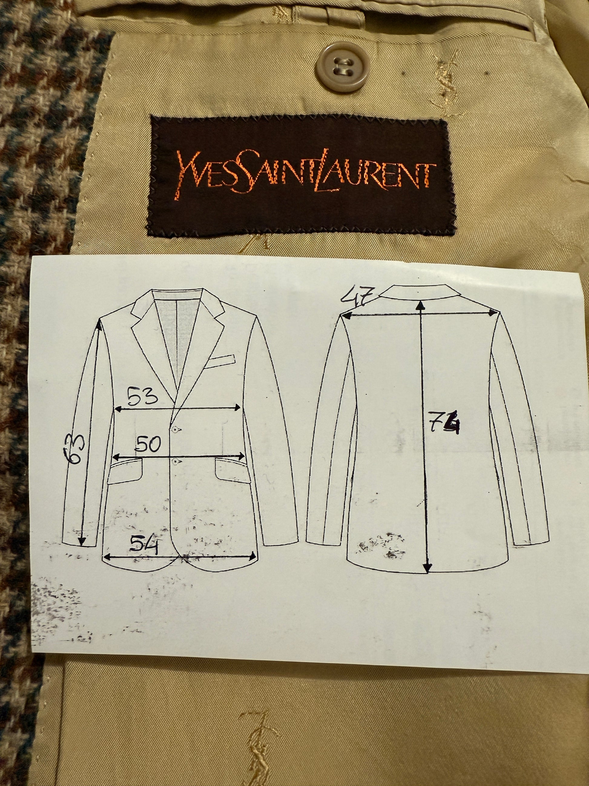 Giacca Yves Saint Laurent anni ‘70 in tweed, tessuto molto cardato e pesante con fantasia pied-de-poule sul verde, ruggine e grigio.