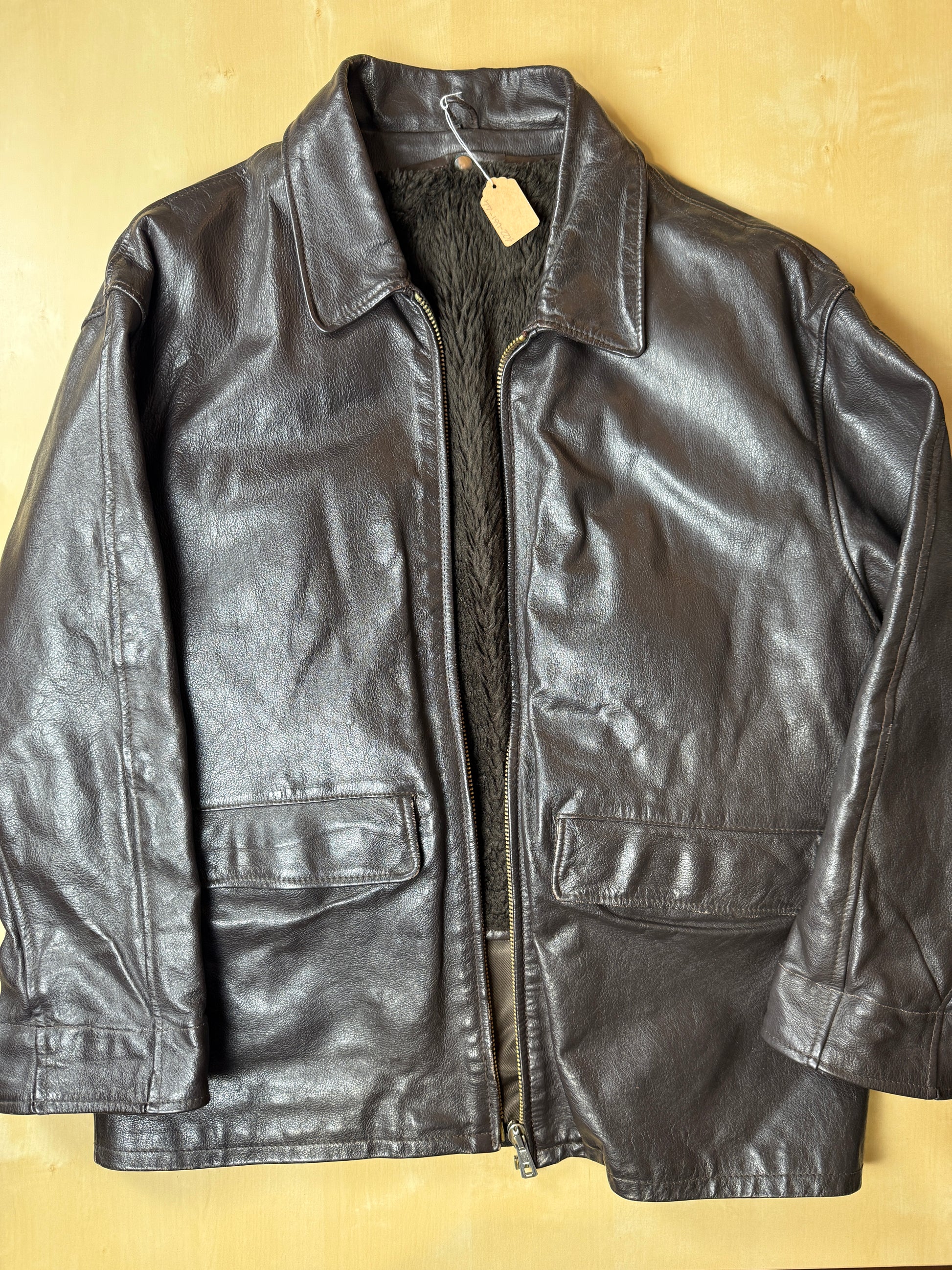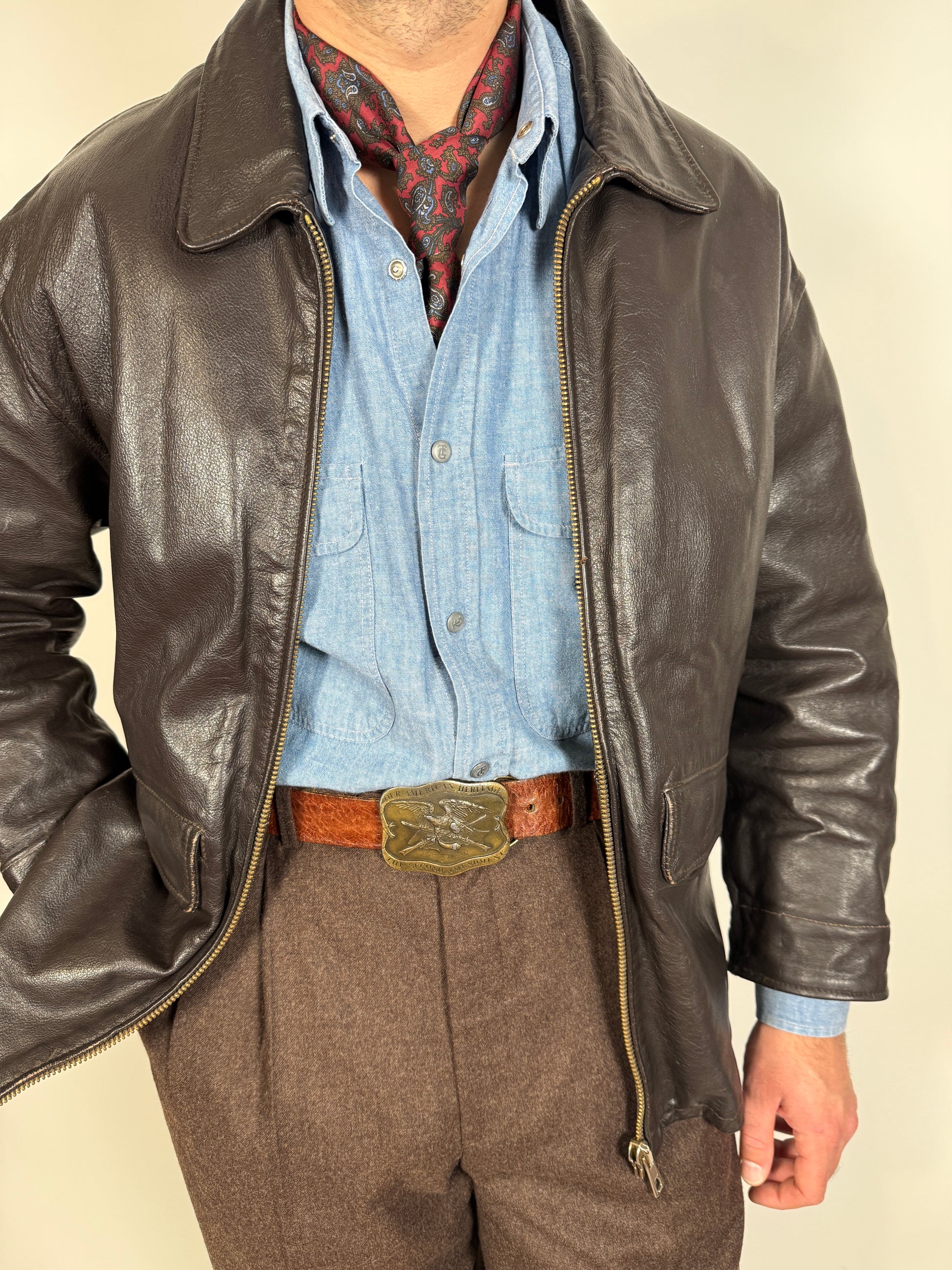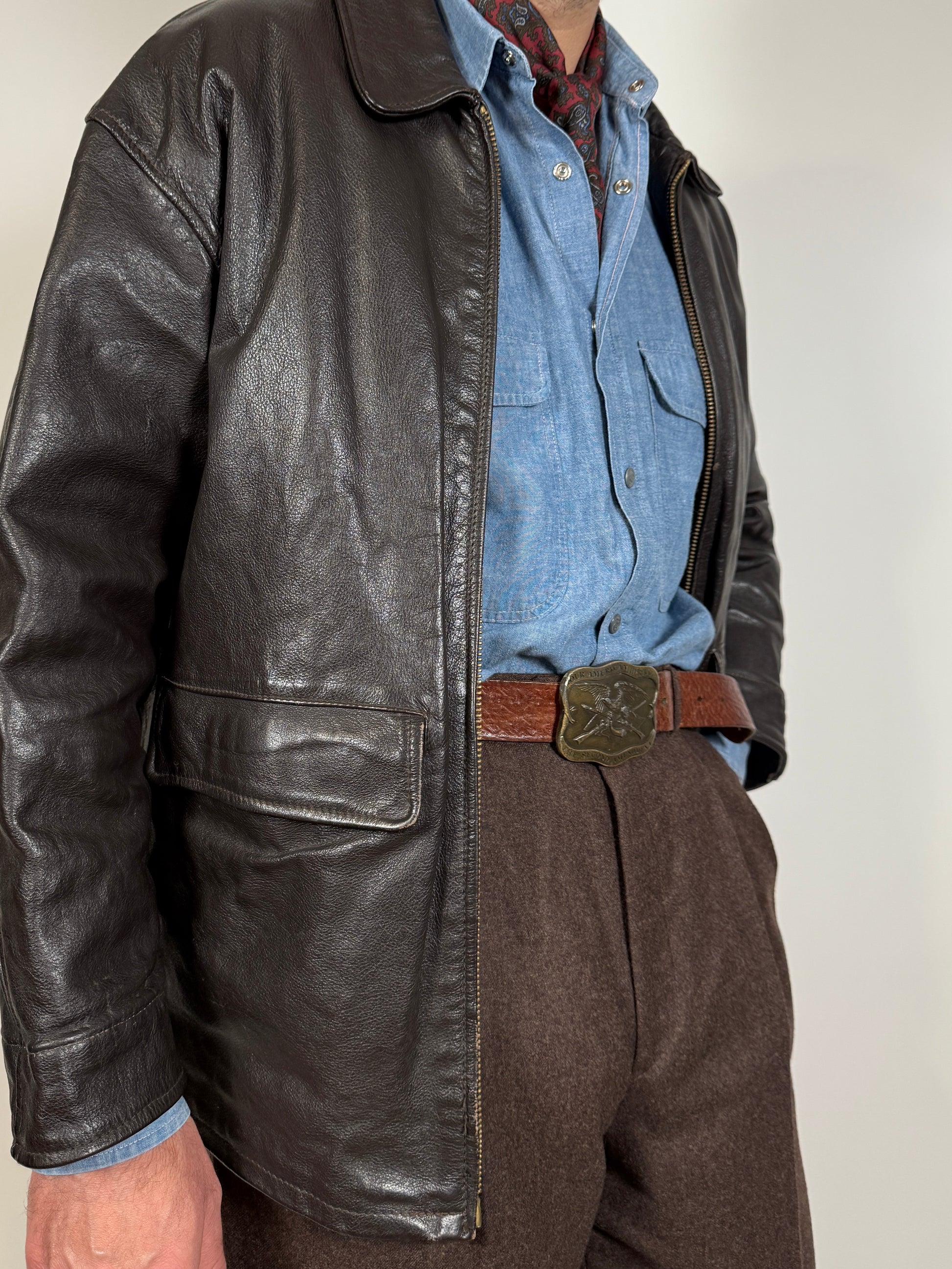 Taglio da giubbotto aviatore, con collo a camicia, lunghezza alla vita, doppia tasca con pattina sul davanti. Il pellame è molto pesante e rigido, nel pieno stile della flying jacket popolare negli anni '80.