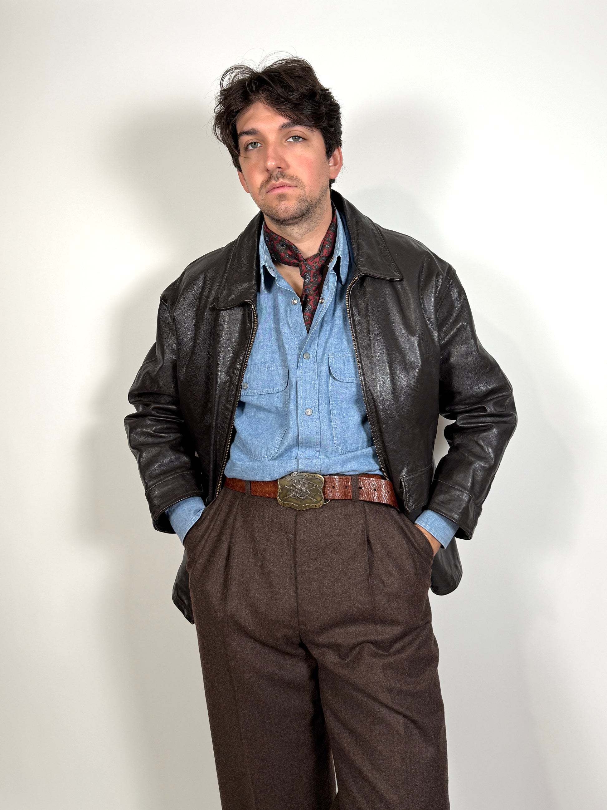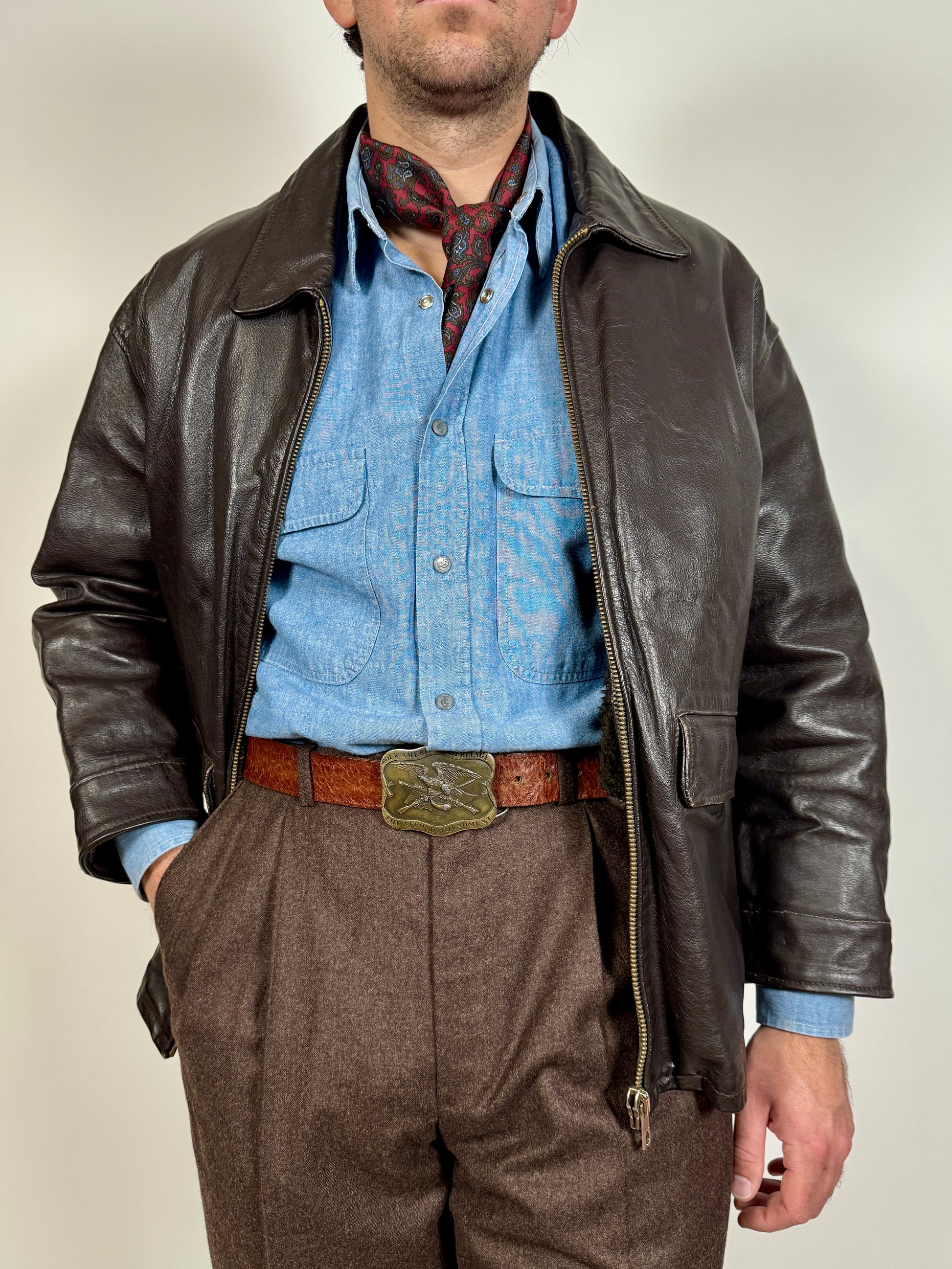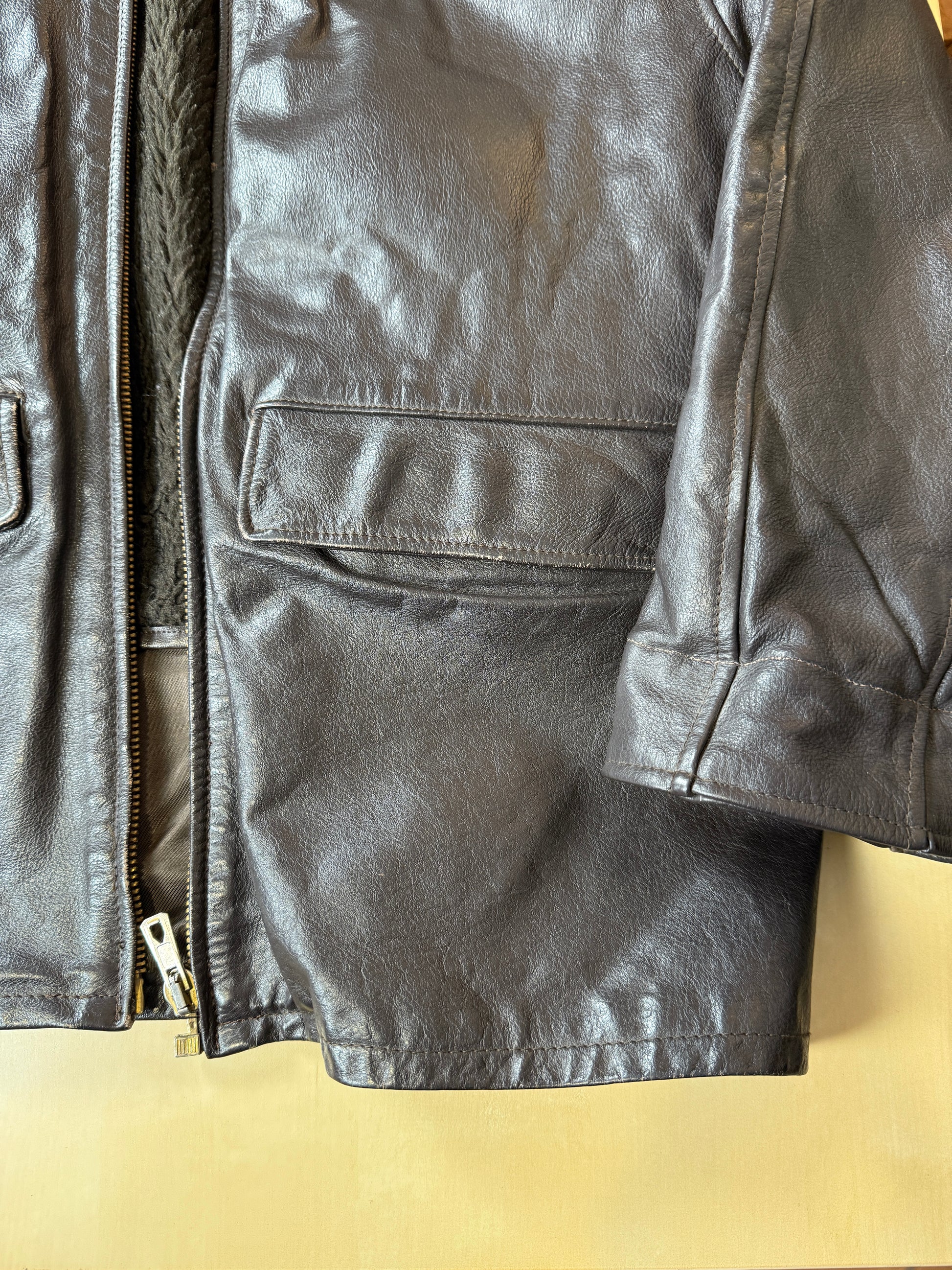 Taglio da giubbotto aviatore, con collo a camicia, lunghezza alla vita, doppia tasca con pattina sul davanti. Il pellame è molto pesante e rigido, nel pieno stile della flying jacket popolare negli anni '80.
