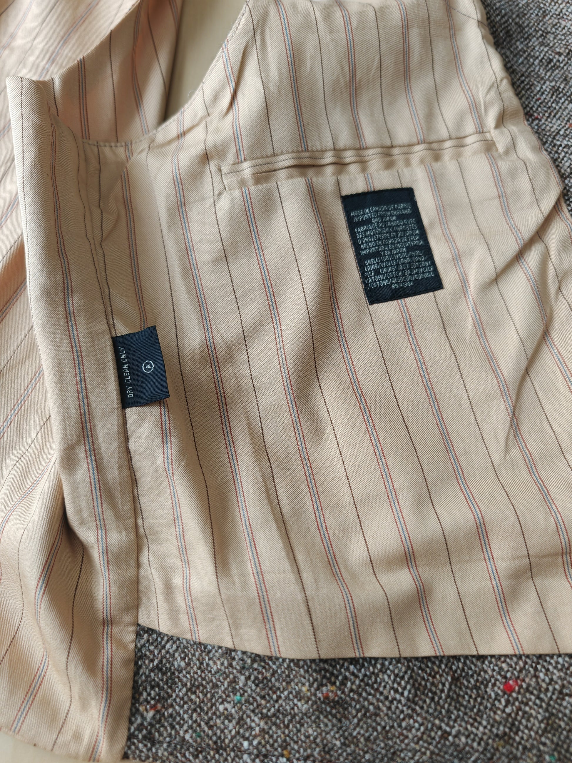 Pezzo di eccezionale fattura, prodotto in Canada. Il tessuto principale è un Donegal tweed con lavorazione bottonata, 100% lana, di produzione britannica, mentre il tessuto della parte posteriore e della fodera è una sorta di rasatello 100% cotone giapponese.
