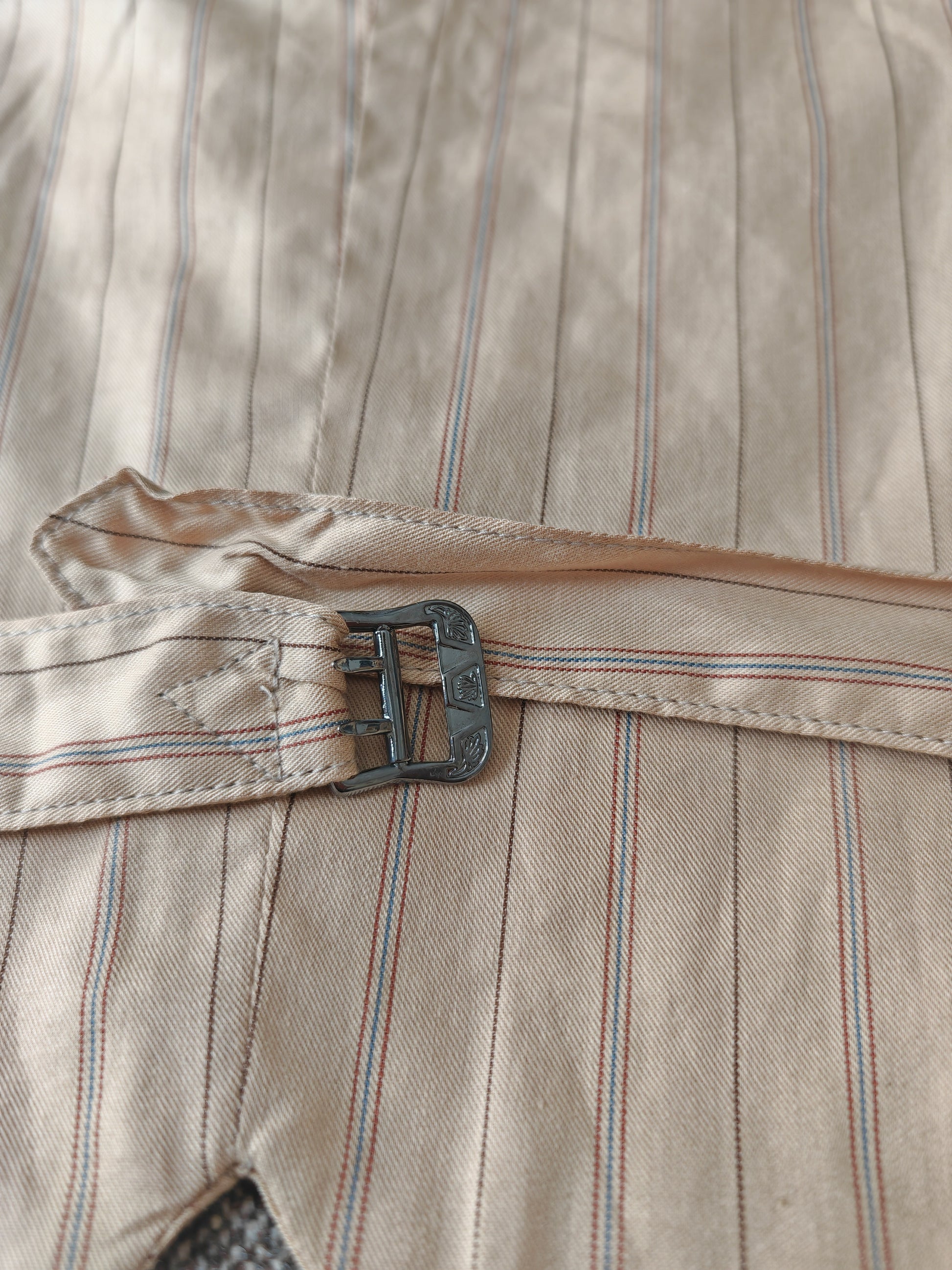 Taglio in pieno stile western, a 6 bottoni con doppio taschino su entrambi i lati e bel dettaglio dei revers in stile vintage. Cinturino di regolazione posteriore con fibbia cromata.