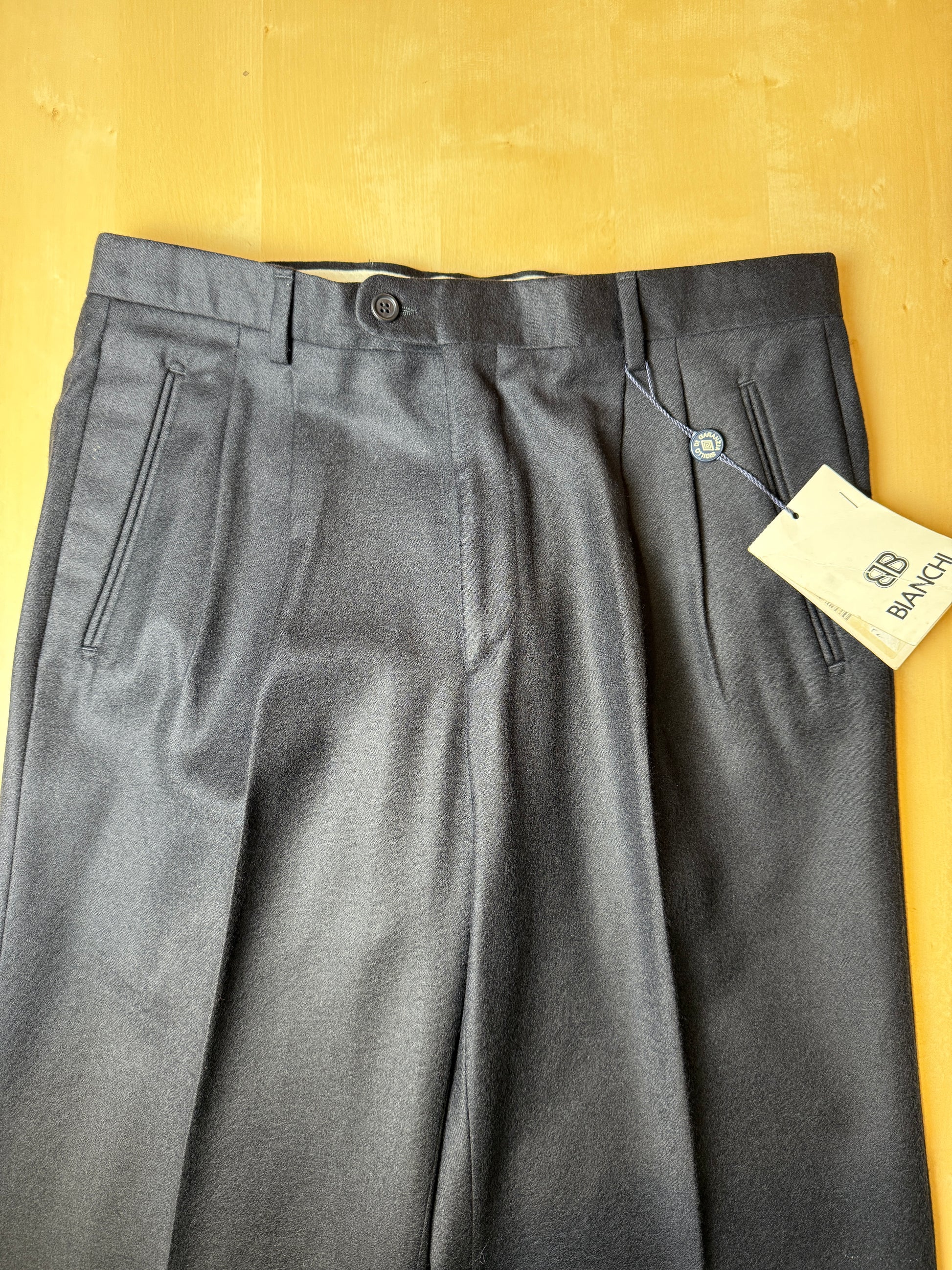 Pantaloni anni ‘80, condizioni di deadstock da fondo di magazzino dell’epoca. Nuovi con cartellino e fondo ancora da orlare.