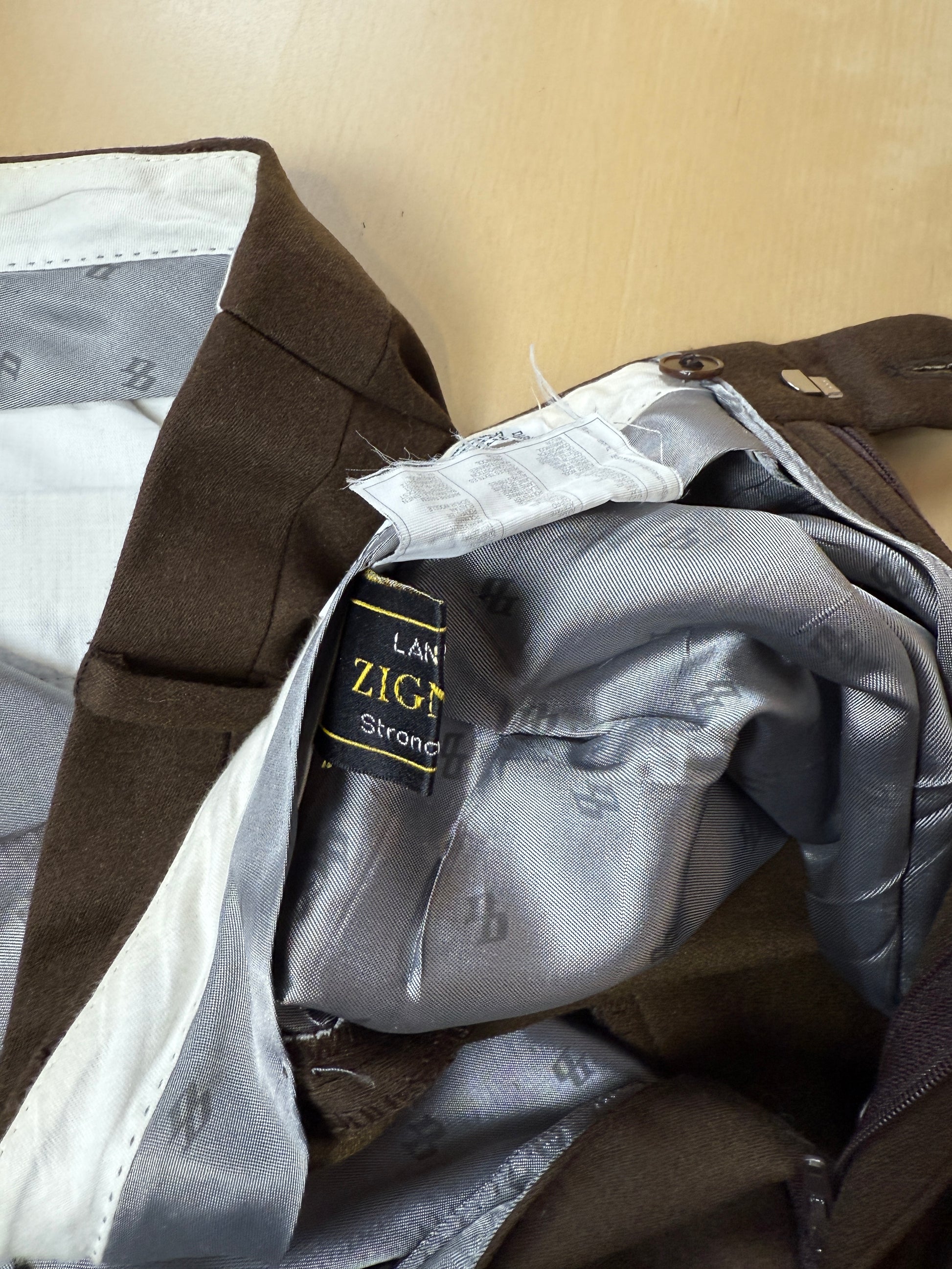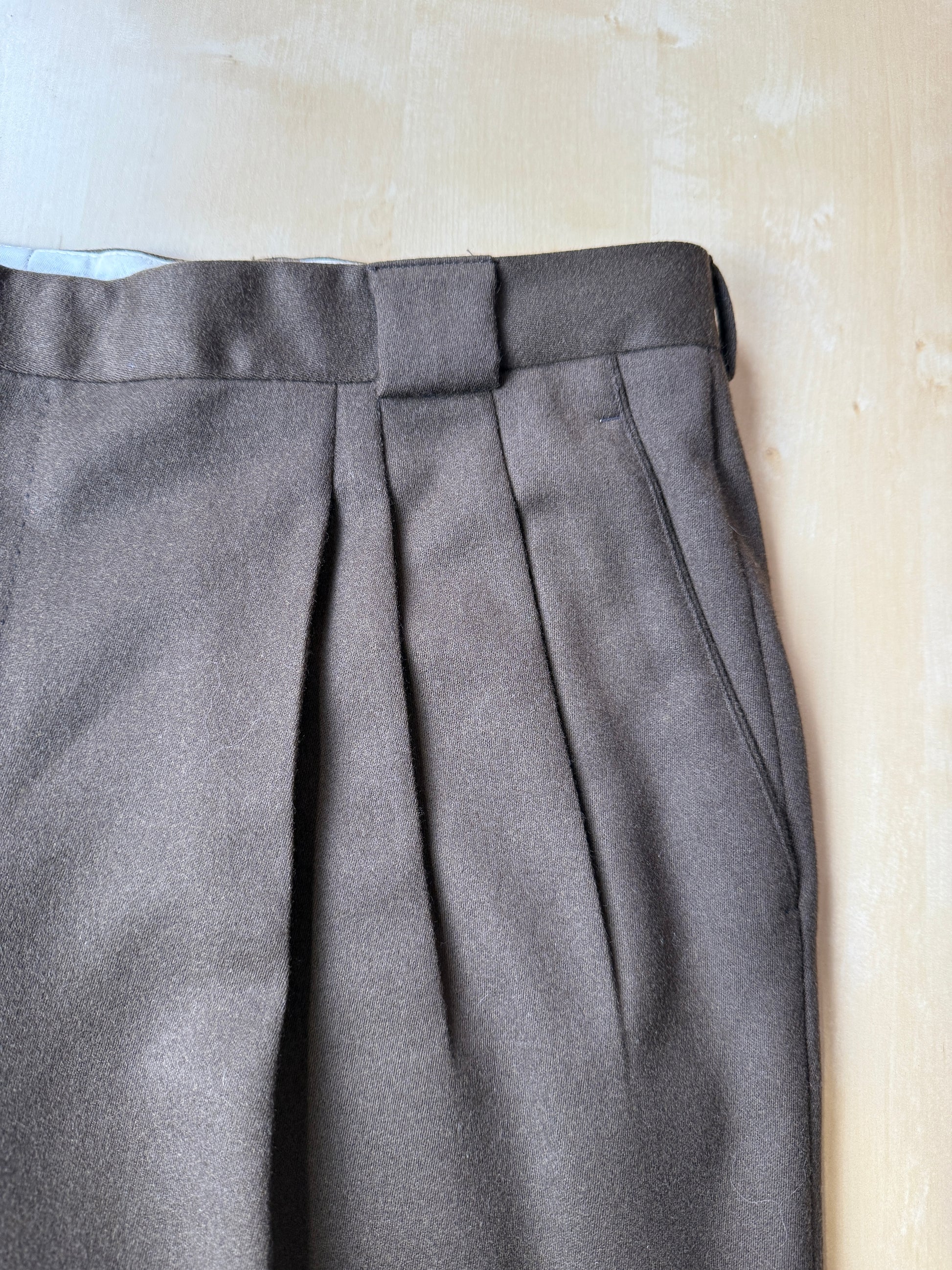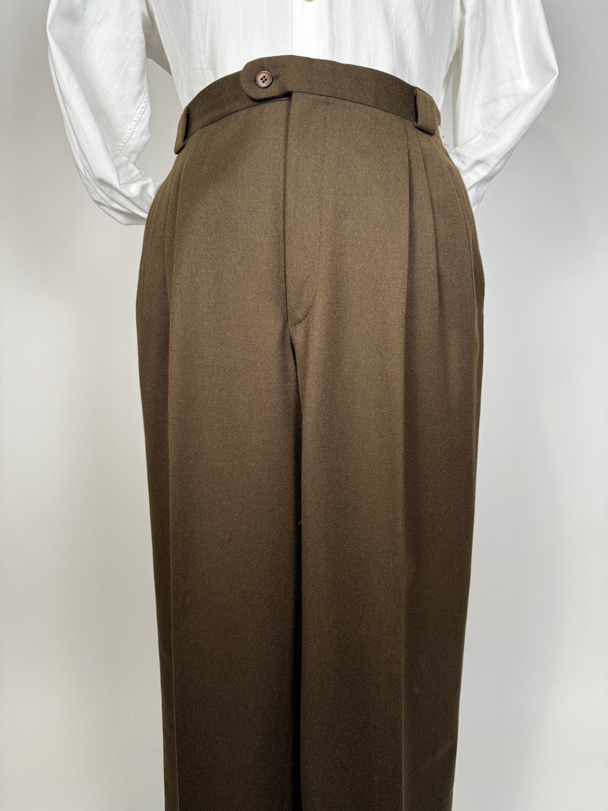 Pantaloni di ottima confezione anni ‘80 in calda flanella 100% lana, colore marrone scuro con sfumature di verdone/cachi.