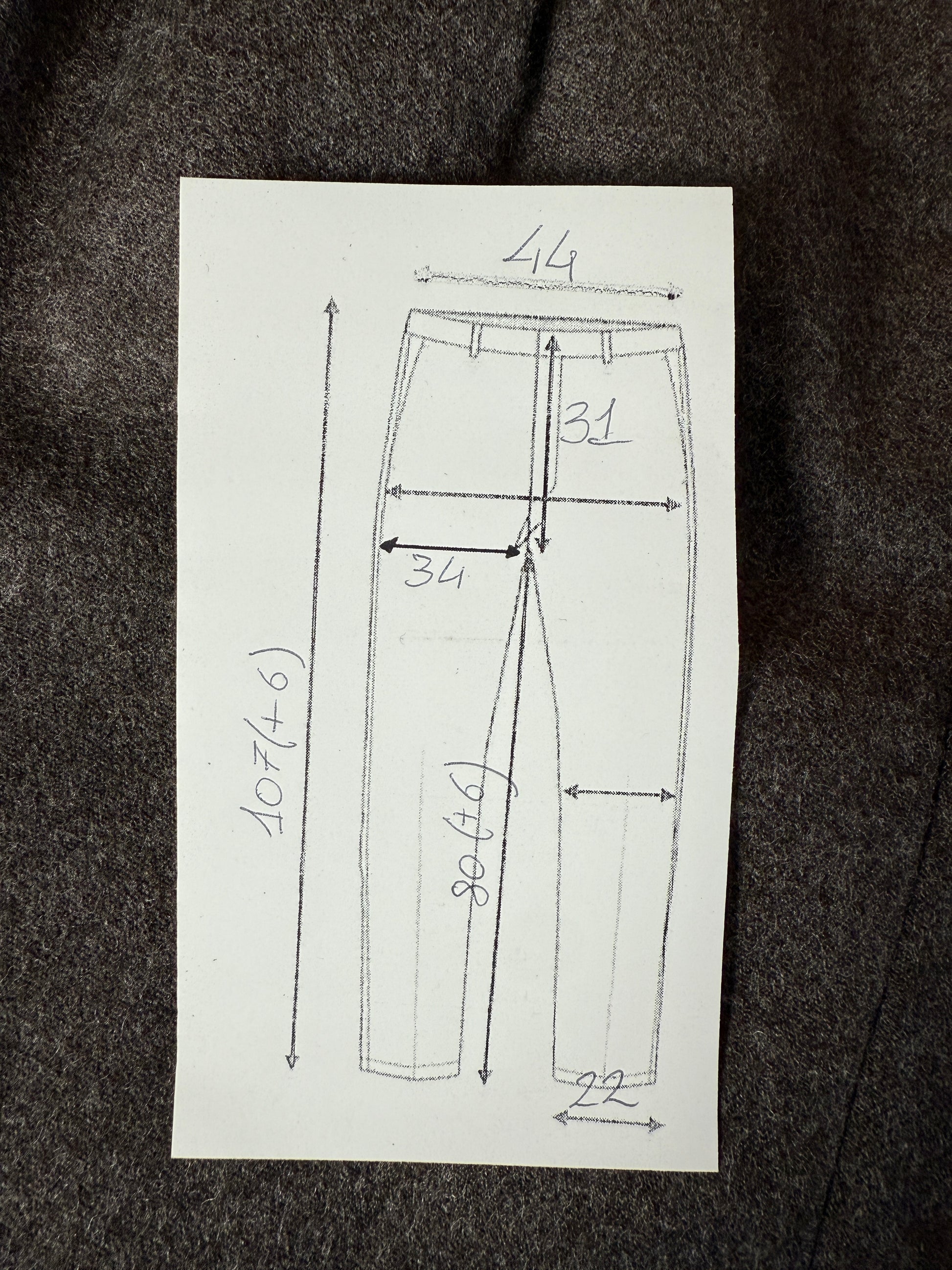 Taglio classico con vita alta, doppie pinces, fondo 22 cm.