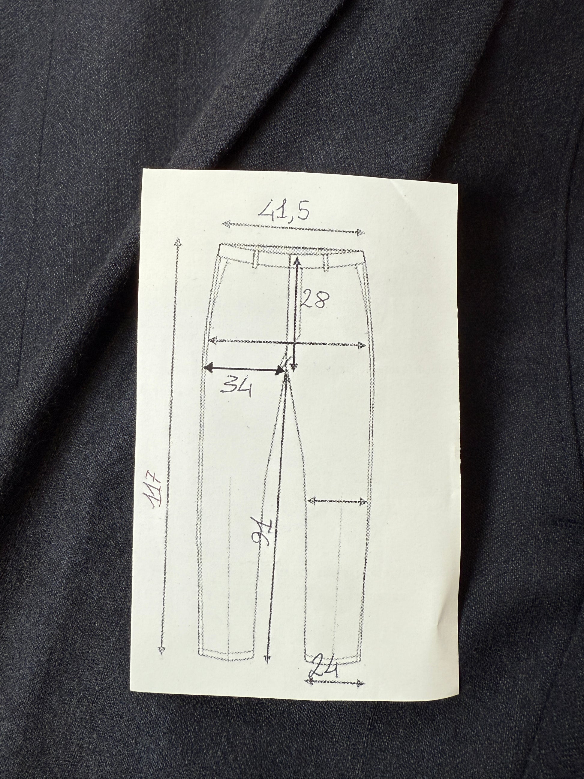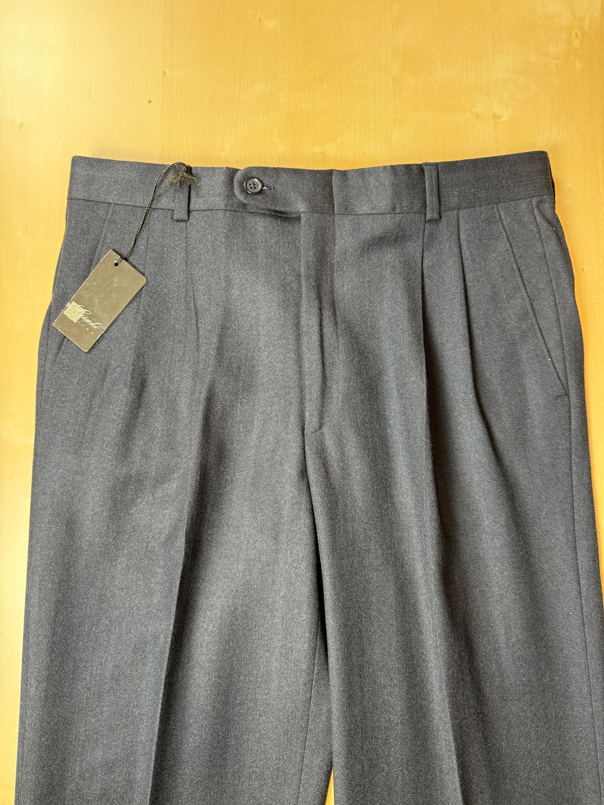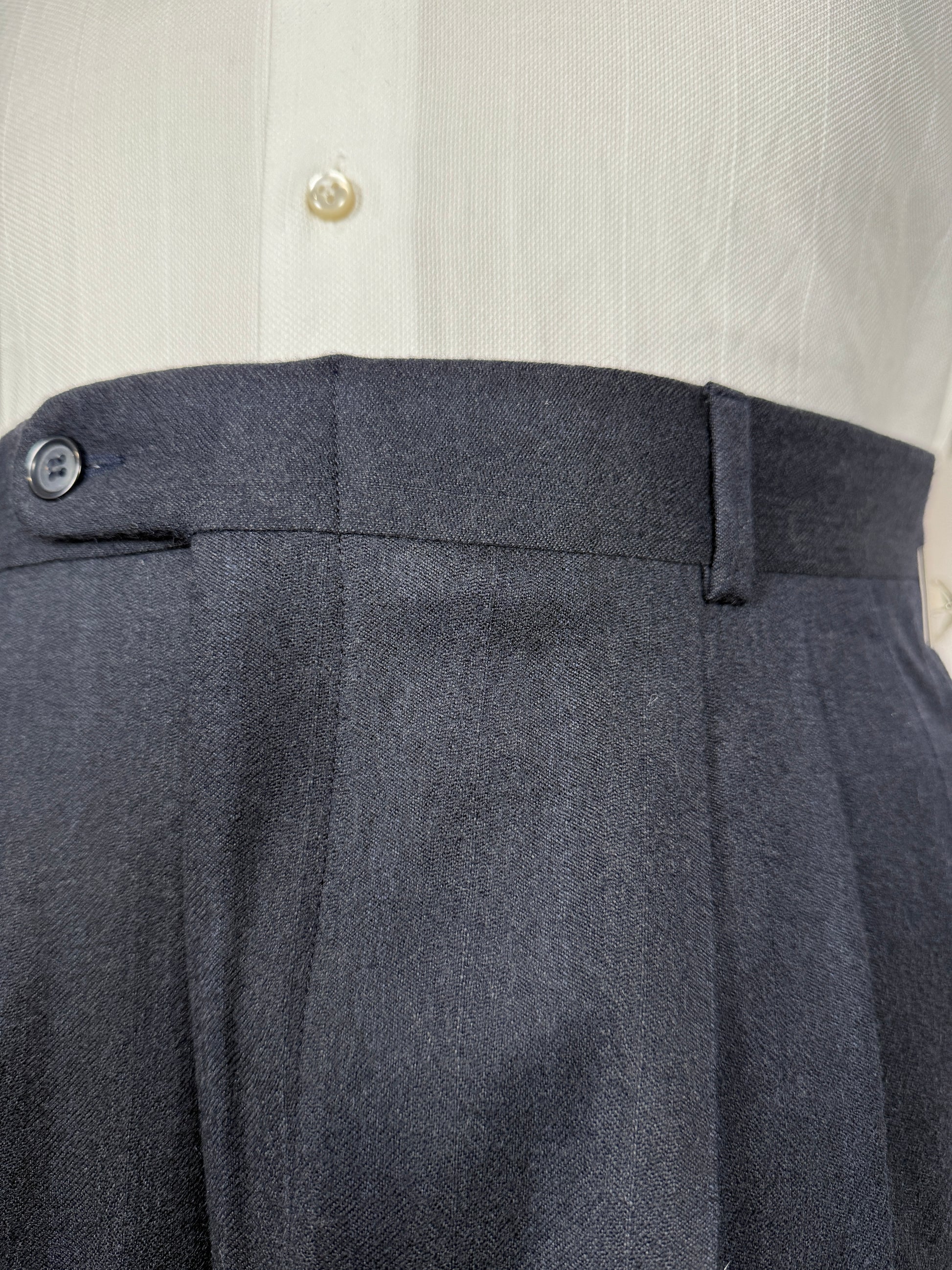 Pantaloni anni ‘80/‘90 in condizioni di nuovo (fondo magazzino), tessuto flanella 100% lana blu notte con trama effetto righe verticali.