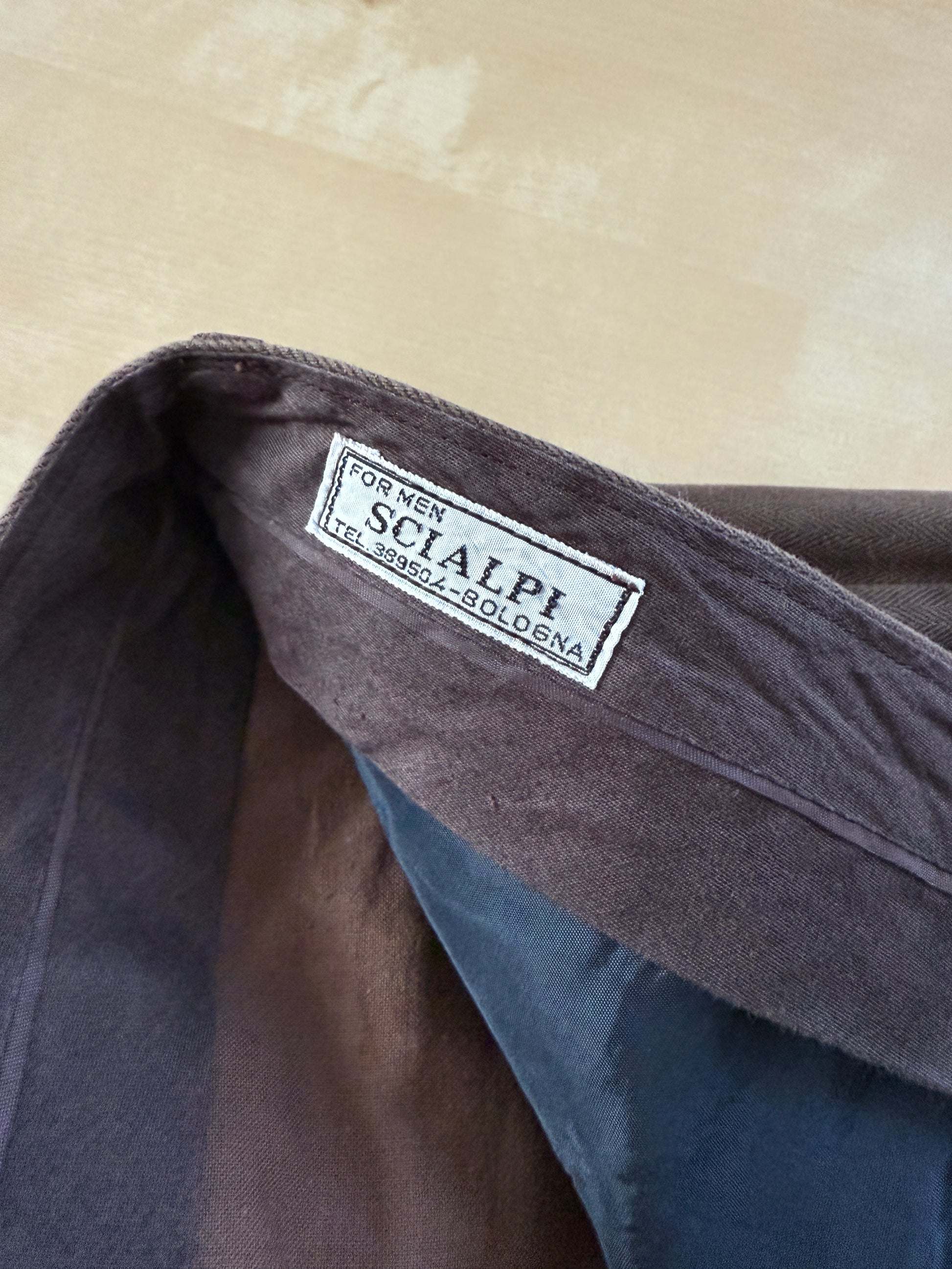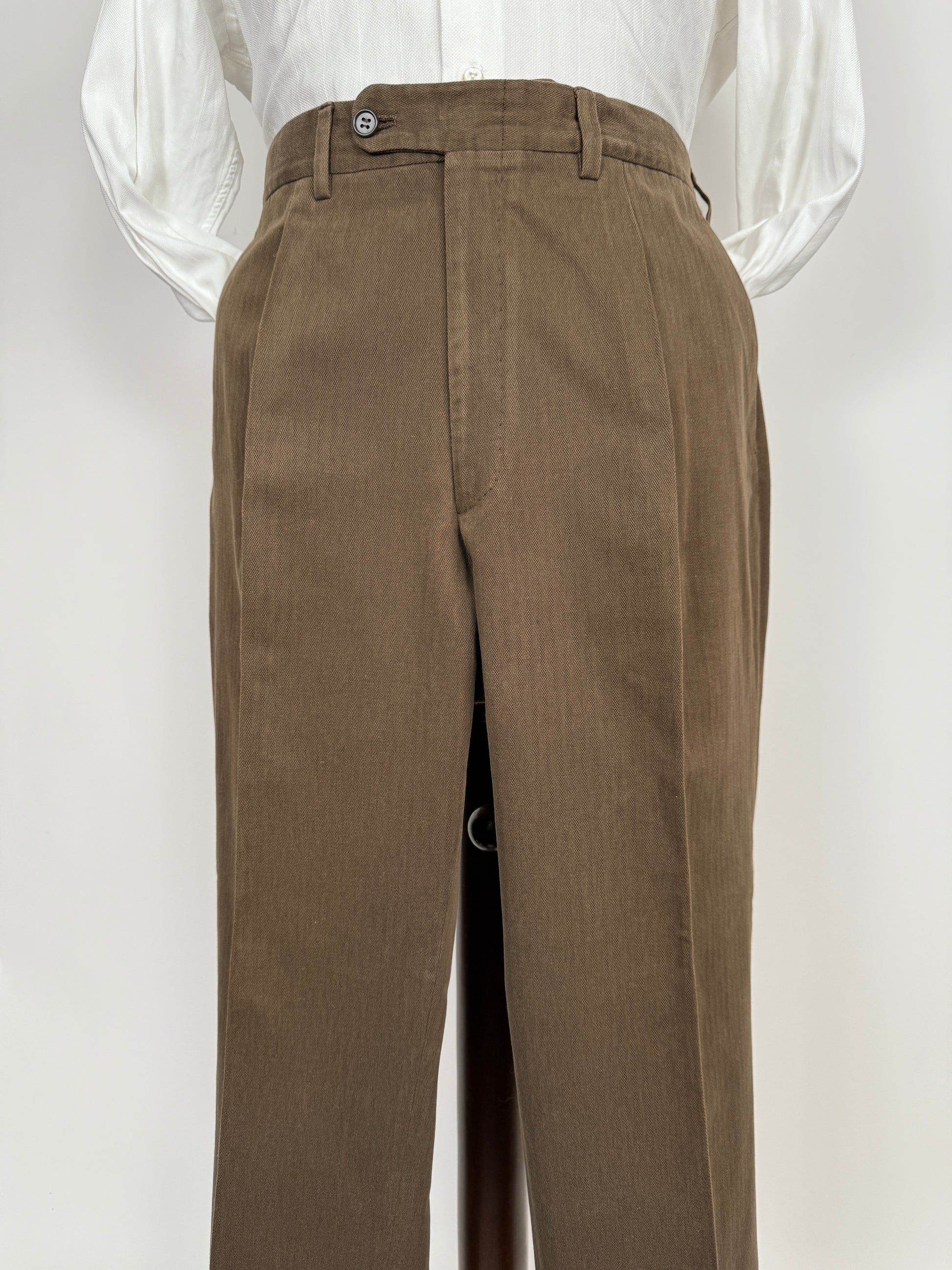 Pantaloni di confezione sartoriale, in puro cotone di grammatura invernale con trama herringbone. Colore marrone scuro.