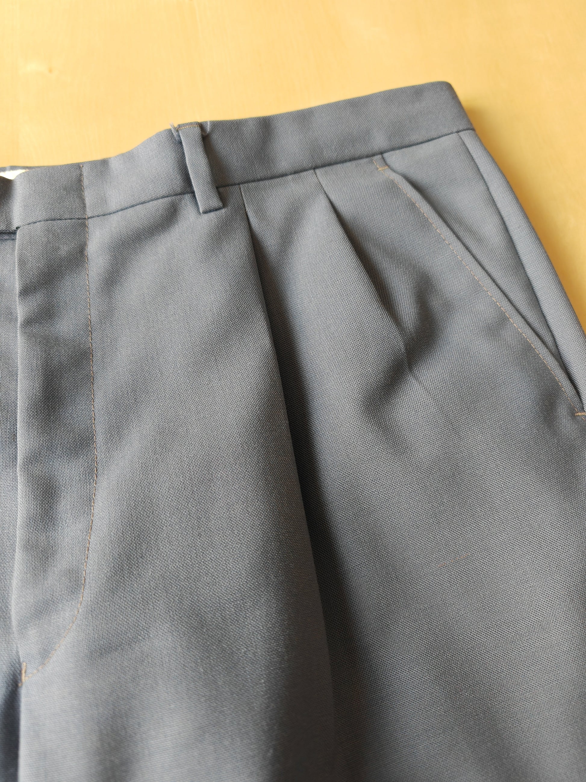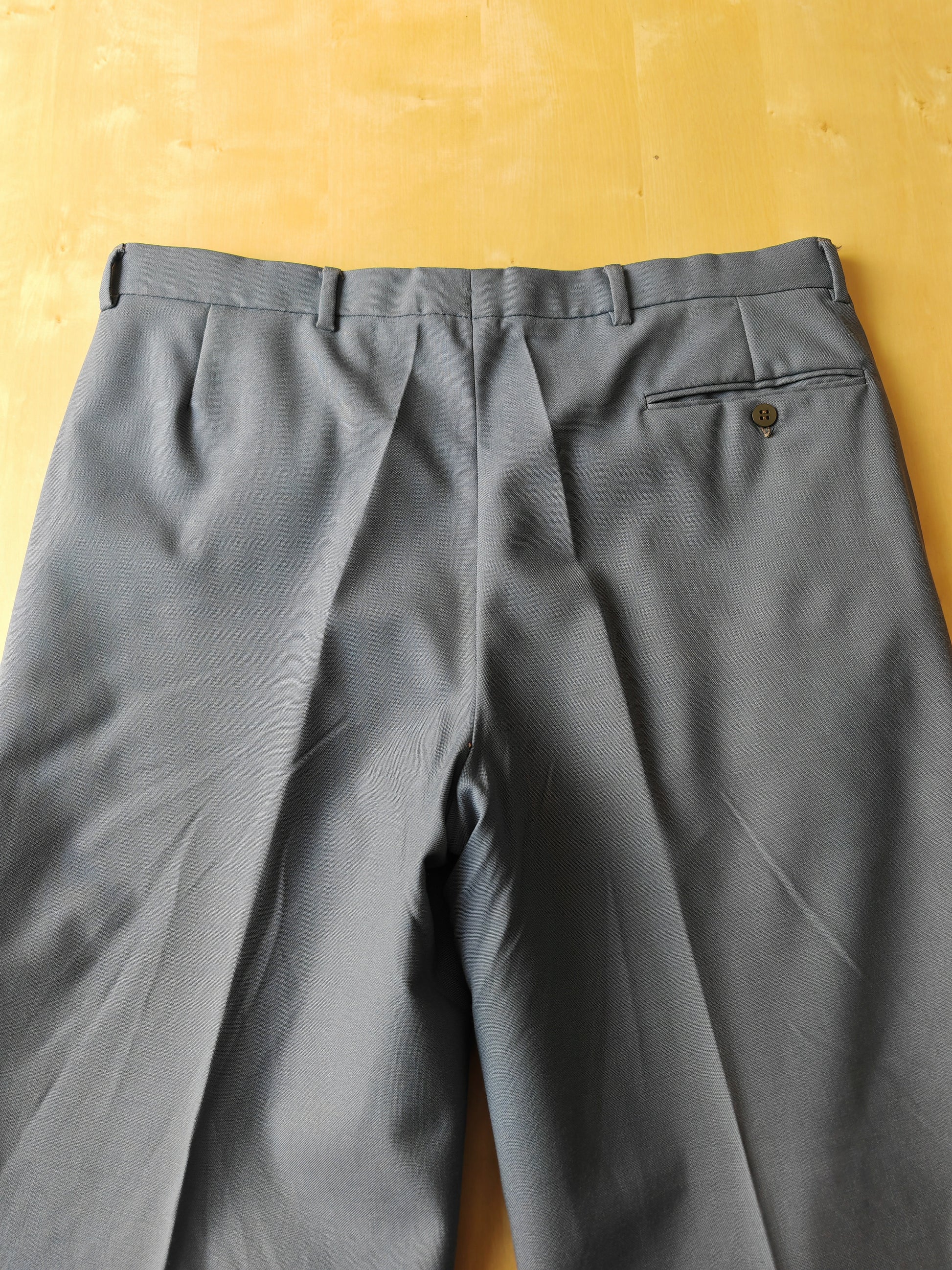 Pantalone vita media (la vita arriva appena sotto l'ombelico), con doppie pinces e ampio fondo 24 cm. La gamba ha un taglio morbido ma dritto, senza svasatura né "zampa".