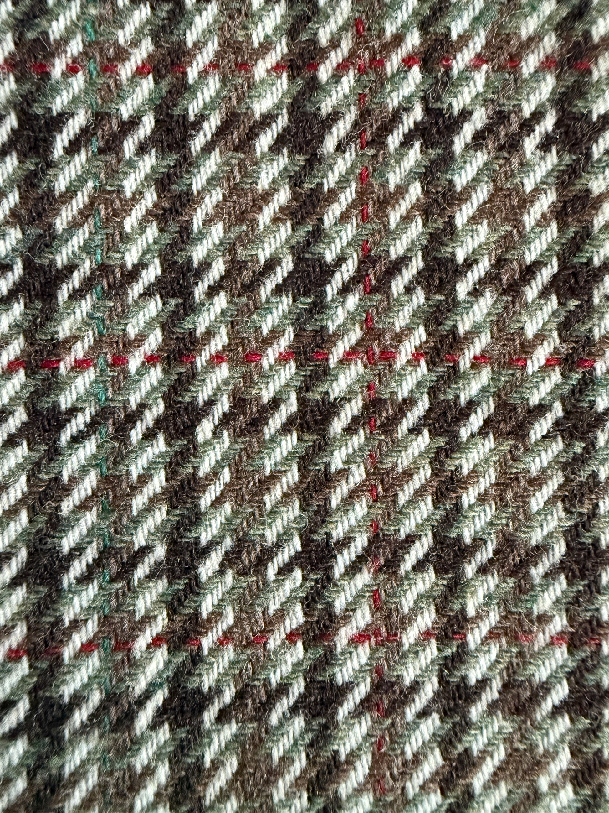 Lato cappotto in un bel tessuto di lana a fantasia pied-de-poule, nei colori marrone, verde, beige e rosso.
