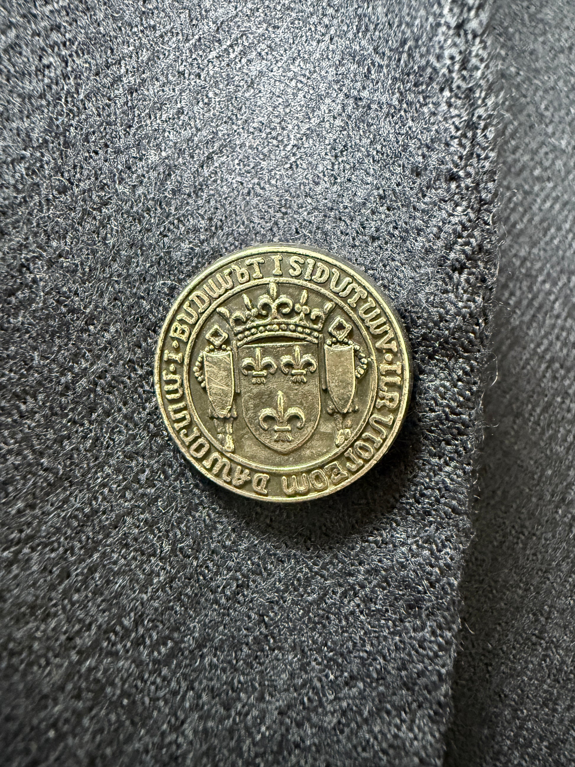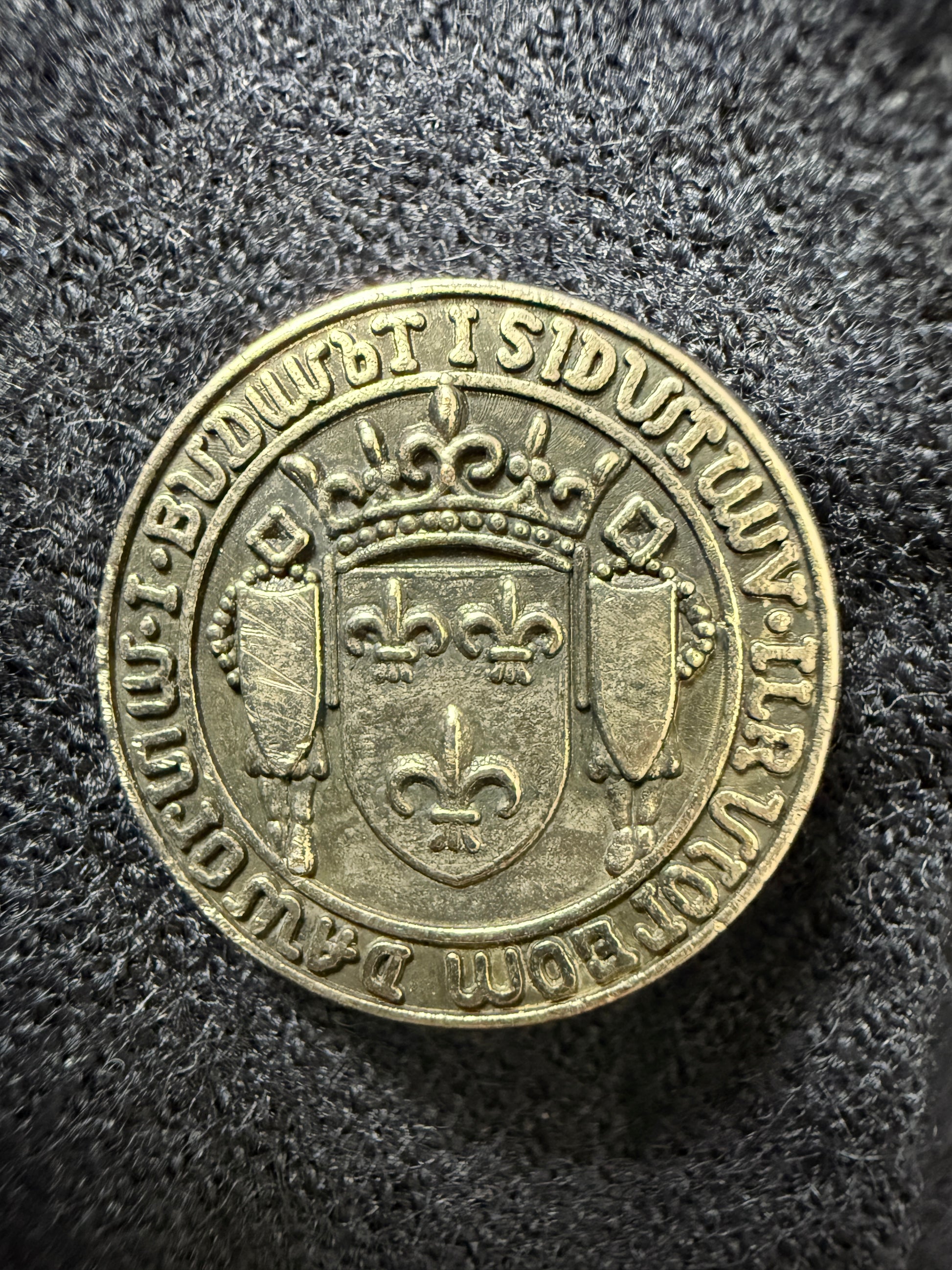 Bellissimi bottoni metallici che riproducono, si direbbe, una moneta della monarchia francese, con stemma a tre gigli e motto latino.