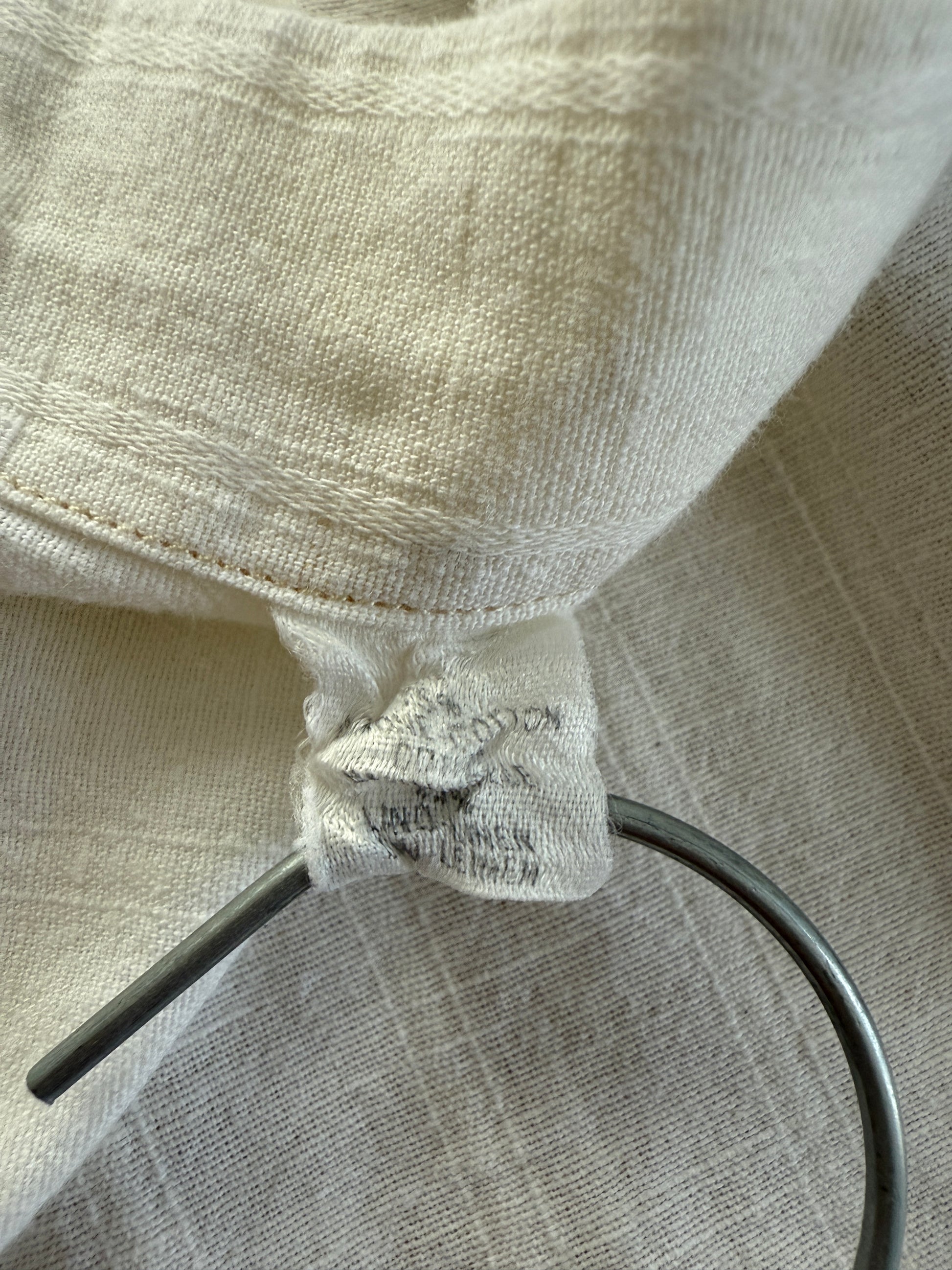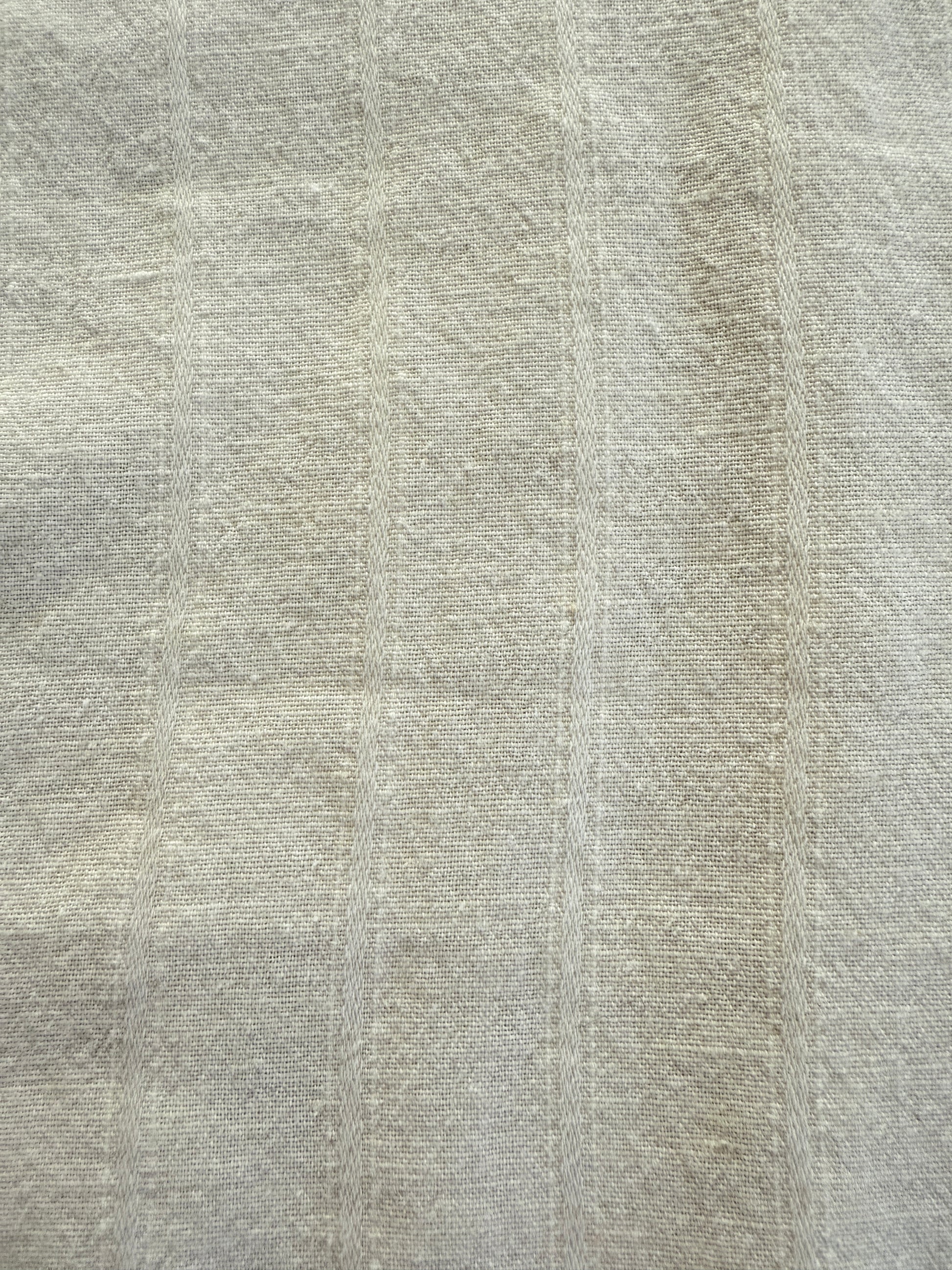 Tessuto in tela 75% cotone e 25% lino, molto sostenuto e dalla finitura grezza che ricorda la camiceria di inizio secolo.