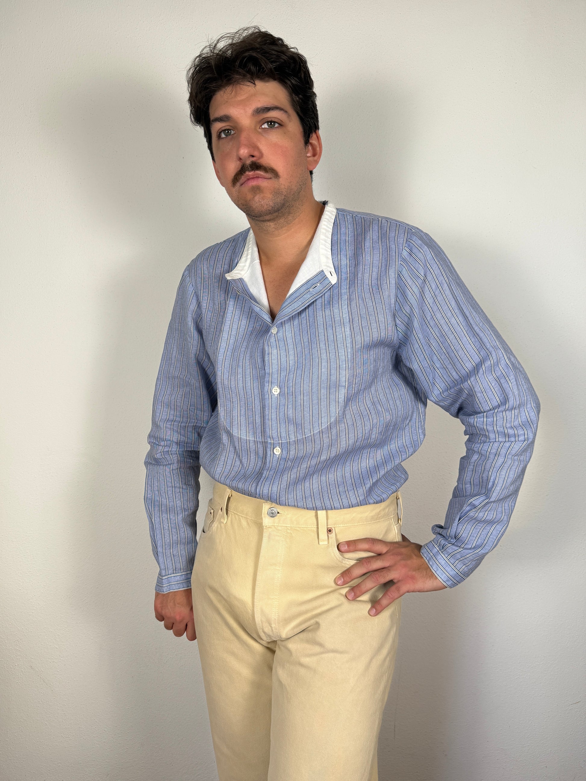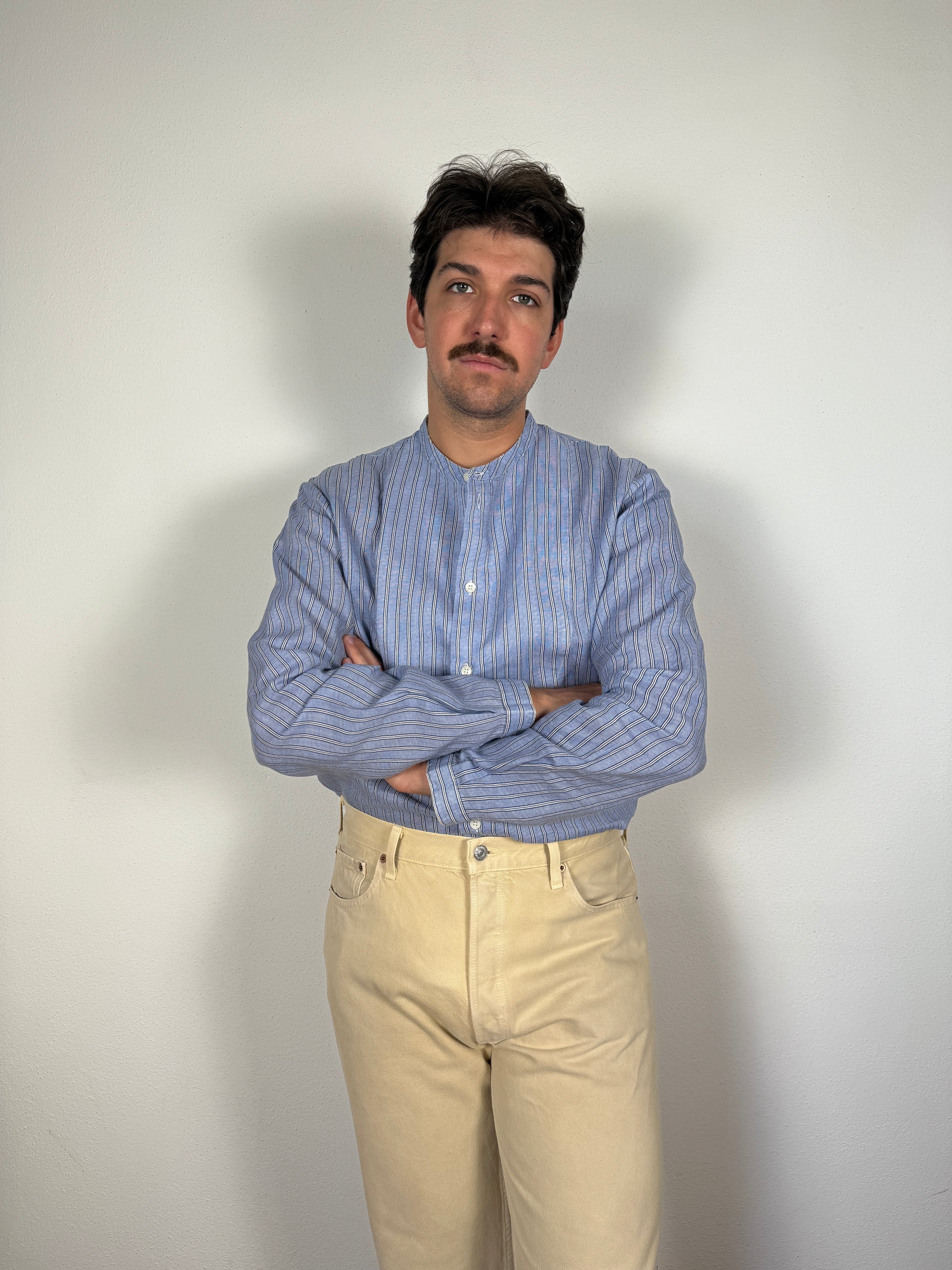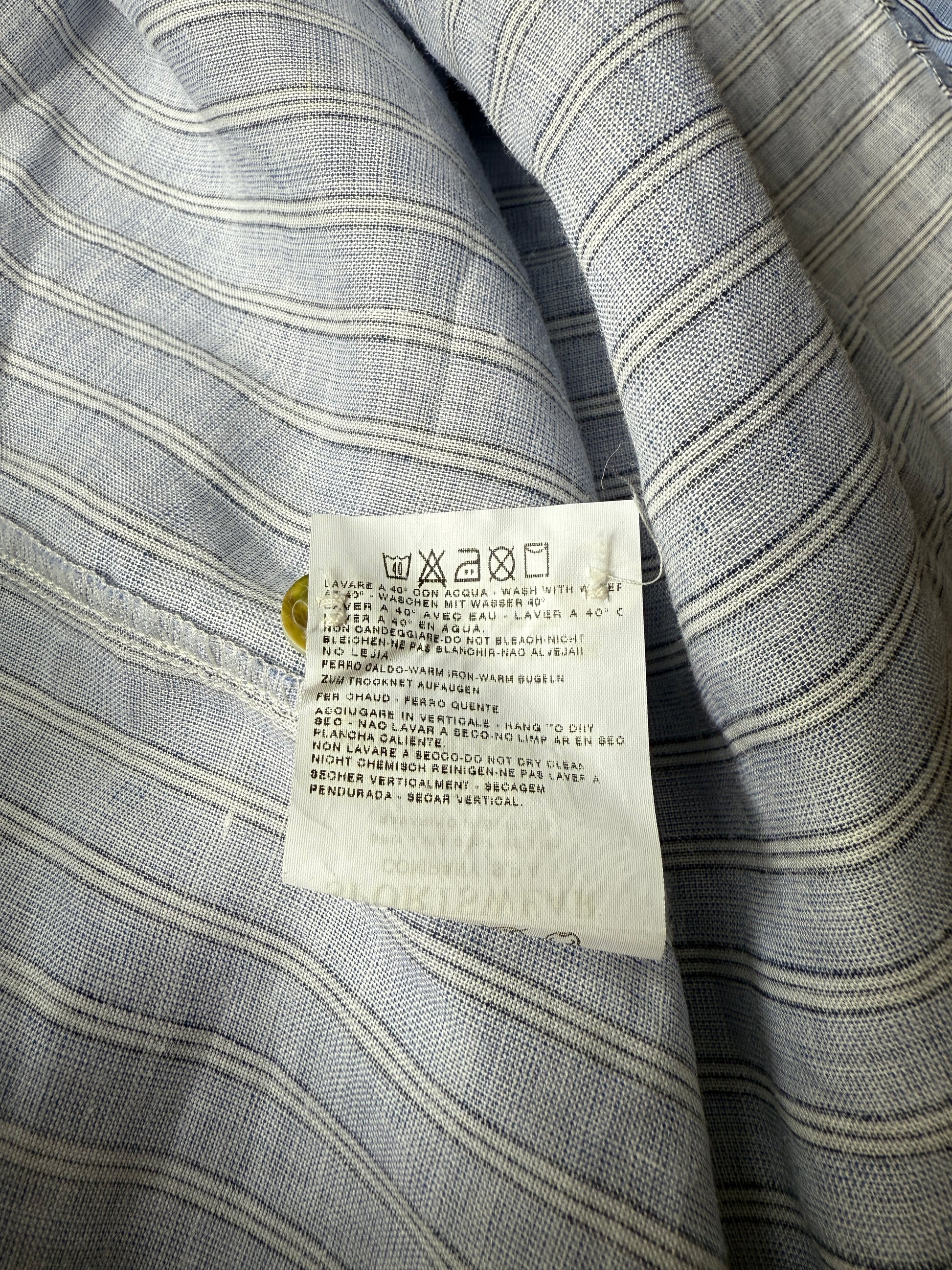 Composizione 100% ramia (fibra vegetale molto simile al lino), per un tessuto leggero e traspirante ma ben sostenuto: a differenza del lino, infatti, la ramia non sgualcisce. Colore azzurro con doppie righe bianche e blu.