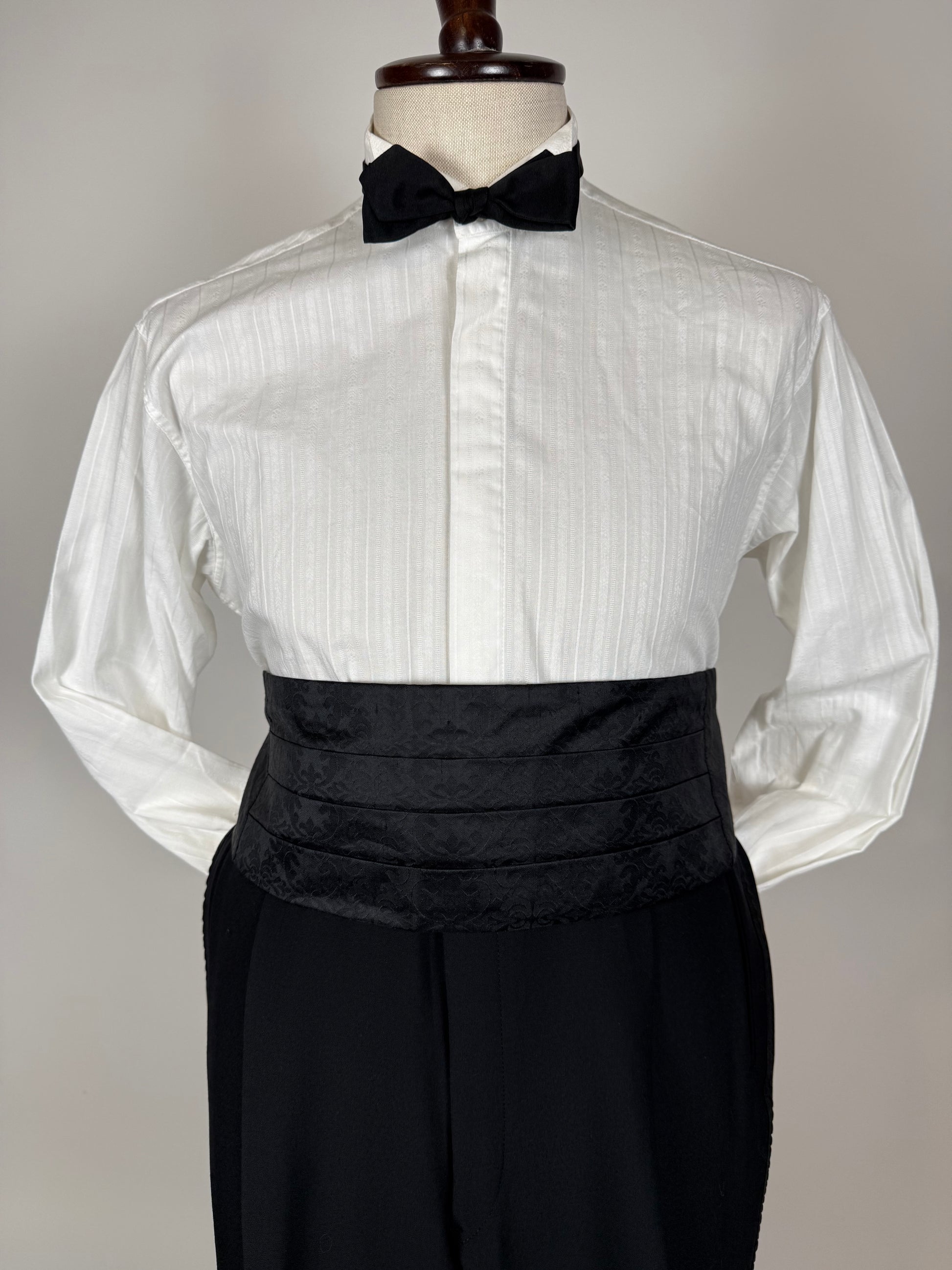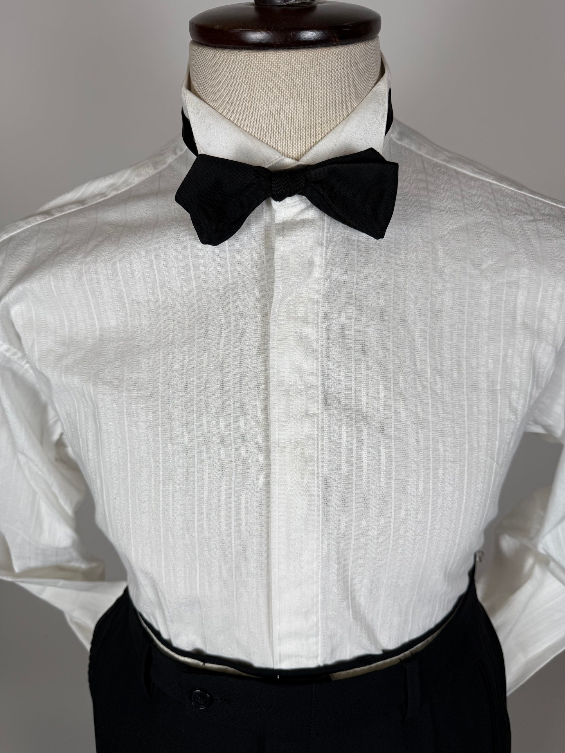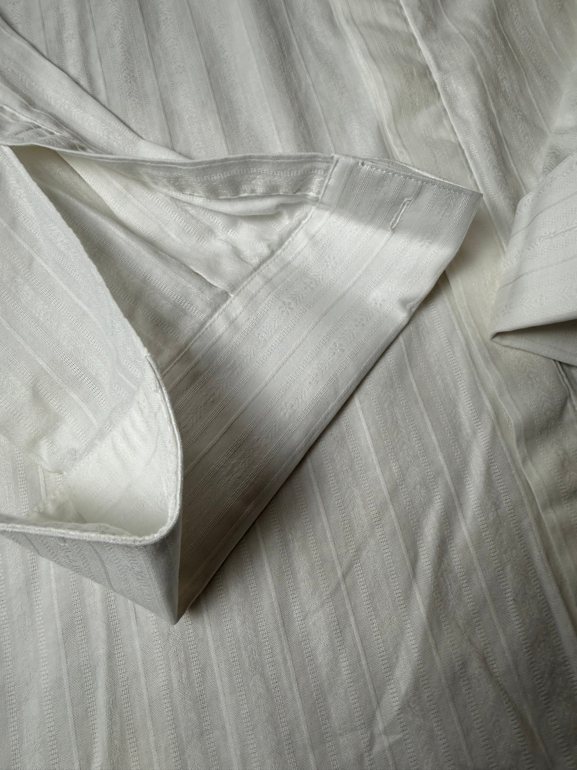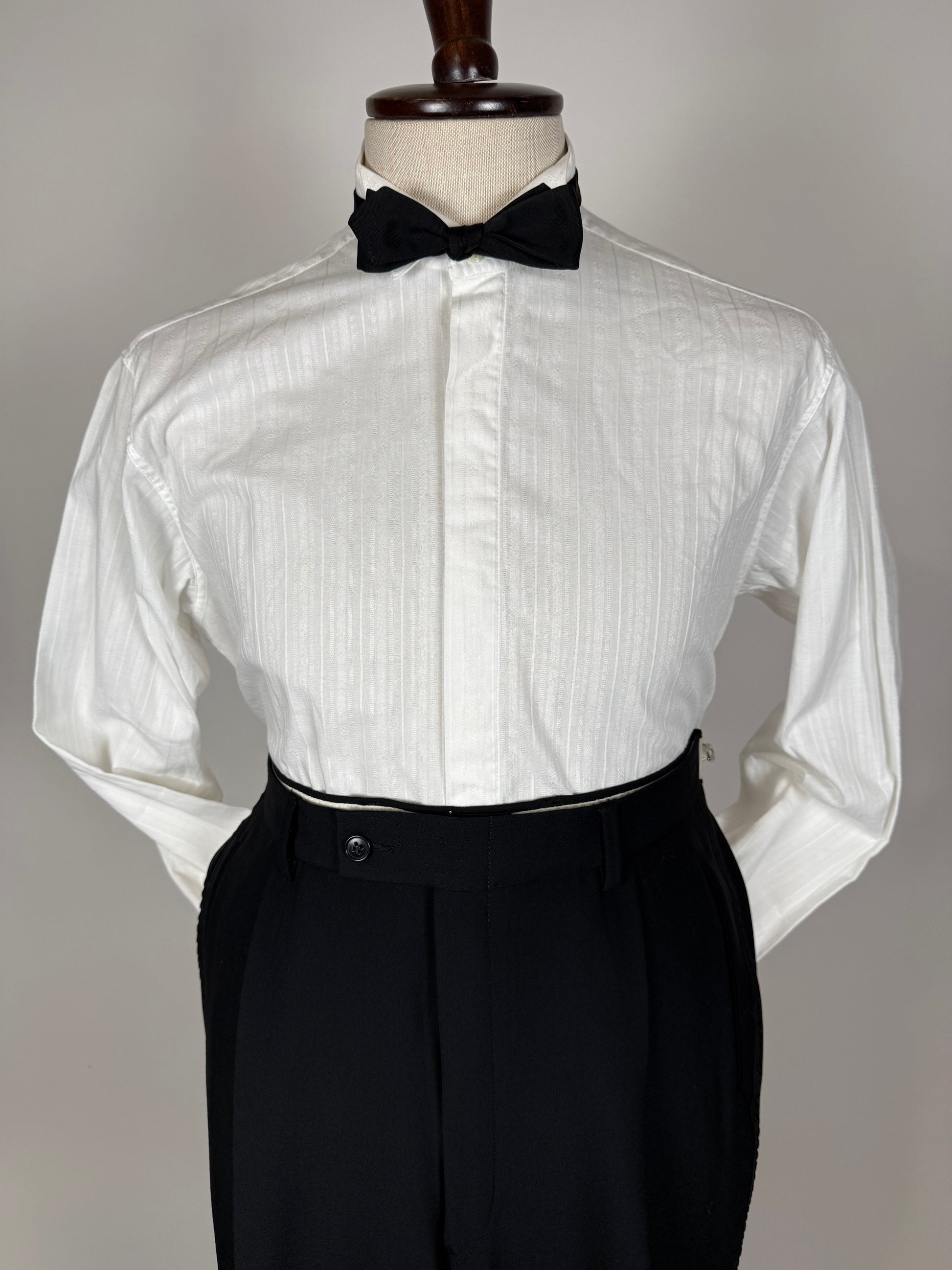 Camicia da smoking anni '80/'90, in 100% cotone popeline: tessuto operato, con bella lavorazione a righe verticali.