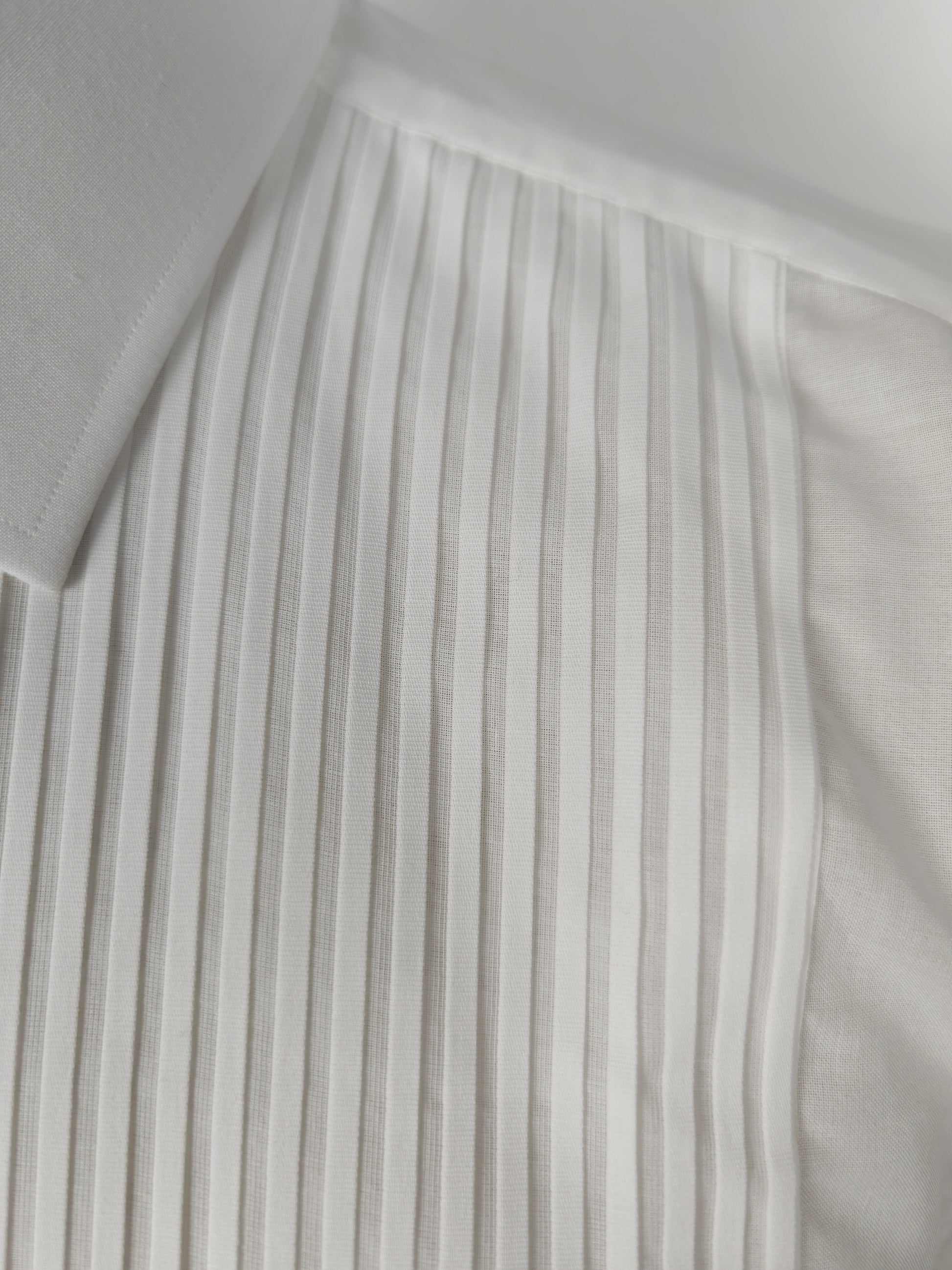 Collo mezzo-italiano, molto basso essendo predisposto ovviamente per il papillon e non per la cravatta. I polsini sono alla francese, da chiudere quindi con gemelli da polso.