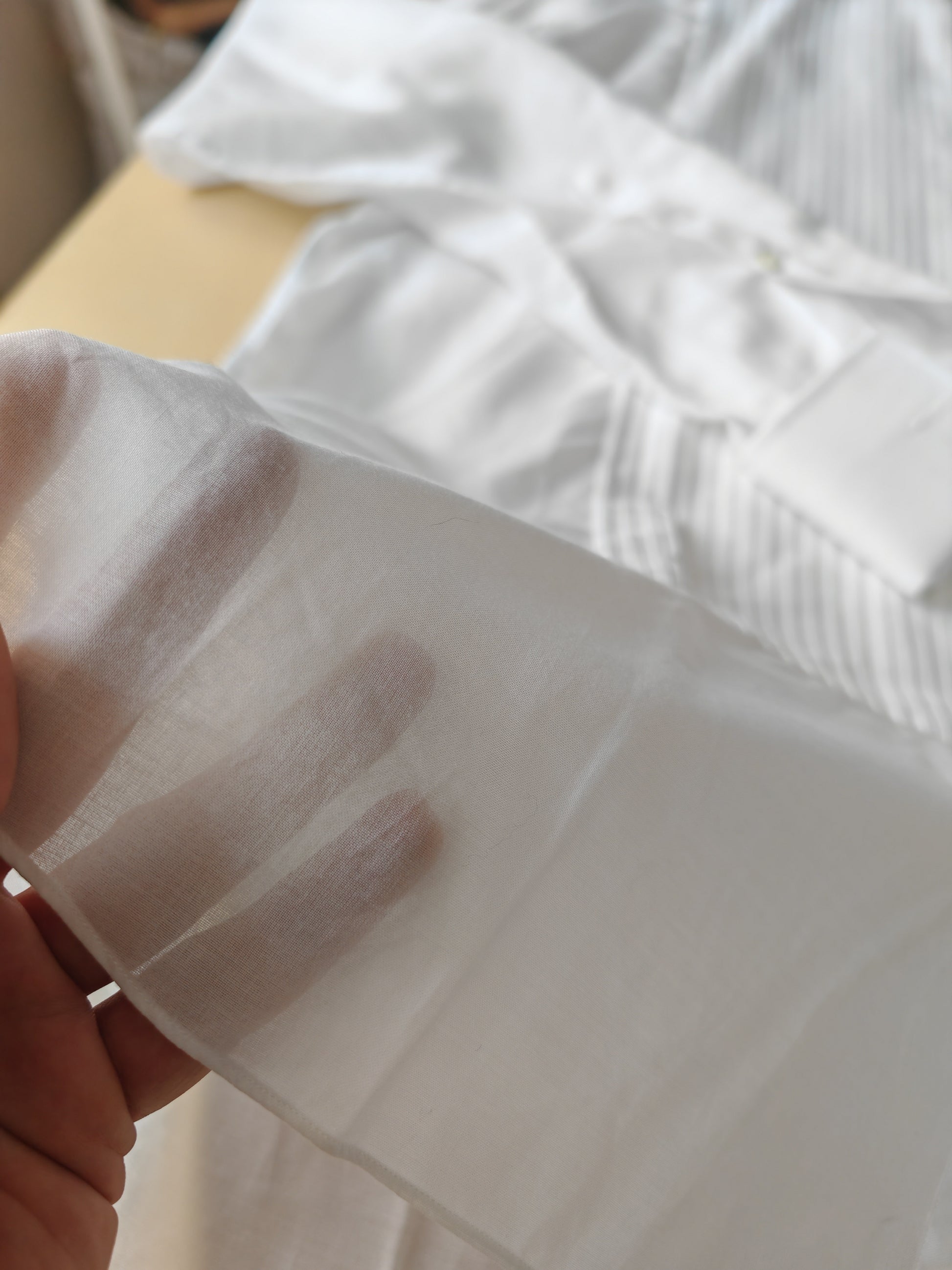Tessuto batista 100% cotone, un tessuto con armatura tela leggerissimo e quasi trasparente. Il tessuto è a doppio strato nella parte anteriore in corrispondenza dello sparato, che è plissettato e piuttosto esteso. Cannoncino con bottoni nascosti, in vera madreperla australiana.