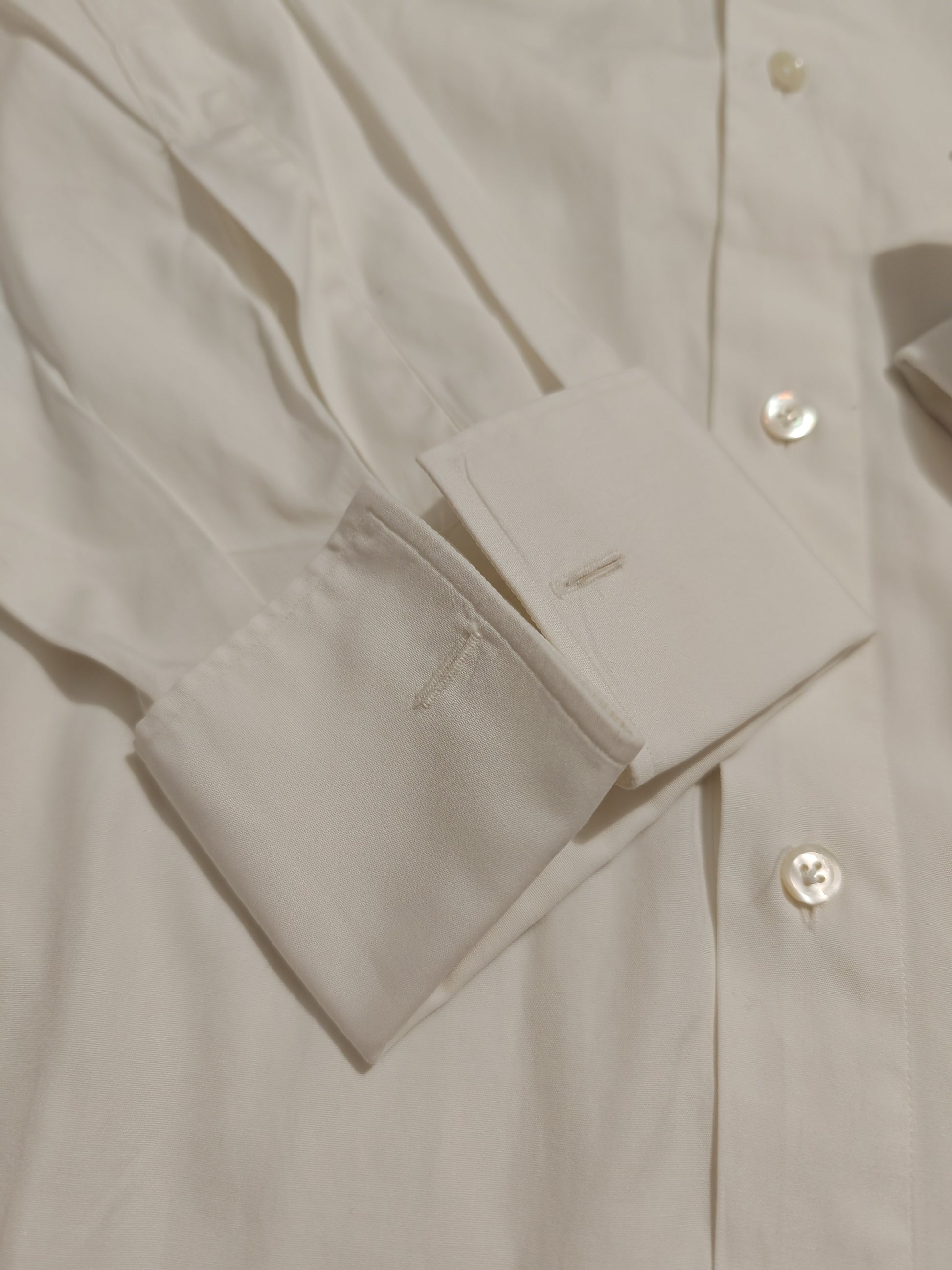 La camicia ha un importante colletto mezzo francese, predisposto per il papillon quindi piuttosto basso, cannoncino con bottoni a vista in vera madreperla, polsini alla francese da gemello e sparato a doppio strato sul davanti.