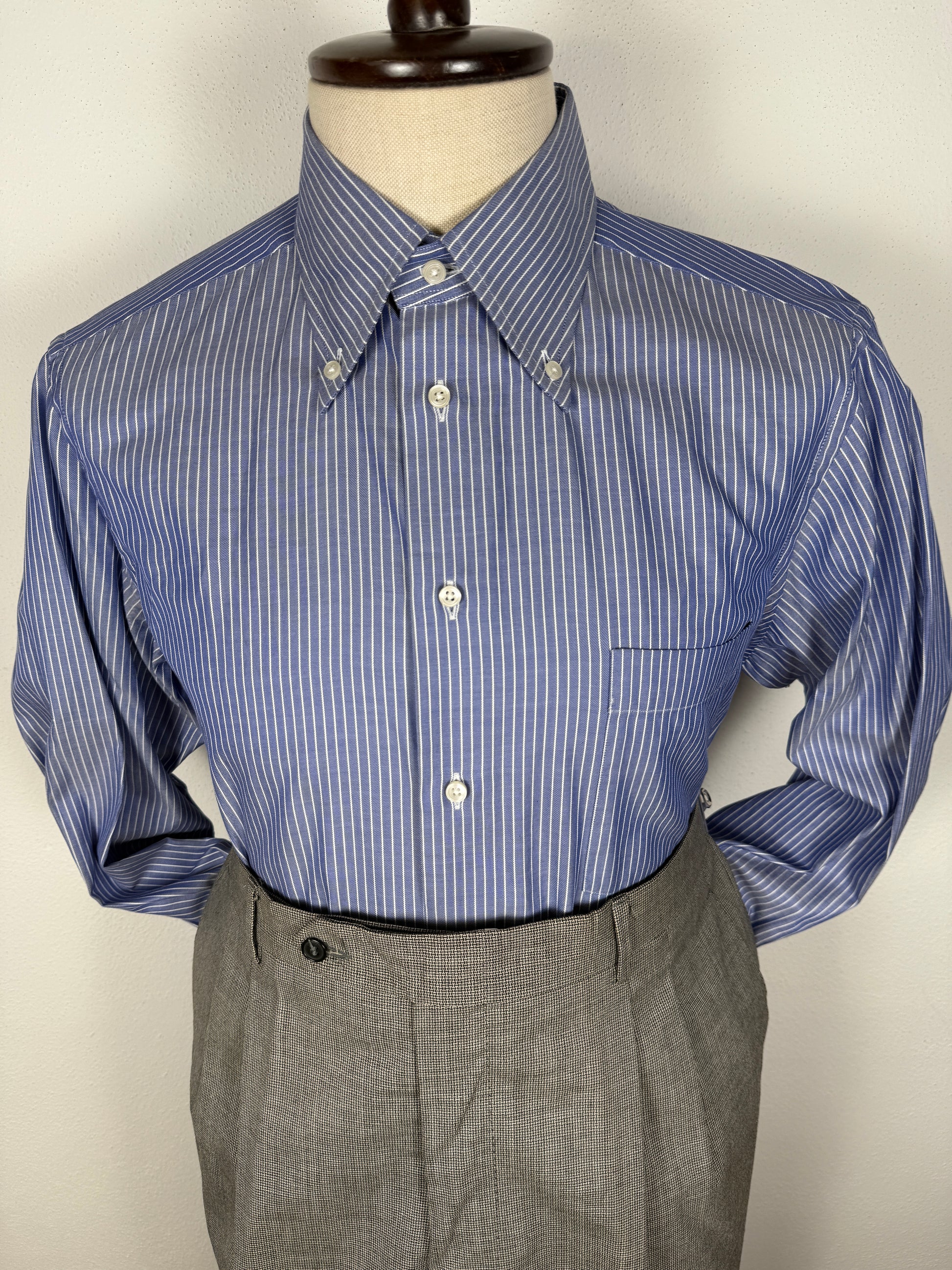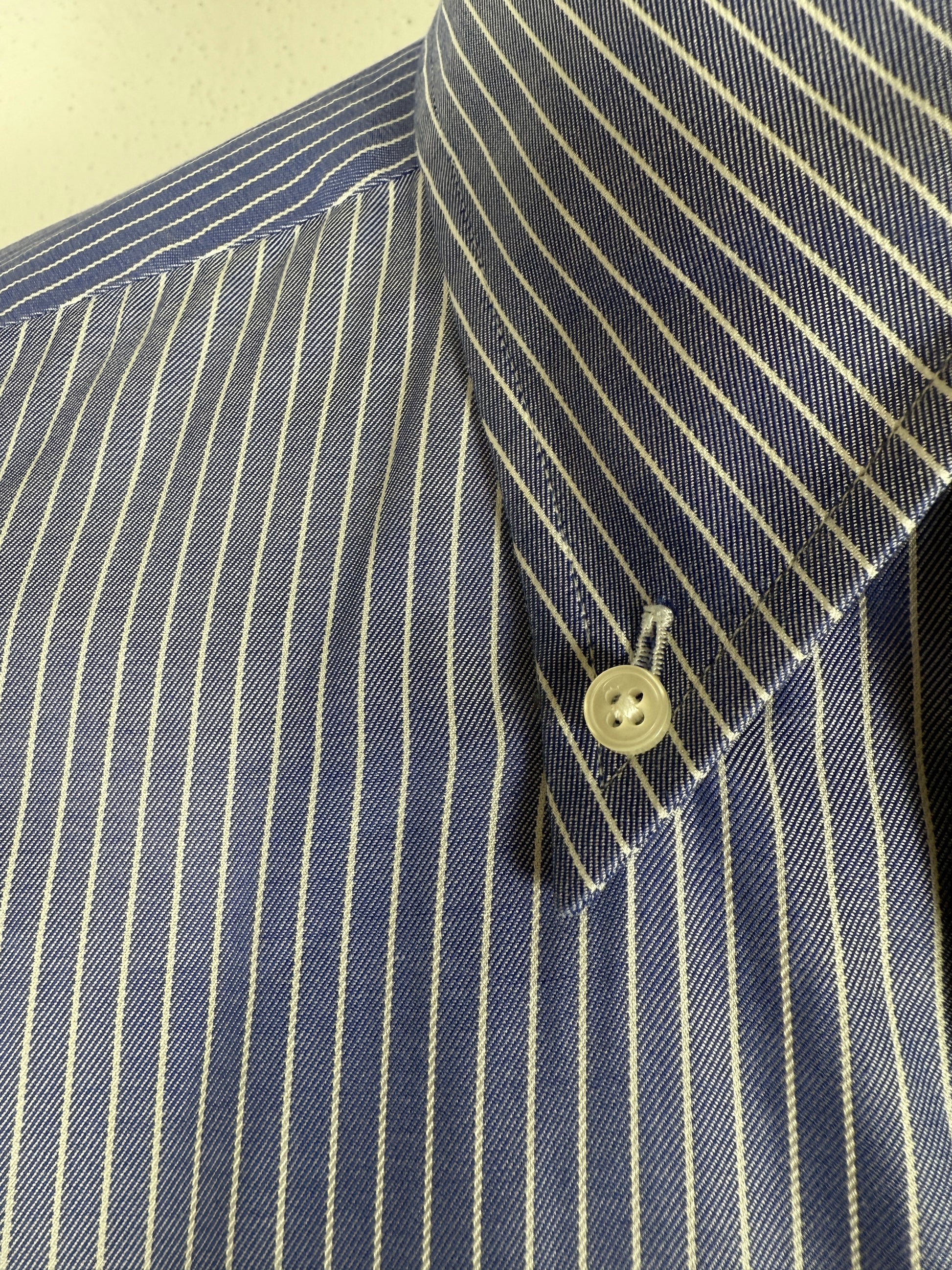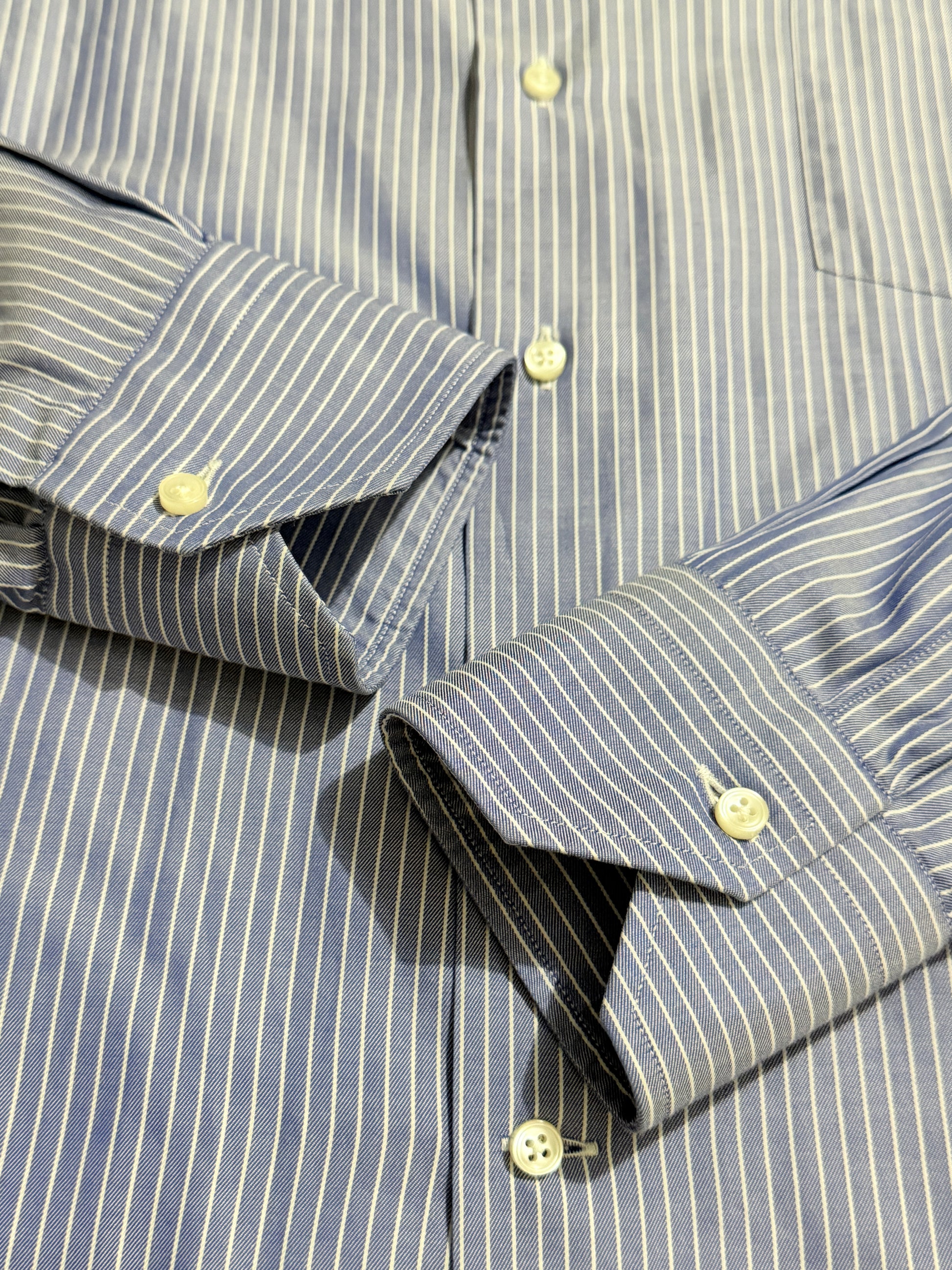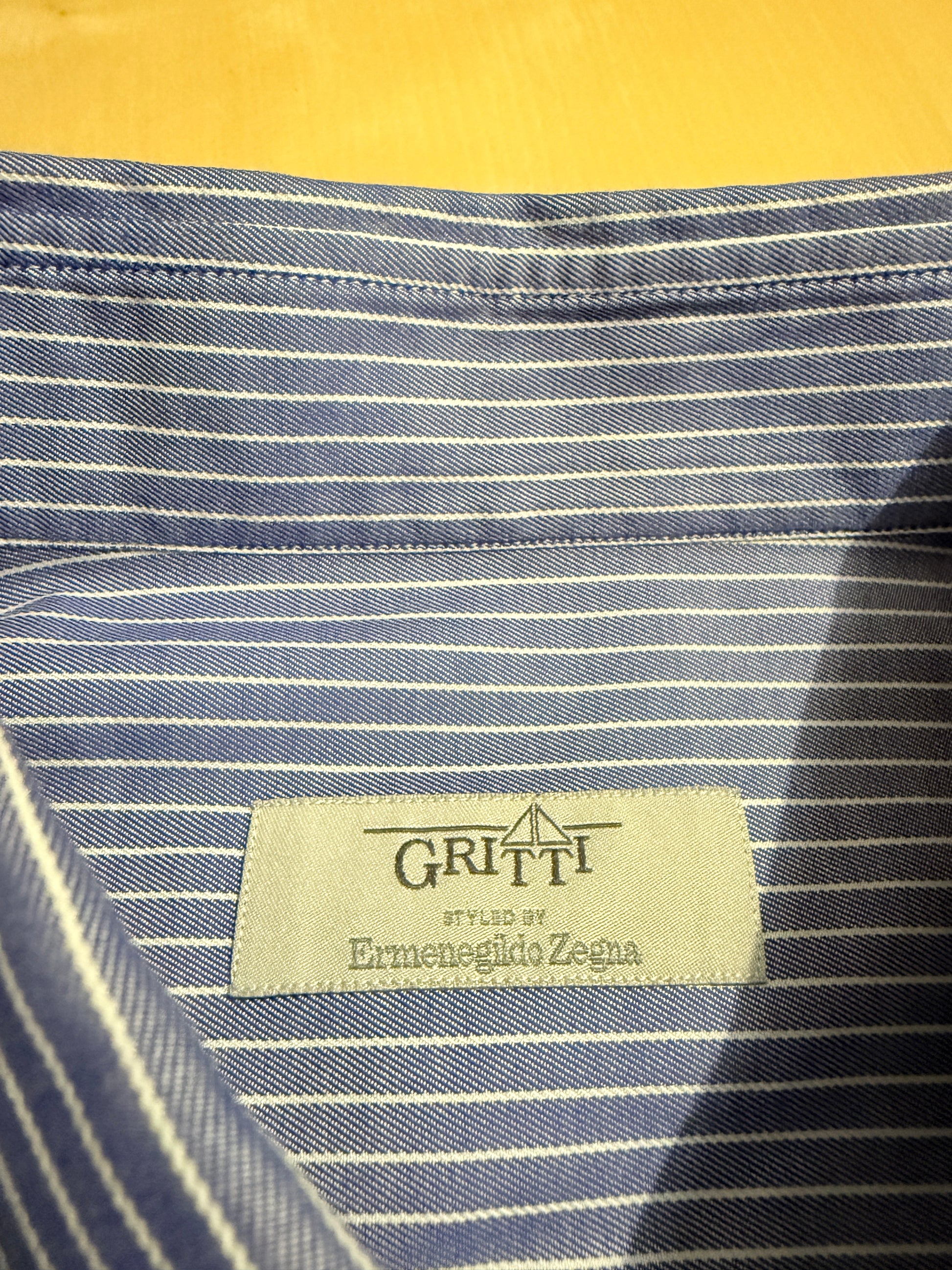 Camicia Ermenegildo Zegna linea Gritti, blu a righe bianche. 100% cotone in twill ritorto: l'effetto è una mano molto morbida, con effetto lucido e leggermente cangiante.