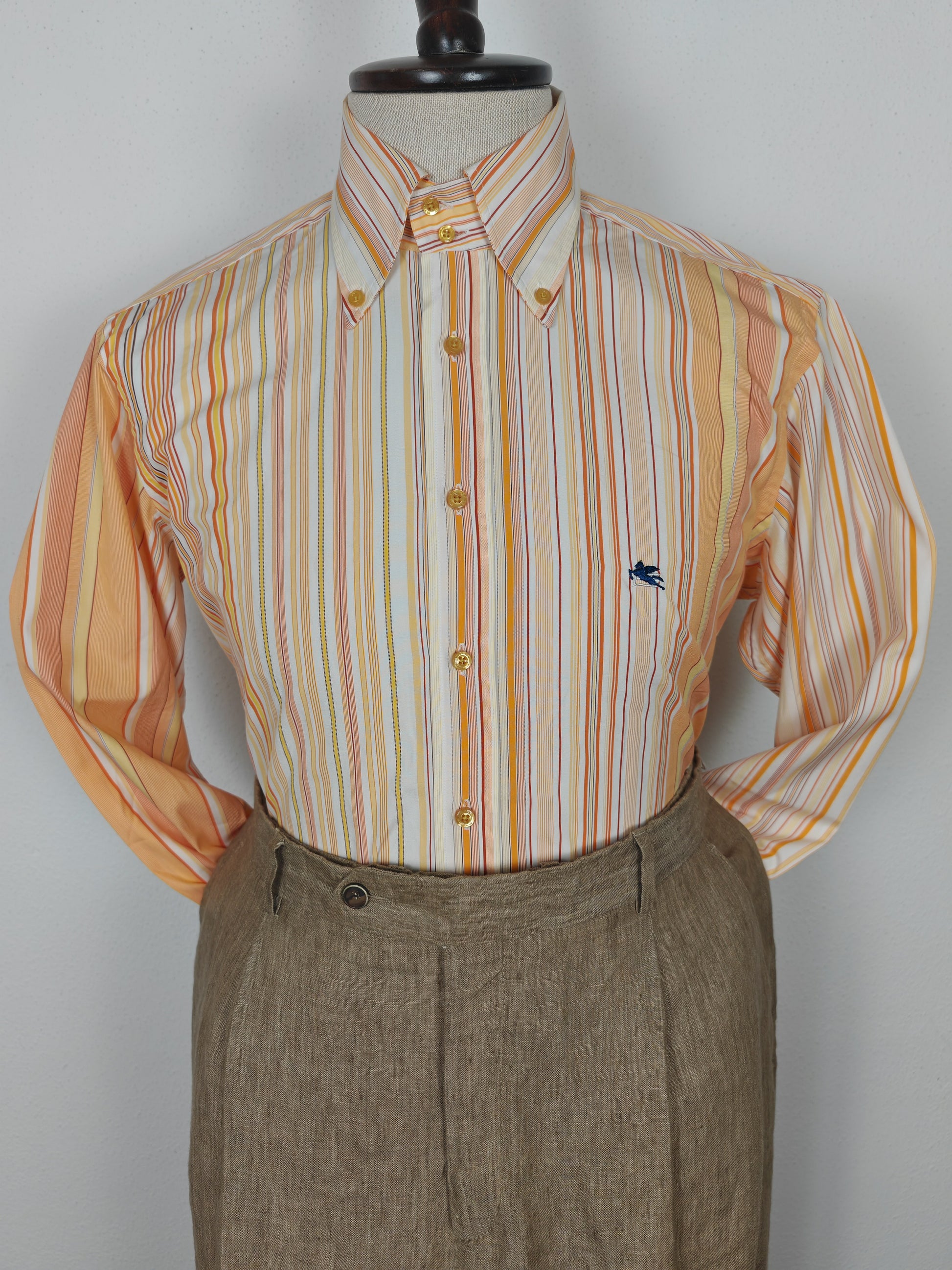 Camicia Etro con bellissima fantasia a righe molto estiva sui toni pastello dell'arancione, pesca e giallo.