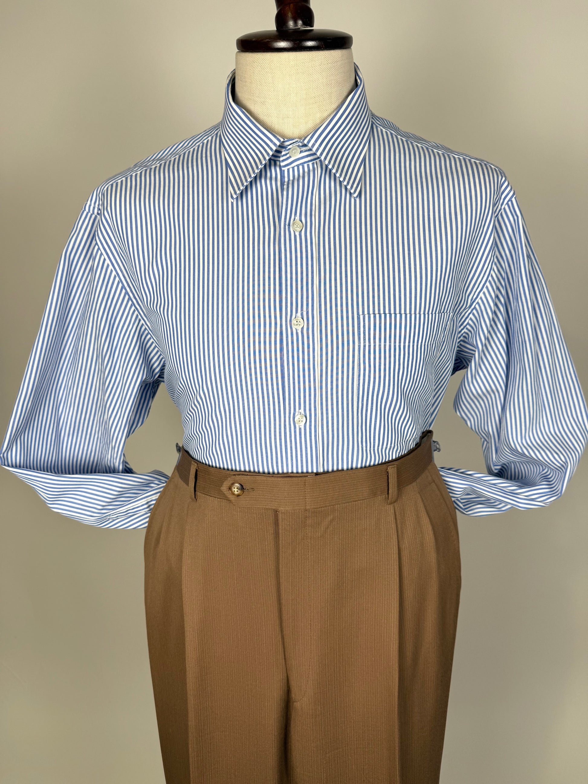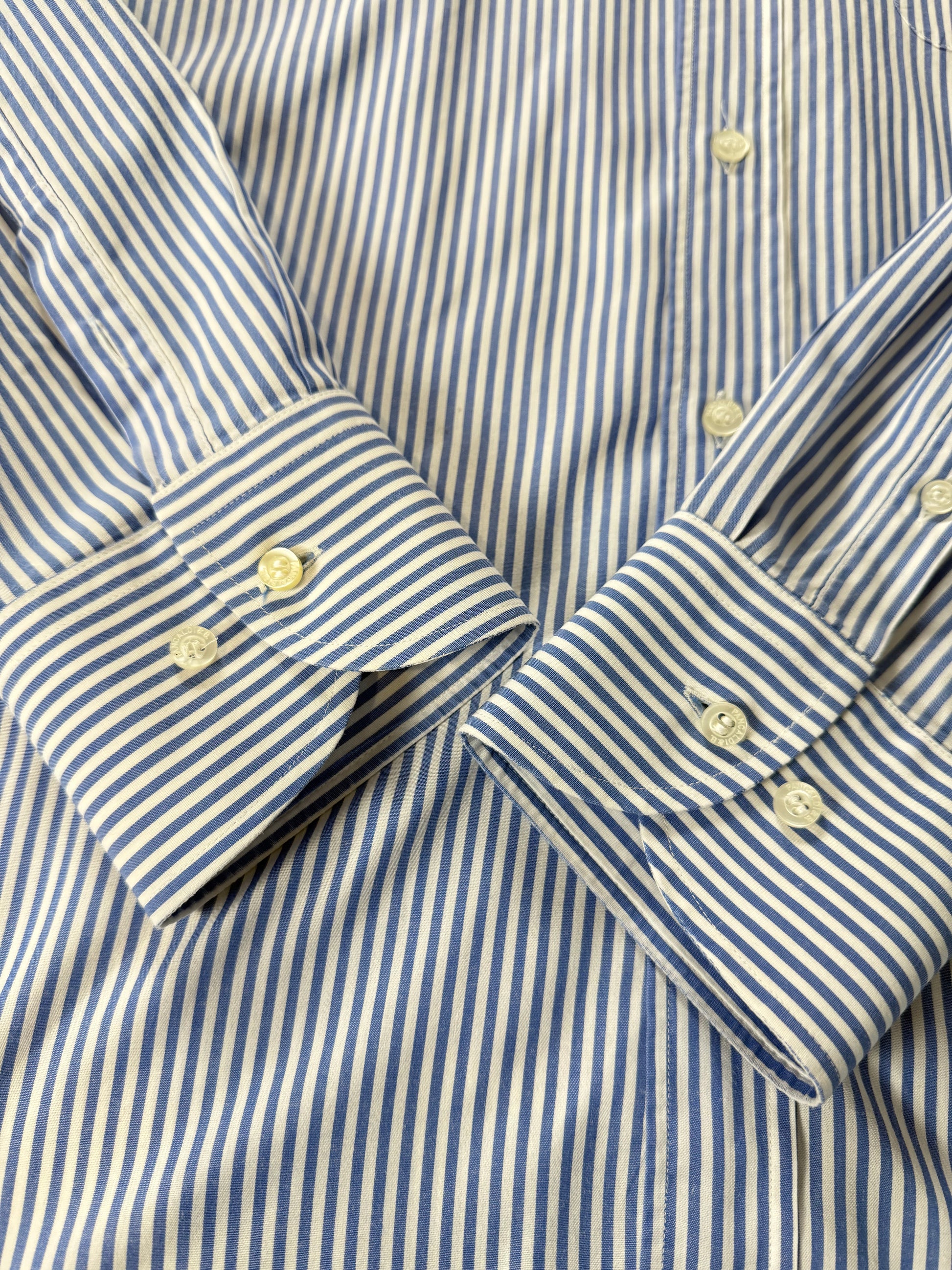 Camicia Pancaldi anni ‘80, in popeline 100% cotone leggero con fantasia a riga bacchettata blu su bianco.