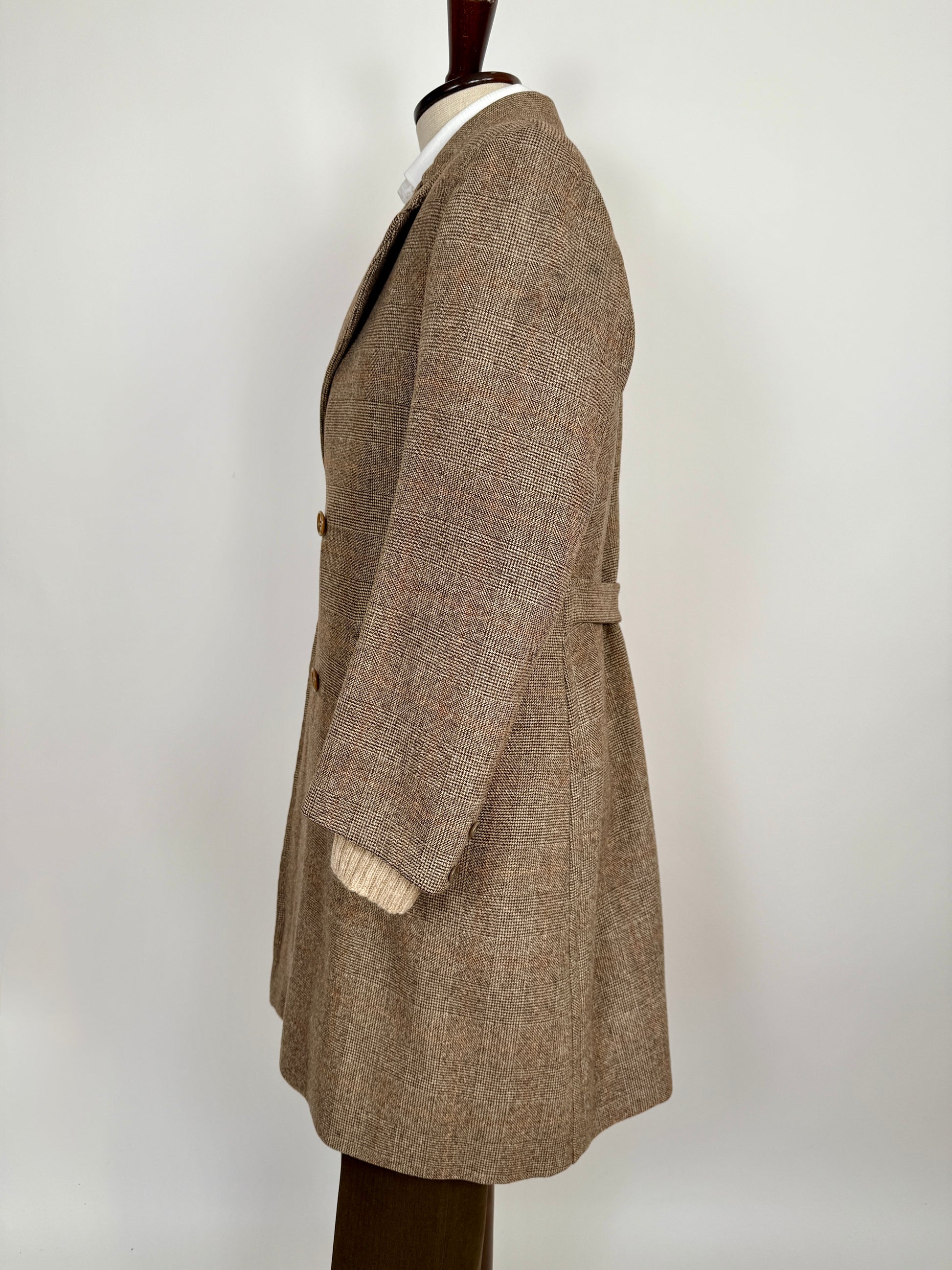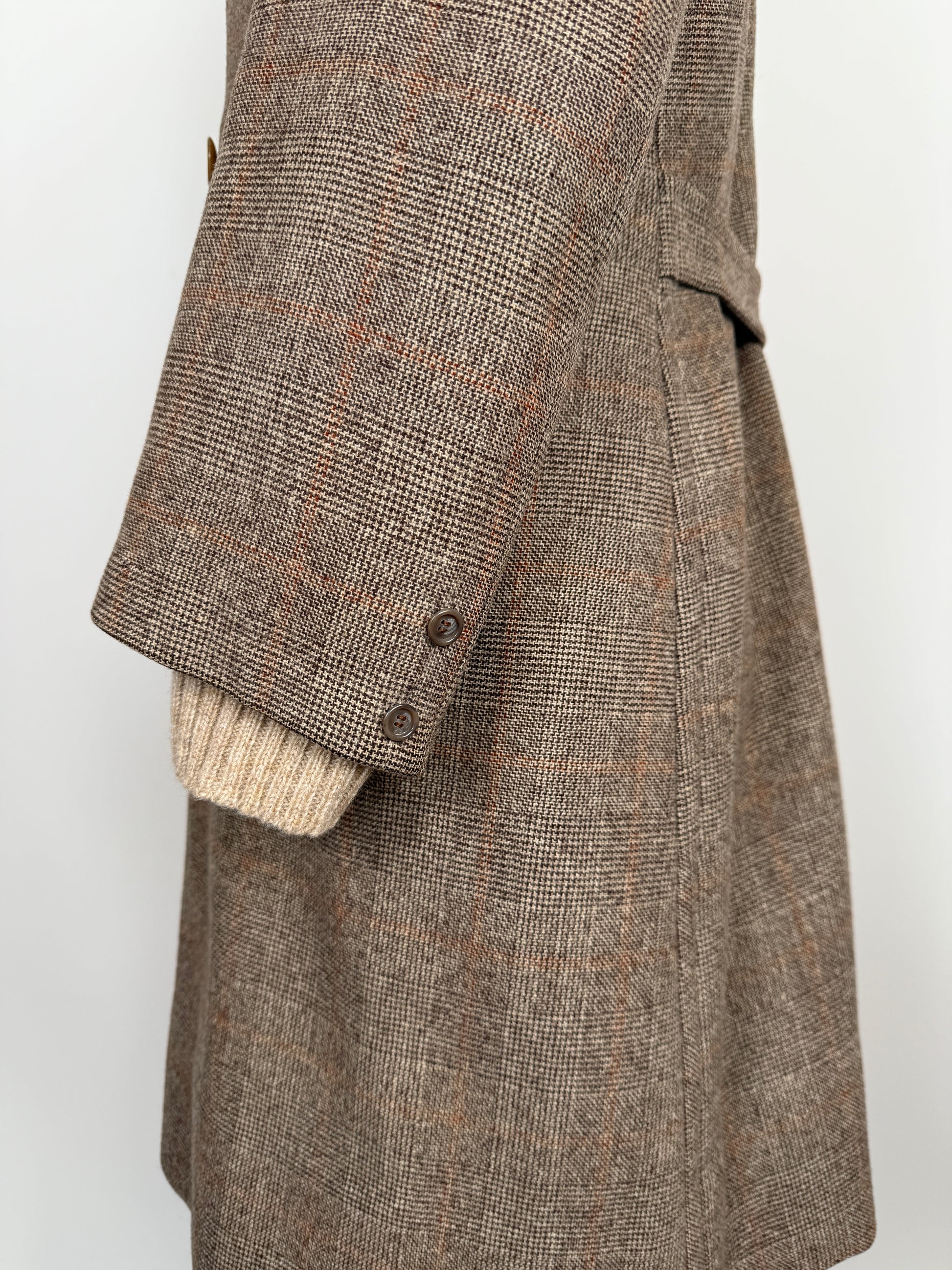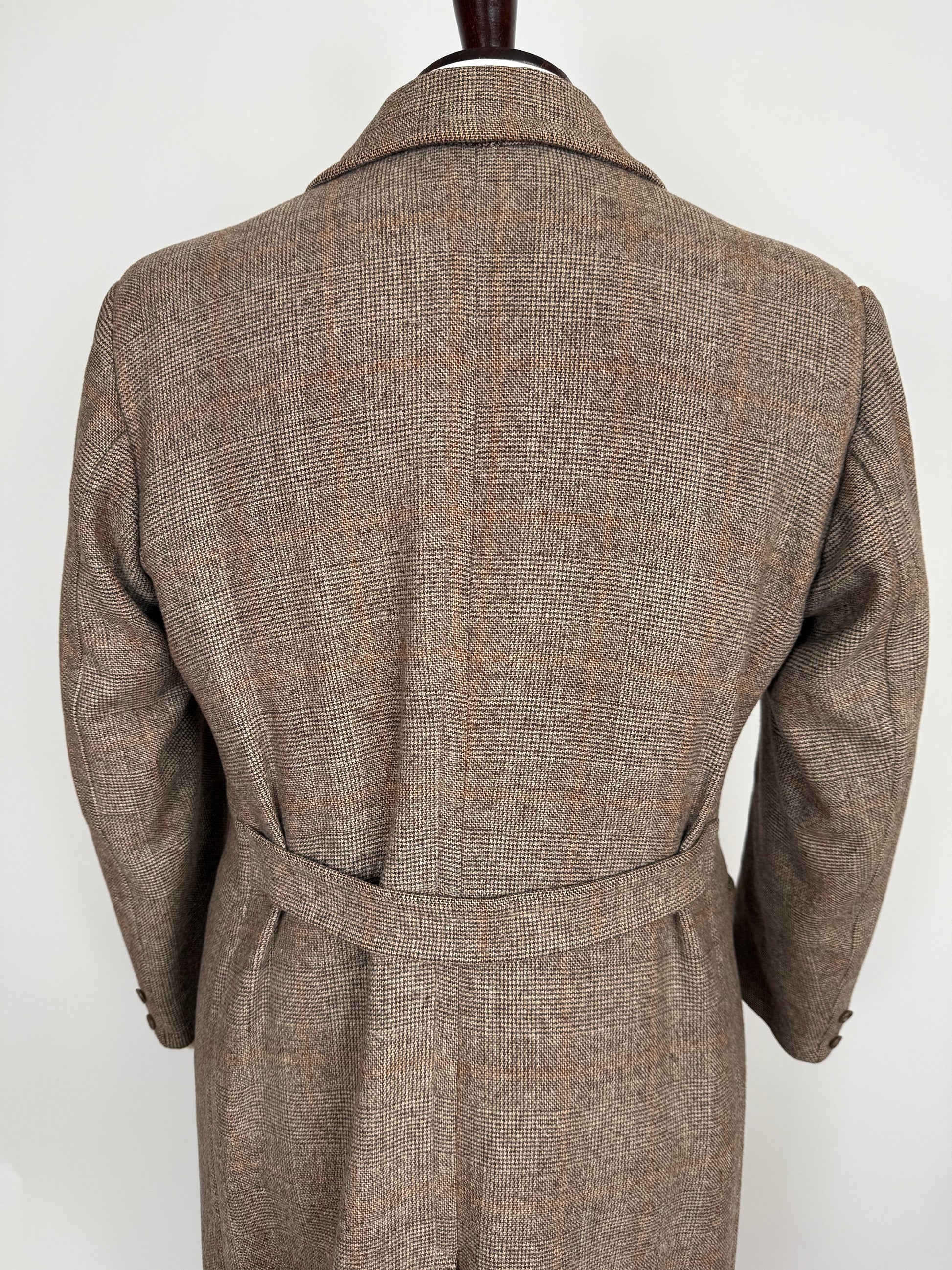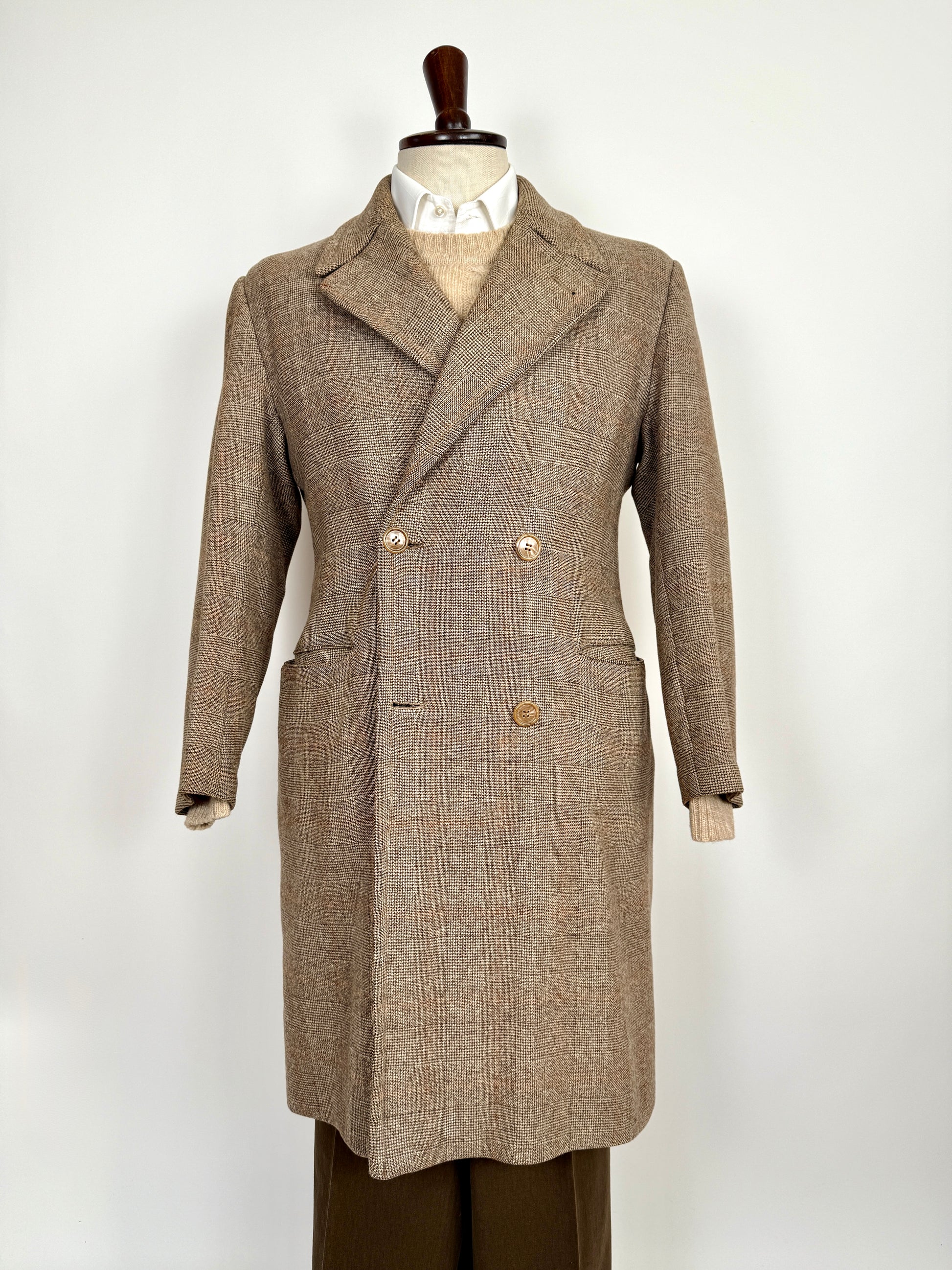 Stupendo cappotto doppiopetto sartoriale degli anni ‘50/‘60, confezionato con un tessuto in pura lana finemente cardata fantasia glen check (principe di Galles). Colore marrone tabacco con fantasia finestrata arancio-ruggine.