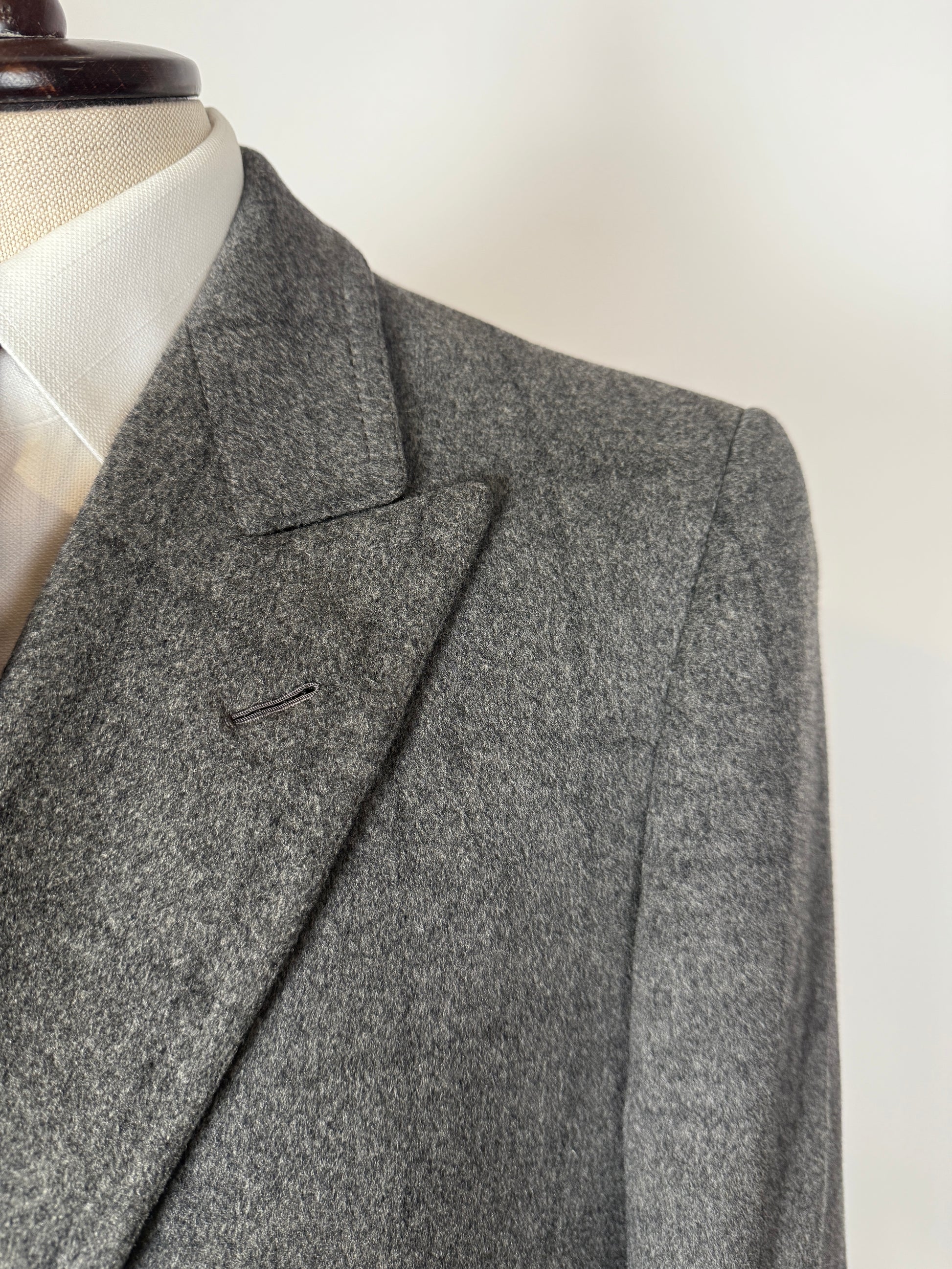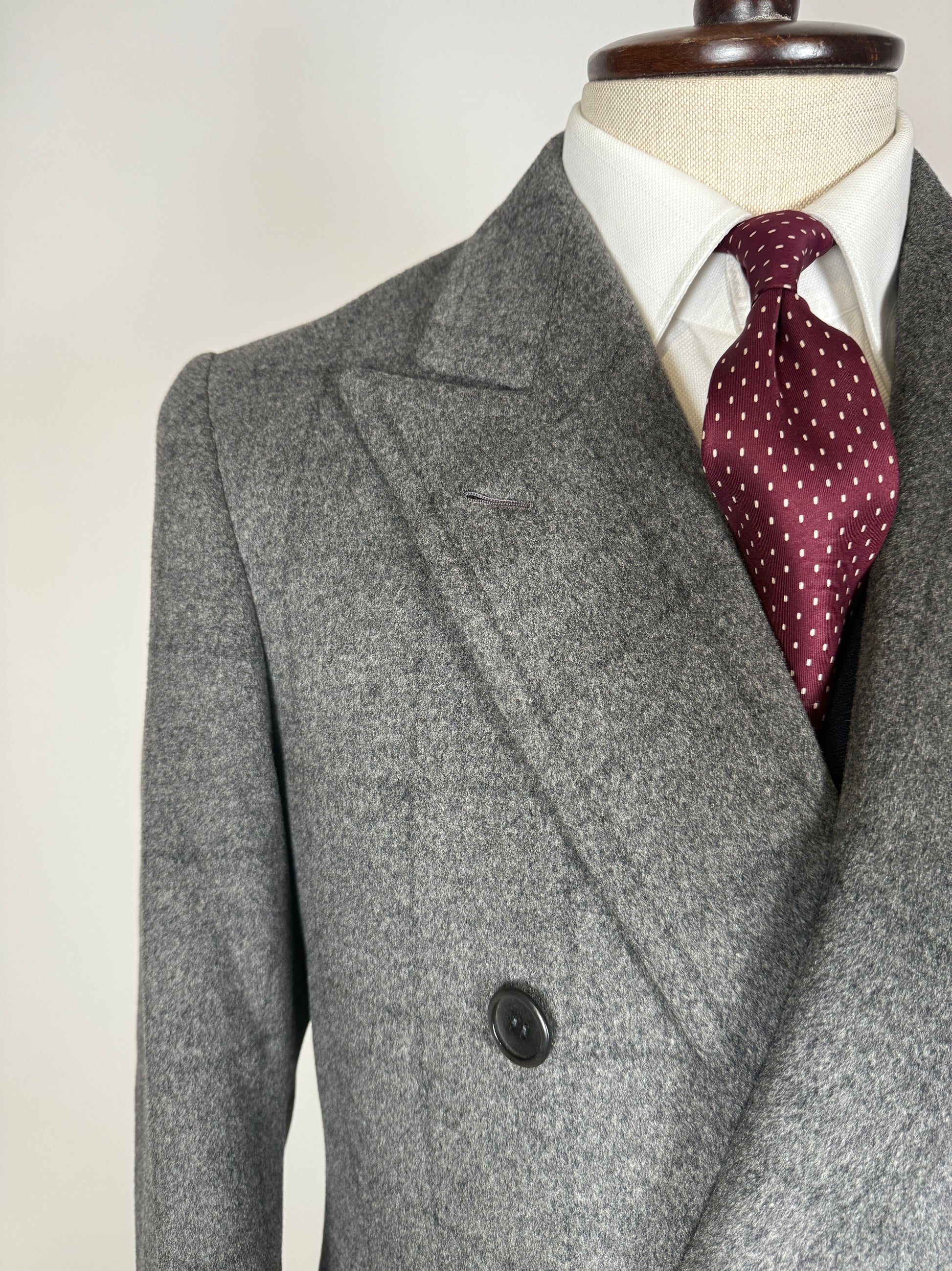 Taglio doppiopetto tipico anni '50, con abbottonatura 6x2 e disposizione dei bottoni quasi perfettamente a colonna. Revers a lancia con doppio occhiello, asole tutte fatte a mano, tasche con pattina e spacco posteriore.