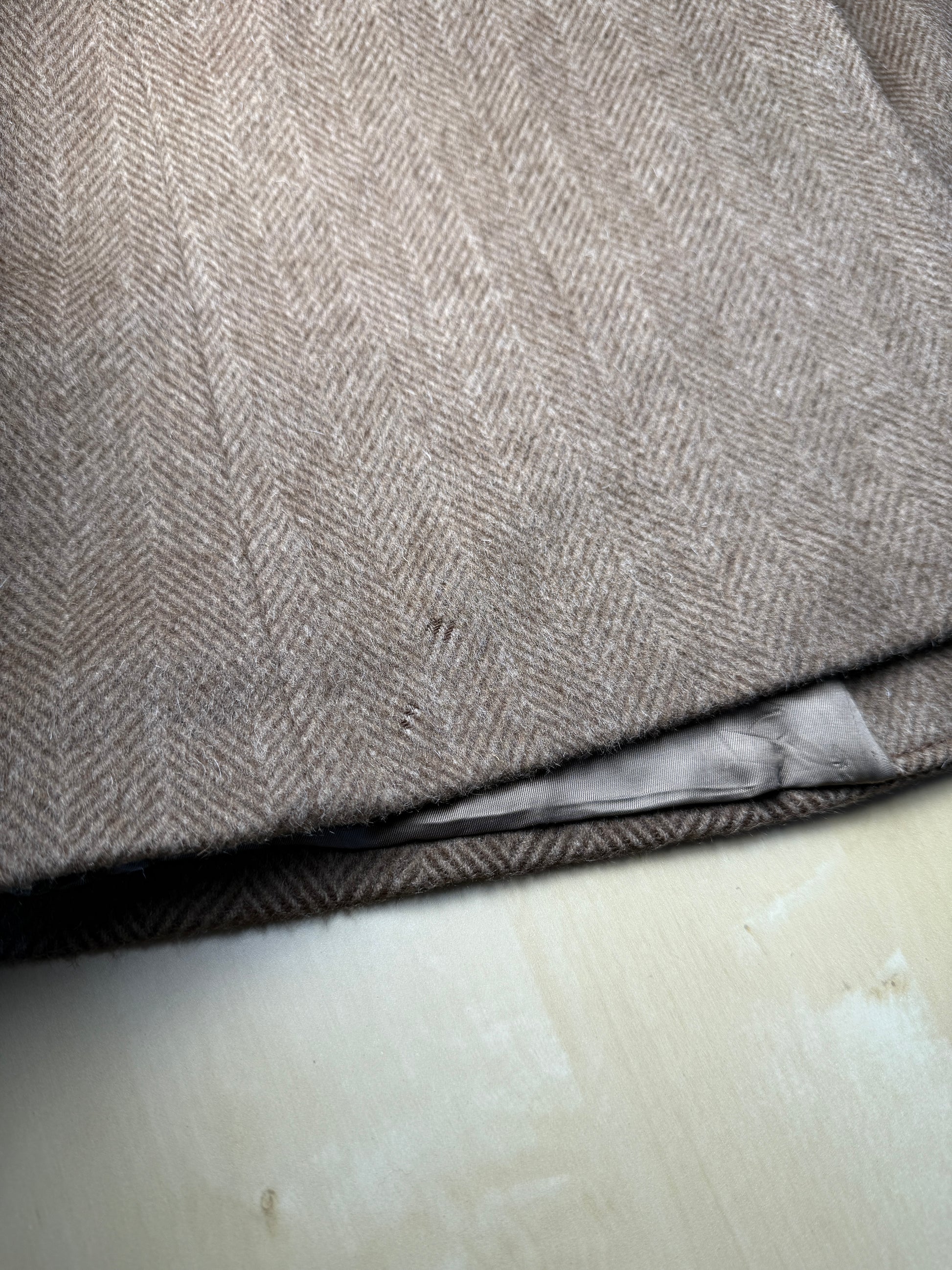 Il tessuto è una pesante lana con trama herringbone, colore marrone tabacco. Non indicata la composizione: si direbbe pura lana, ma forse con una percentuale di lana d’alpaca a giudicare dalla mano.
