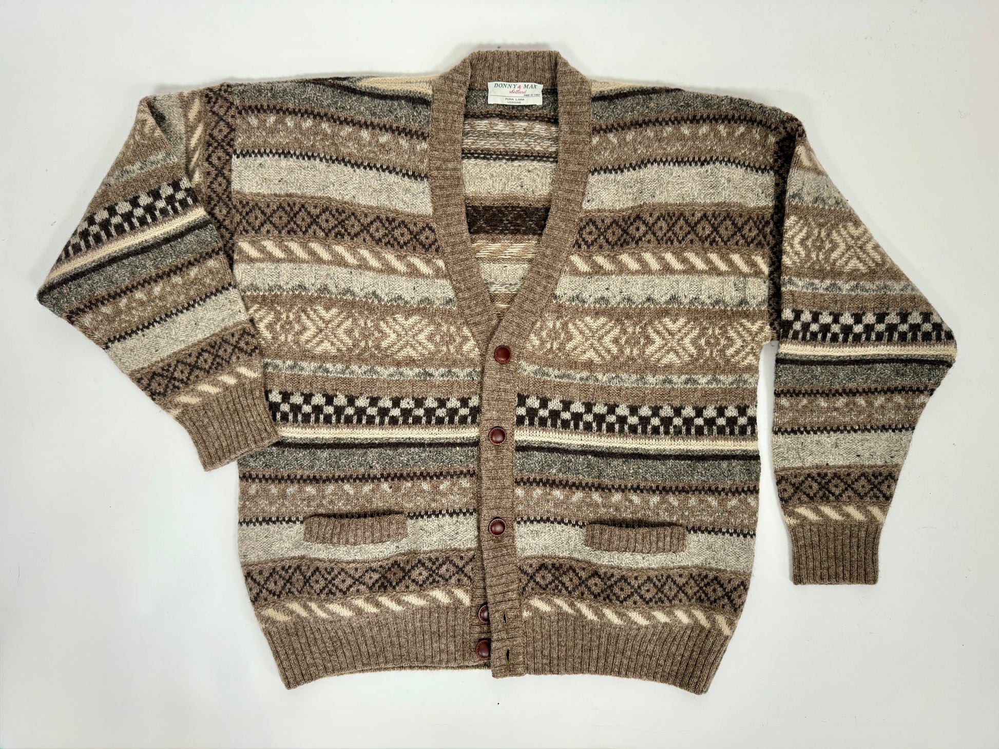 Cardigan anni ‘80 in lana Shetland fantasia geometrica - L