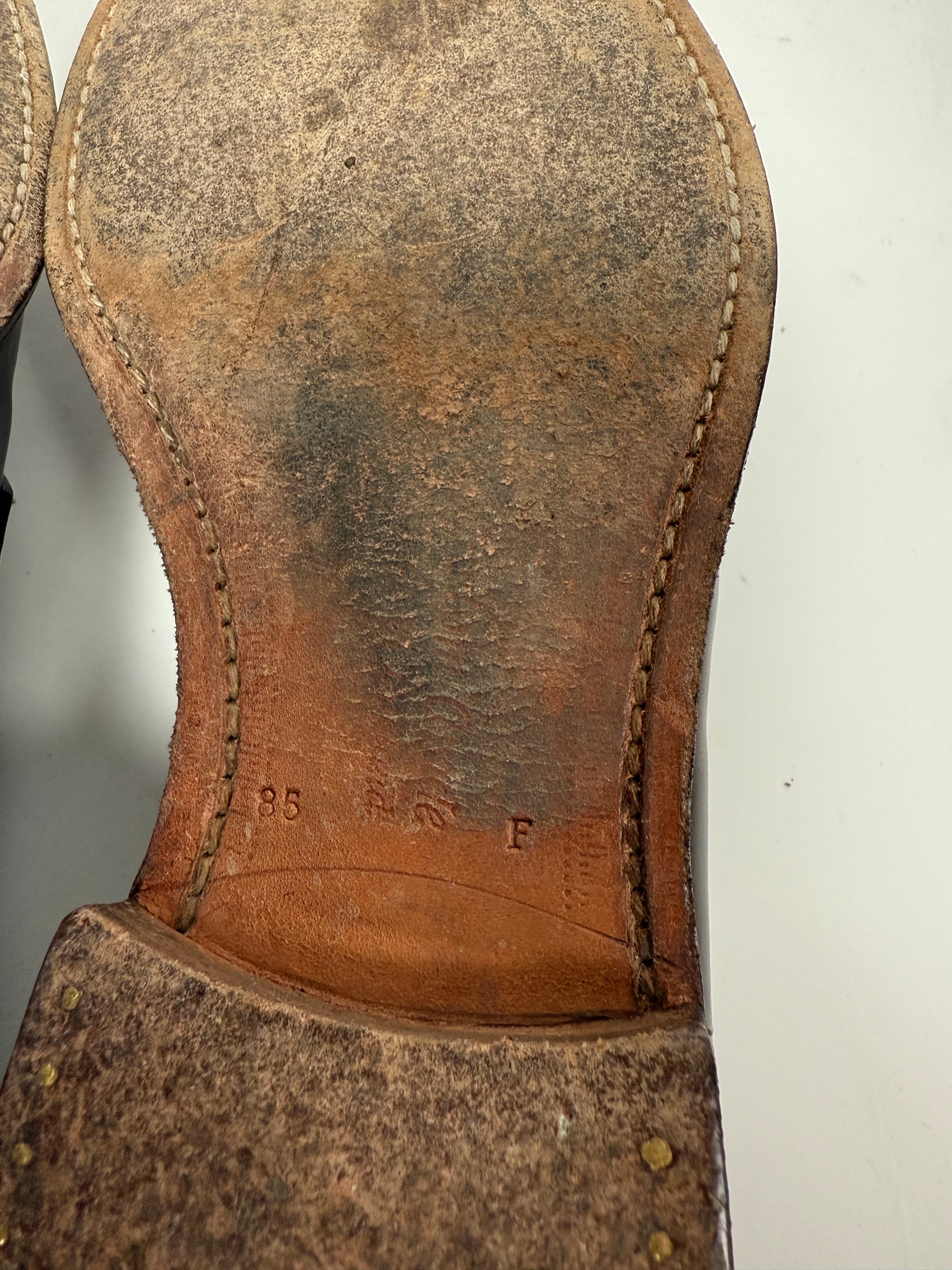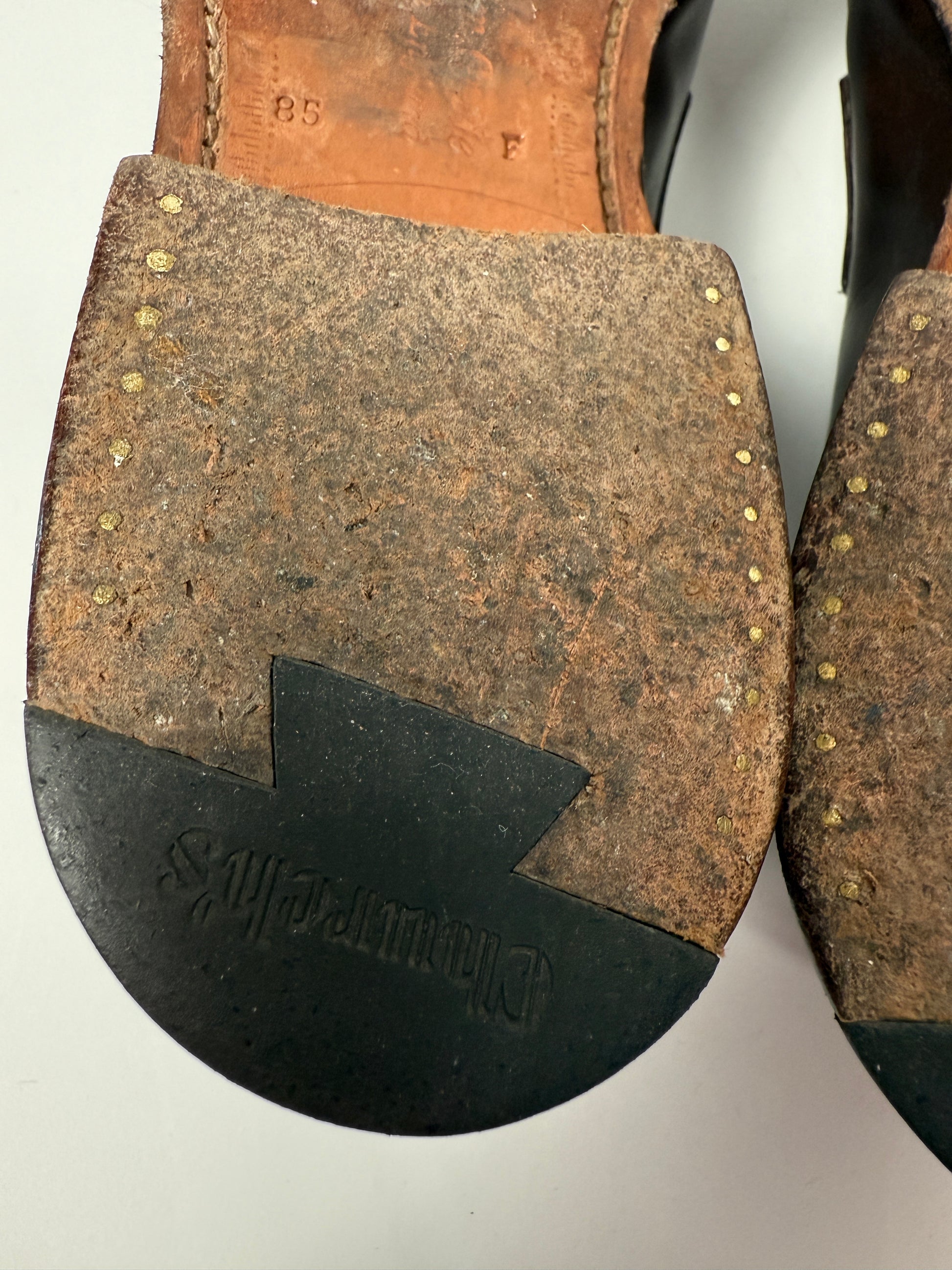 Taglia UK 8,5 (= circa 42,5), con fit F (cioè proporzioni di calzata stretta nel sistema taglie di Church’s). Ideale perciò per forme di piede dritte o affusolate.