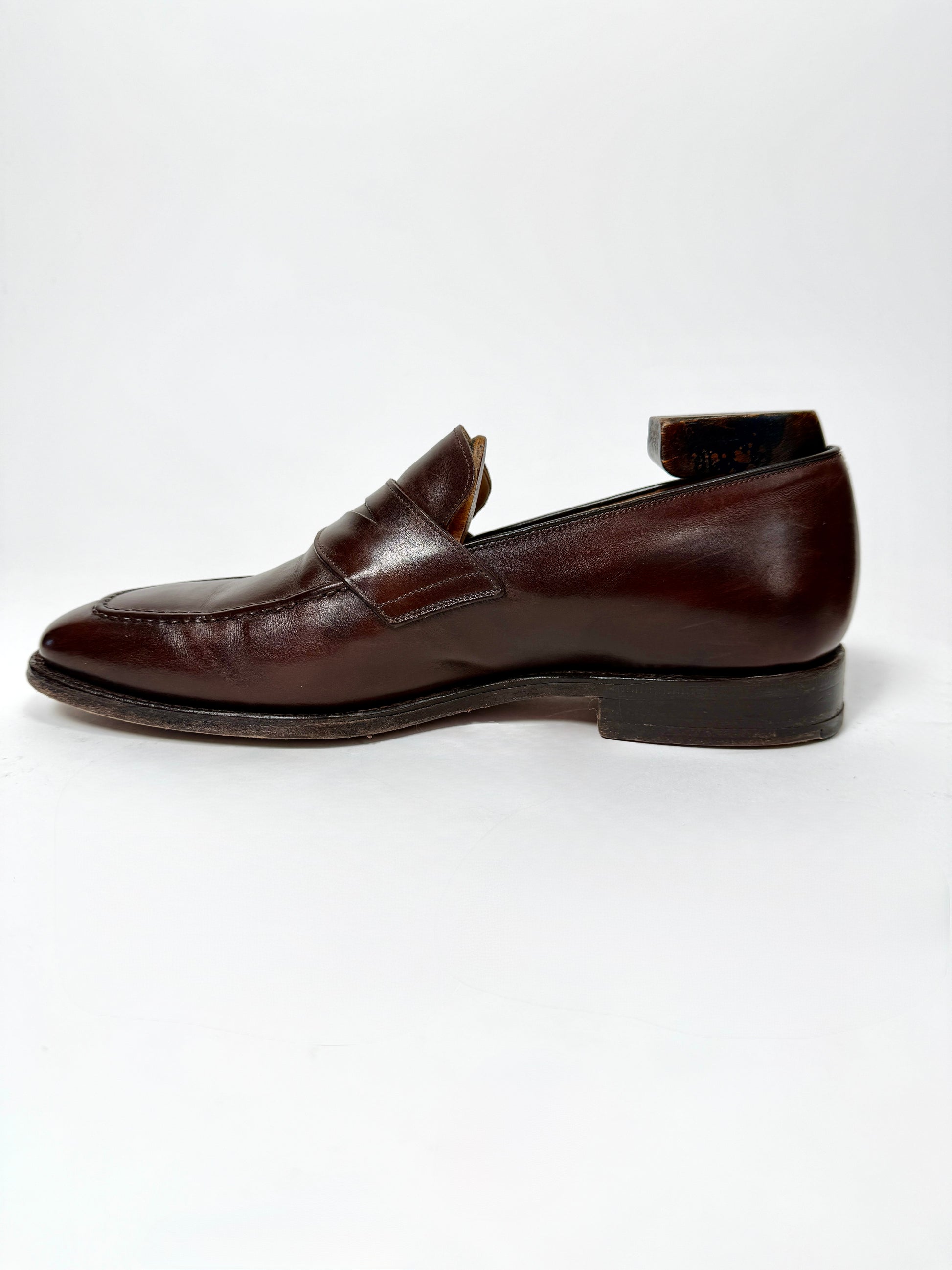 Un classico penny loafer almond shaped all’inglese, con la tipica struttura solida e profilo sobrio. Costruzione Goodyear.
