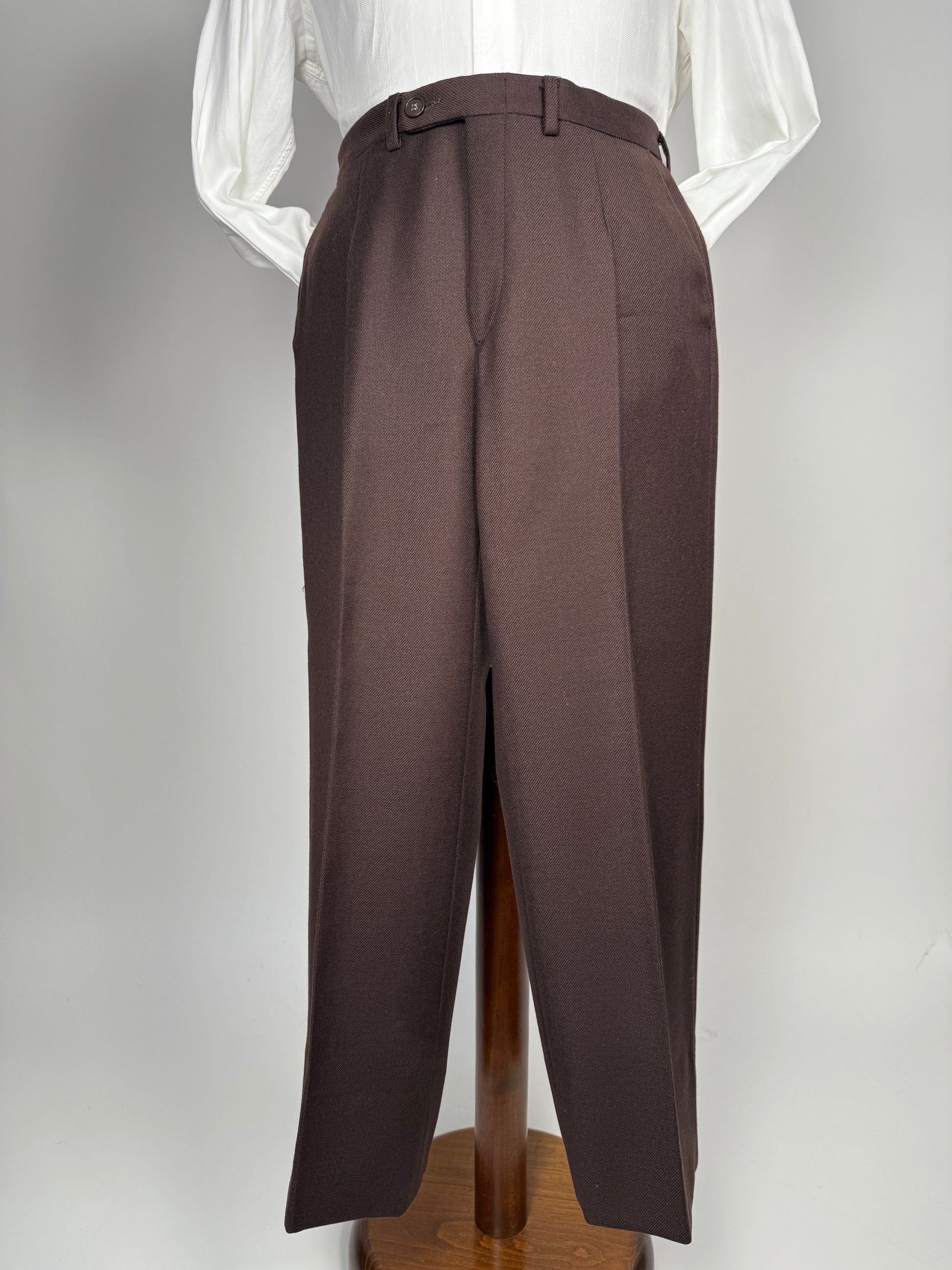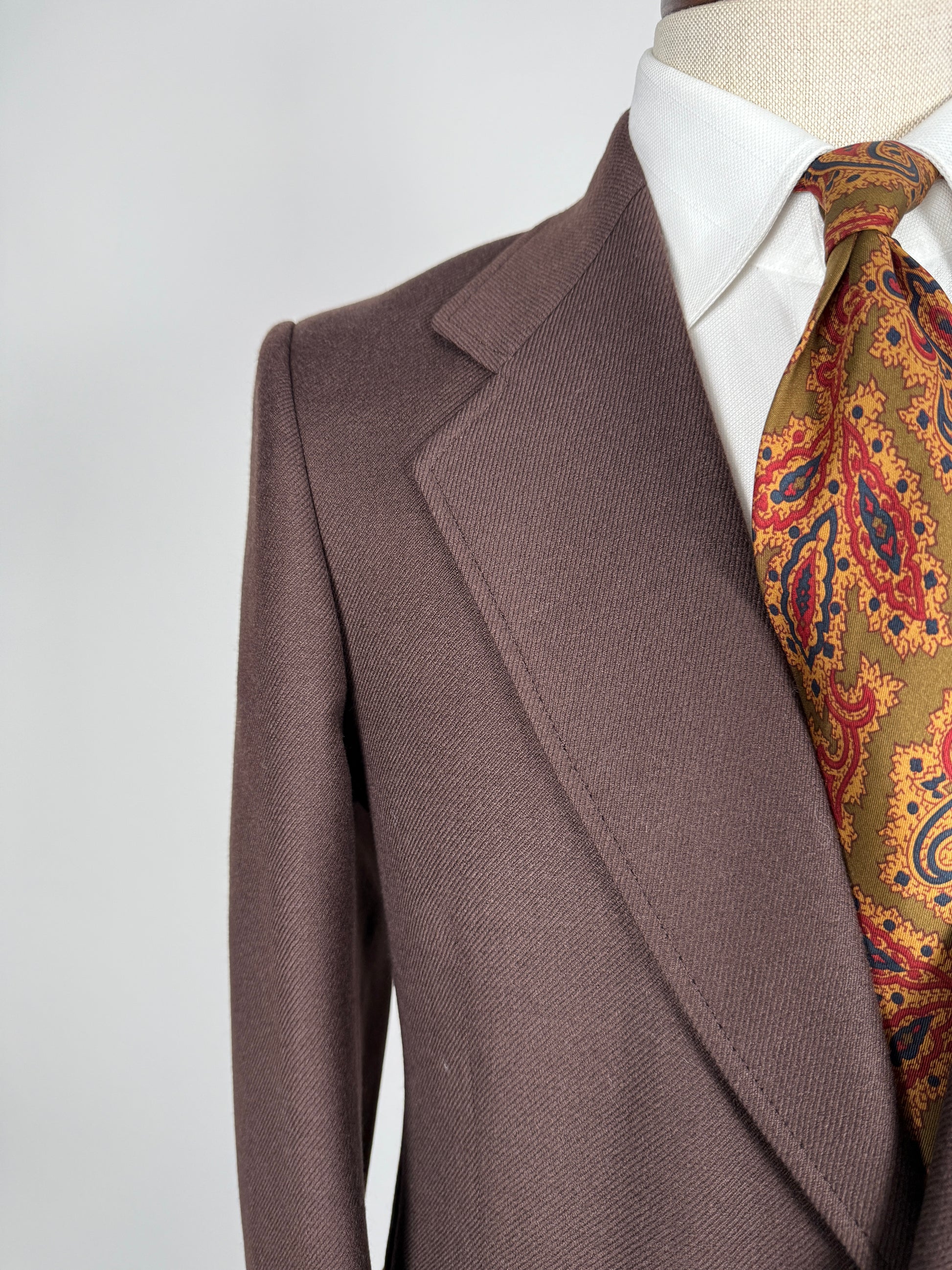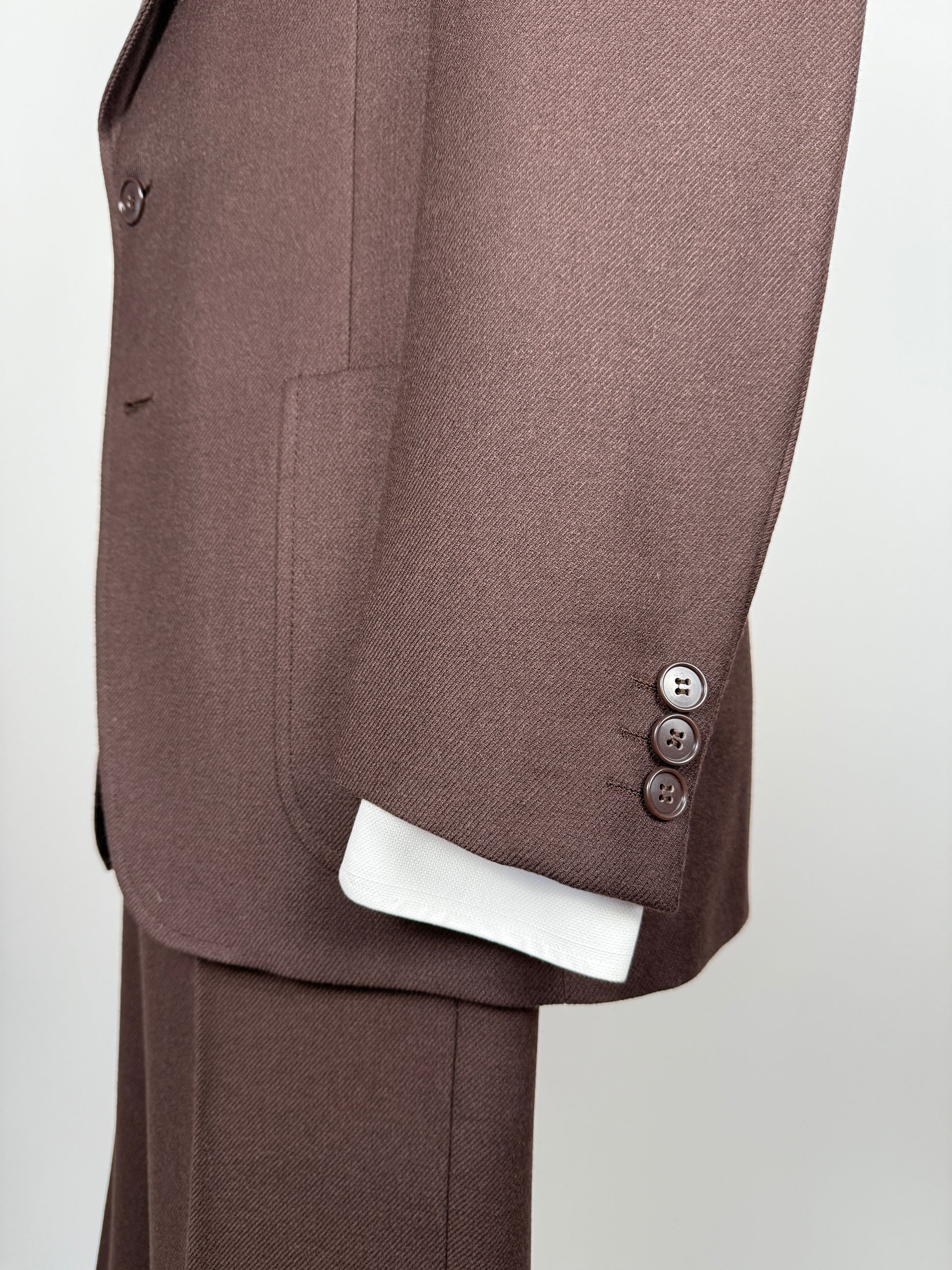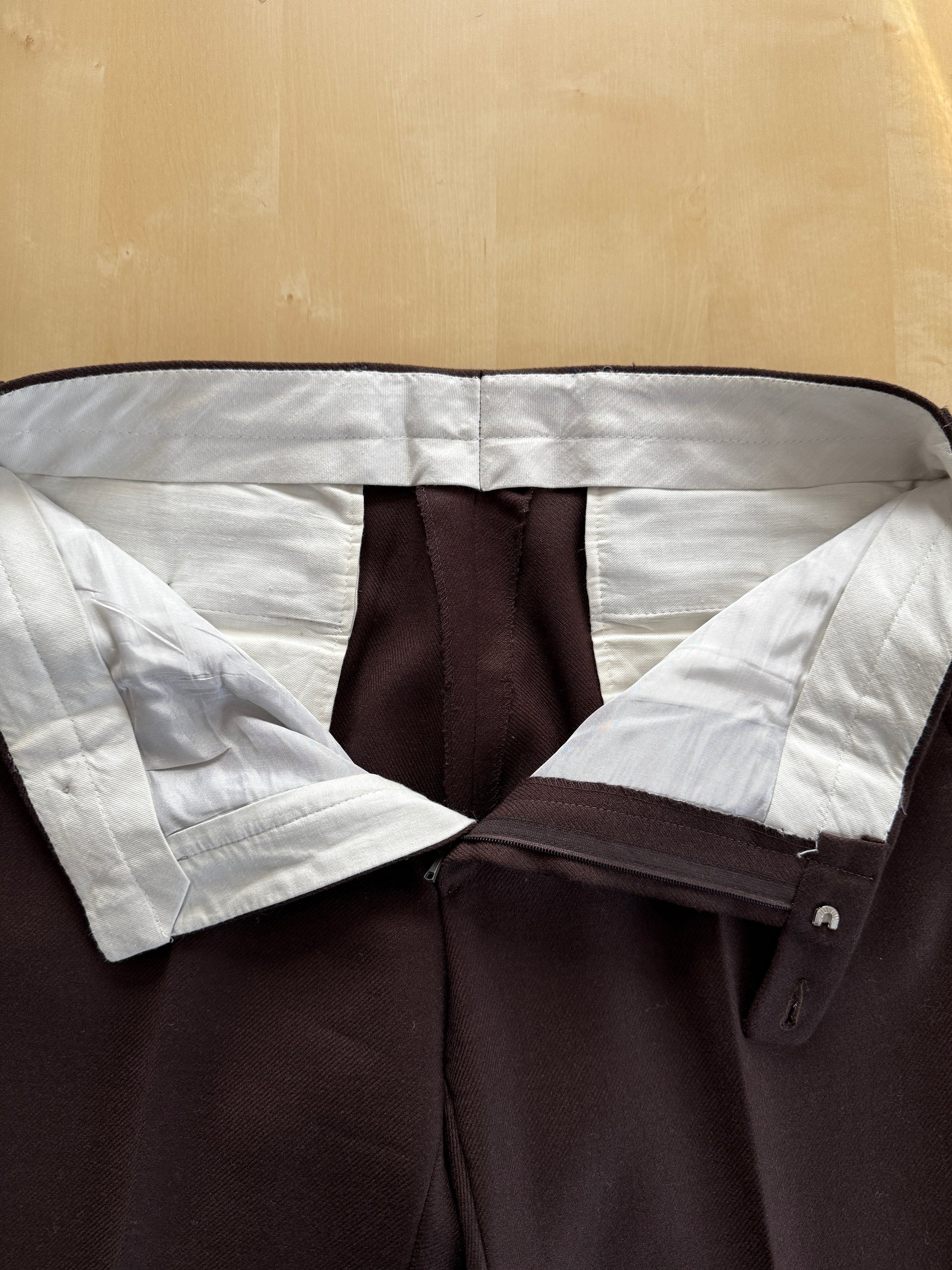 Tipica e bella confezione Marzotto dei primi anni '70, in una pesante flanella 100% lana a costa molto ampia, usatissima all'epoca su queste confezioni (praticamente un cavalry twill). Colore marrone cacao.