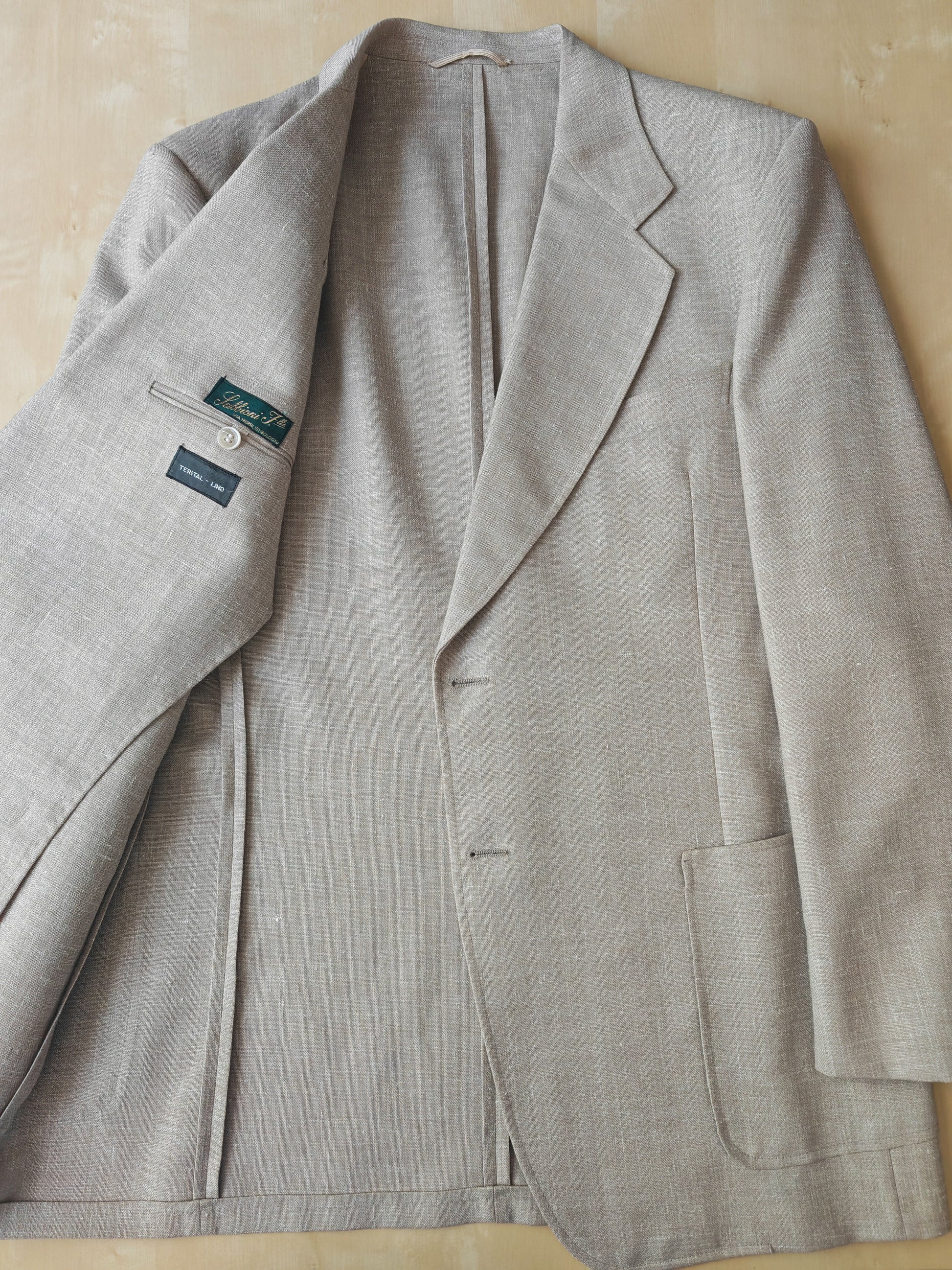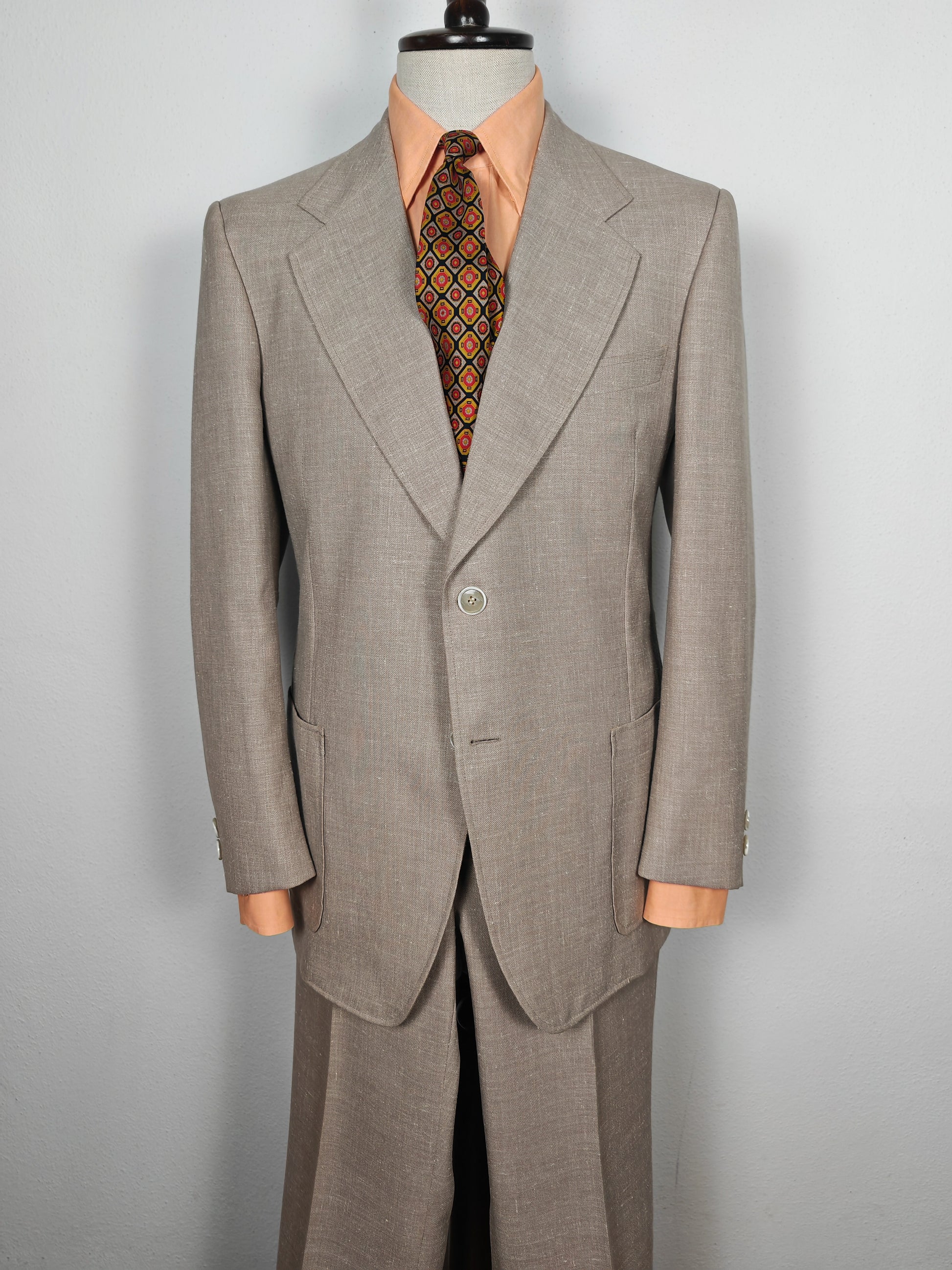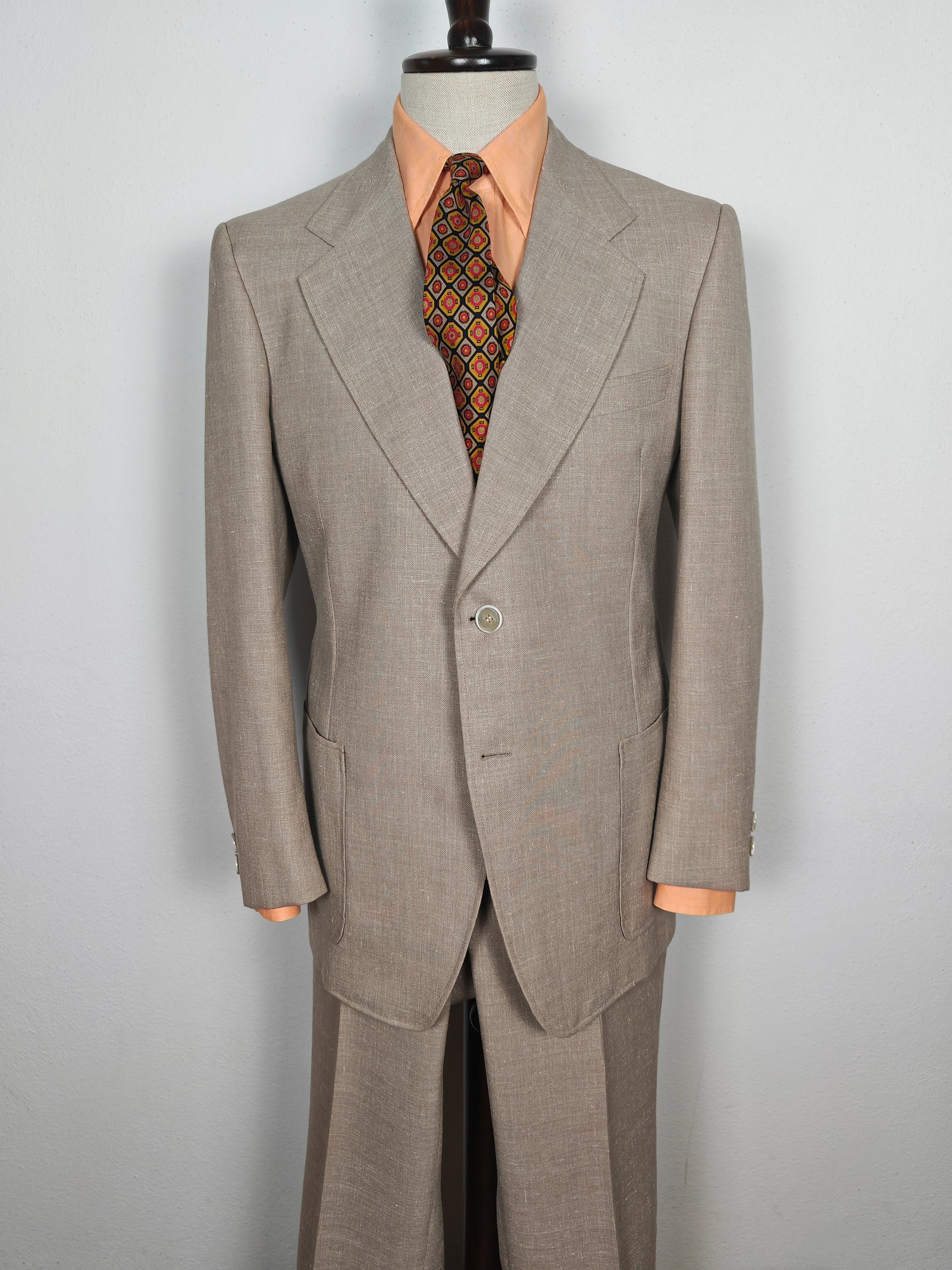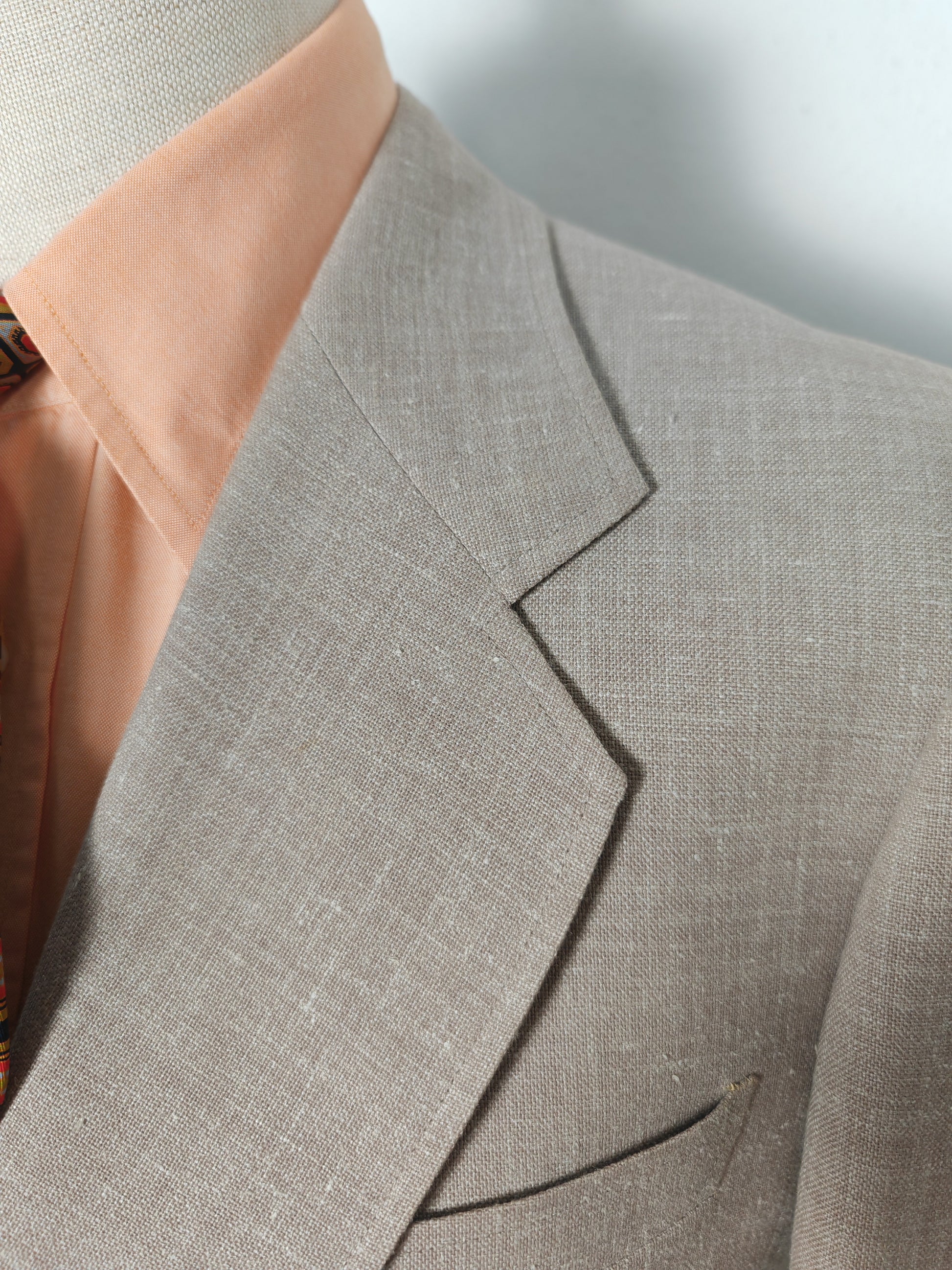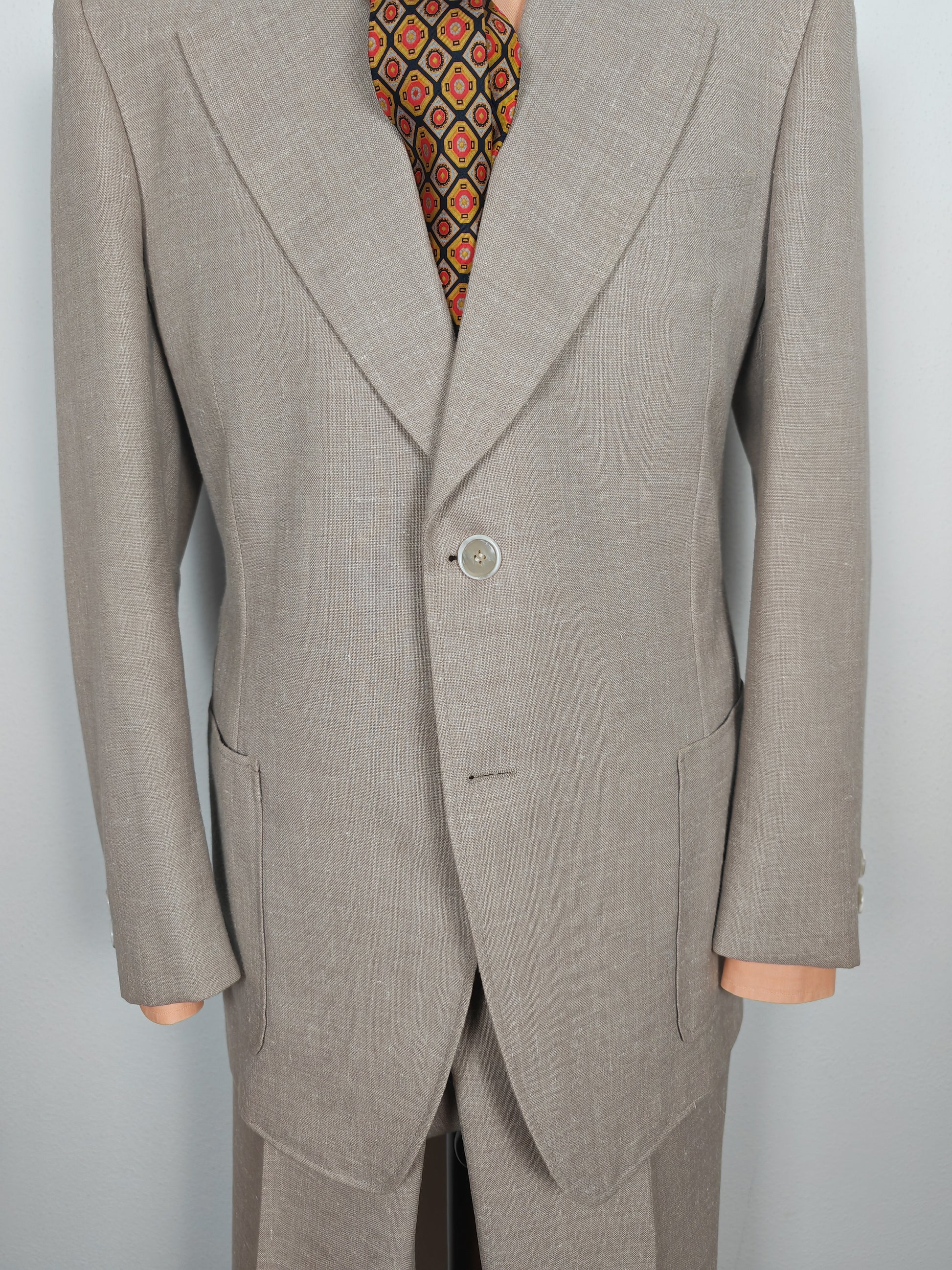 Il tessuto è una tela molto sostenuta in lino con una piccola percentuale di sintetico (terital). Nonostante la composizione in parte sintetica (peraltro tipica degli anni '70 in queste mischie), l'abito ha una lavorazione di altissimo livello, con ottime finiture e giacca completamente intelata full canvas e sfoderata: questo garantisce comunque grande comodità, traspirabilità e freschezza al capo.
