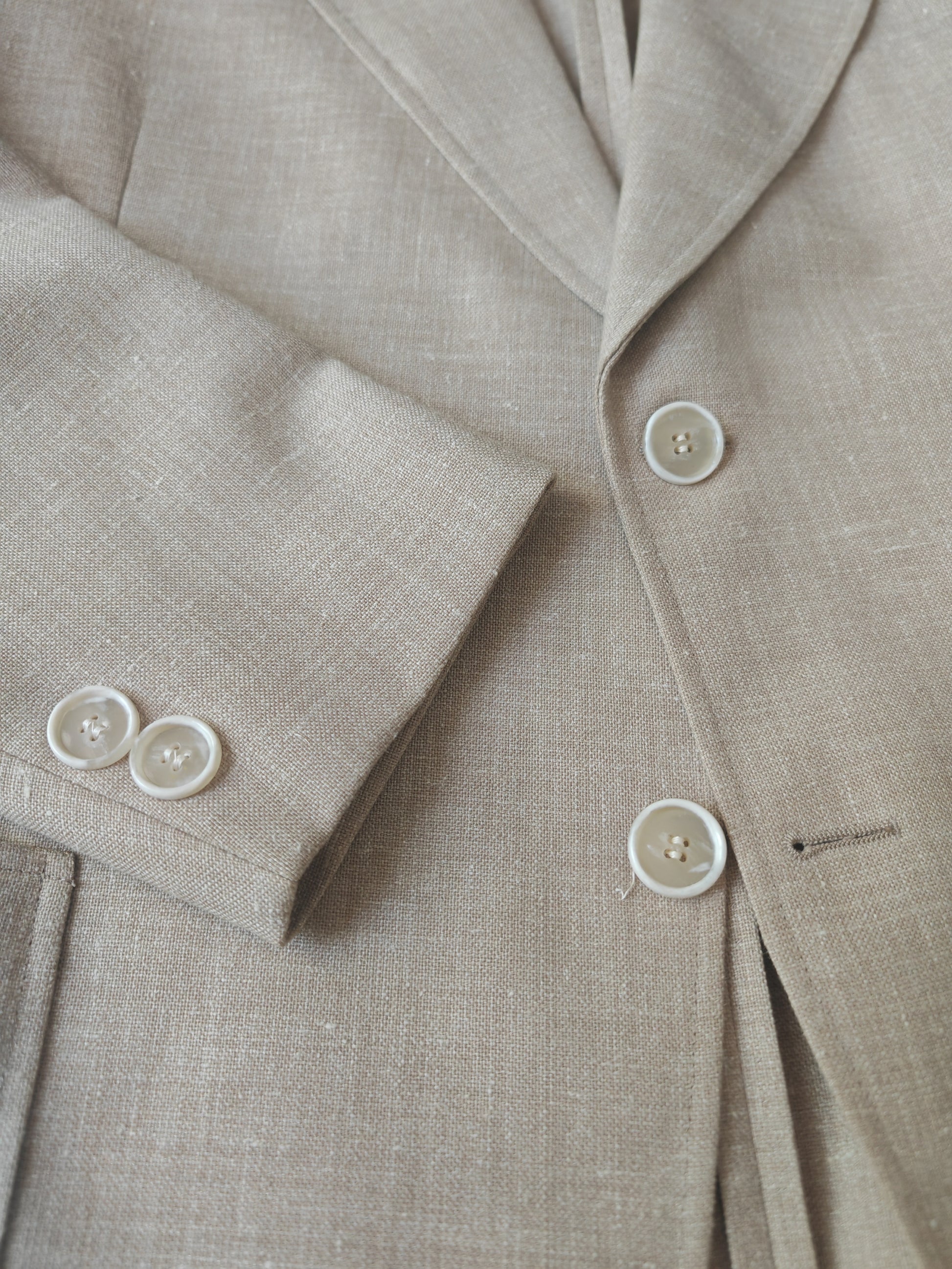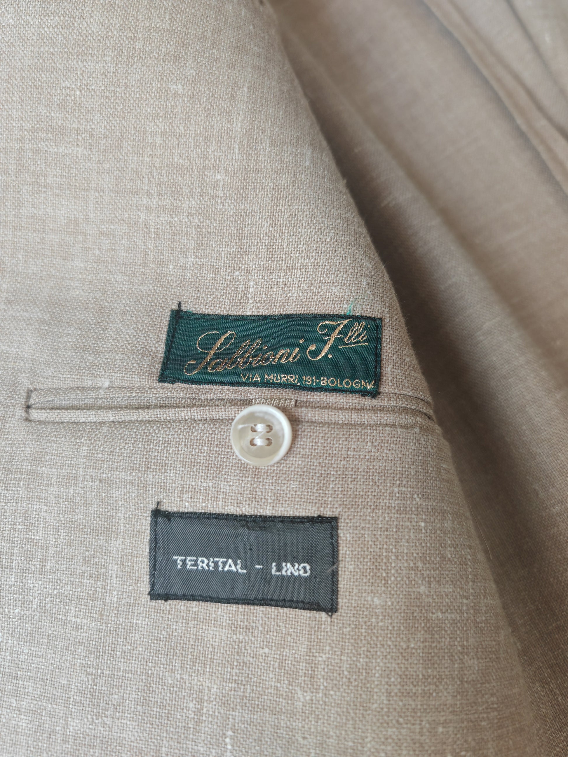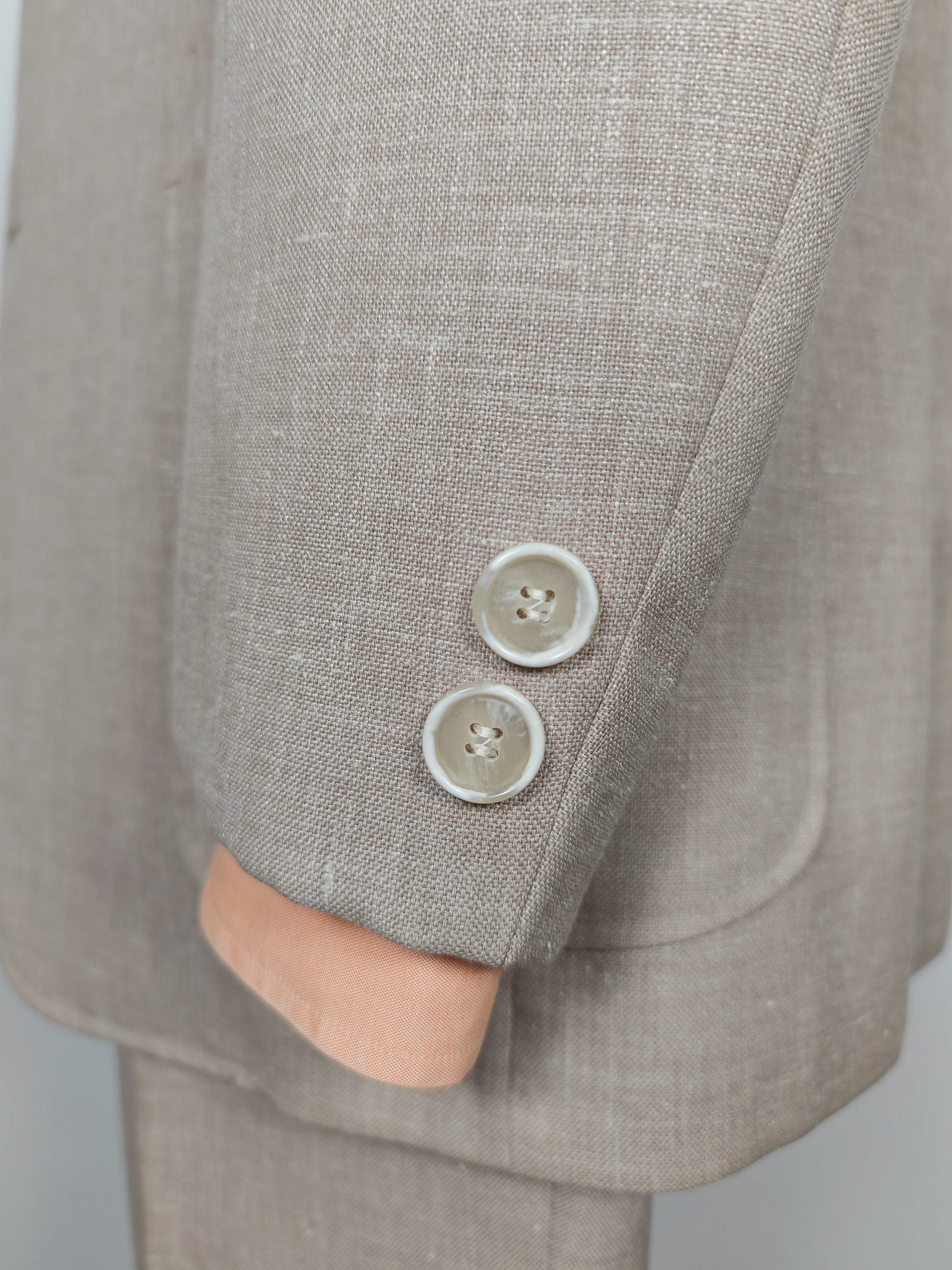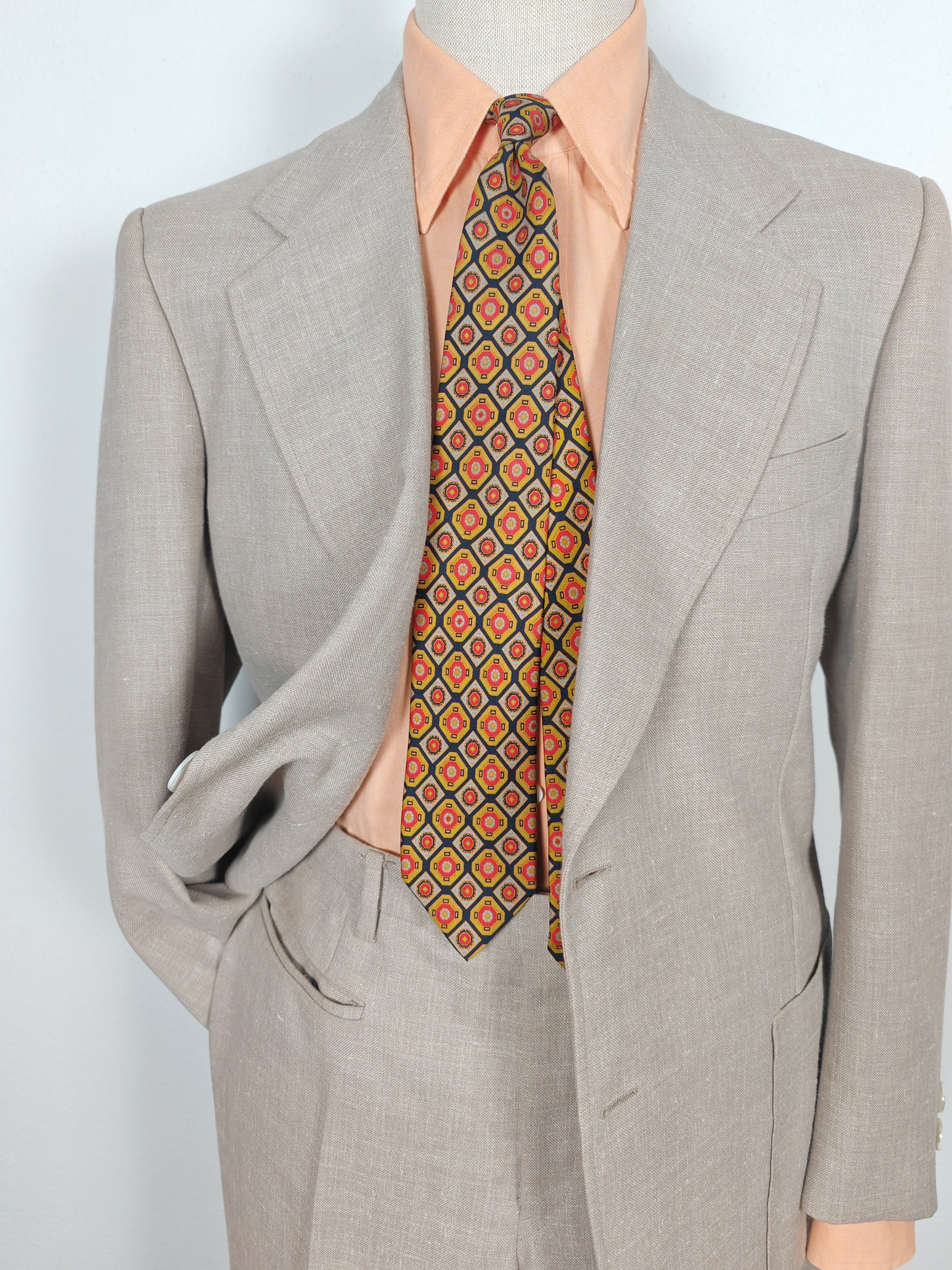 Il tessuto è una tela molto sostenuta in lino con una piccola percentuale di sintetico (terital). Nonostante la composizione in parte sintetica (peraltro tipica degli anni '70 in queste mischie), l'abito ha una lavorazione di altissimo livello, con ottime finiture e giacca completamente intelata full canvas e sfoderata: questo garantisce comunque grande comodità, traspirabilità e freschezza al capo.