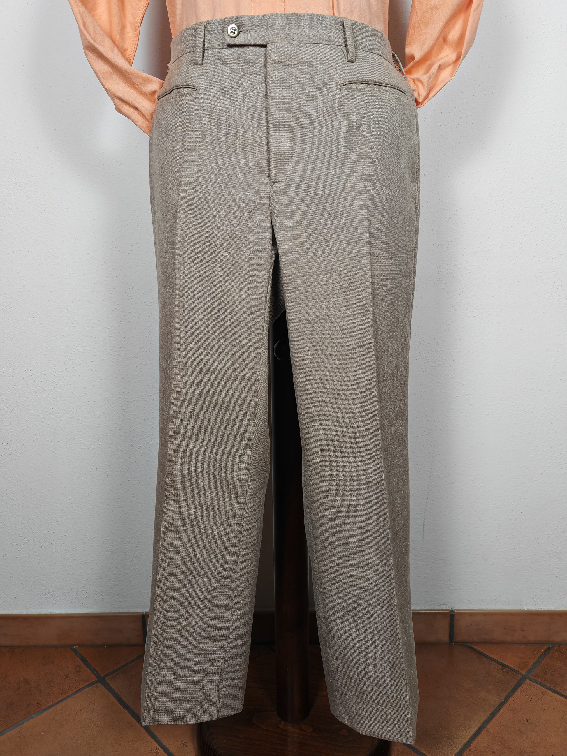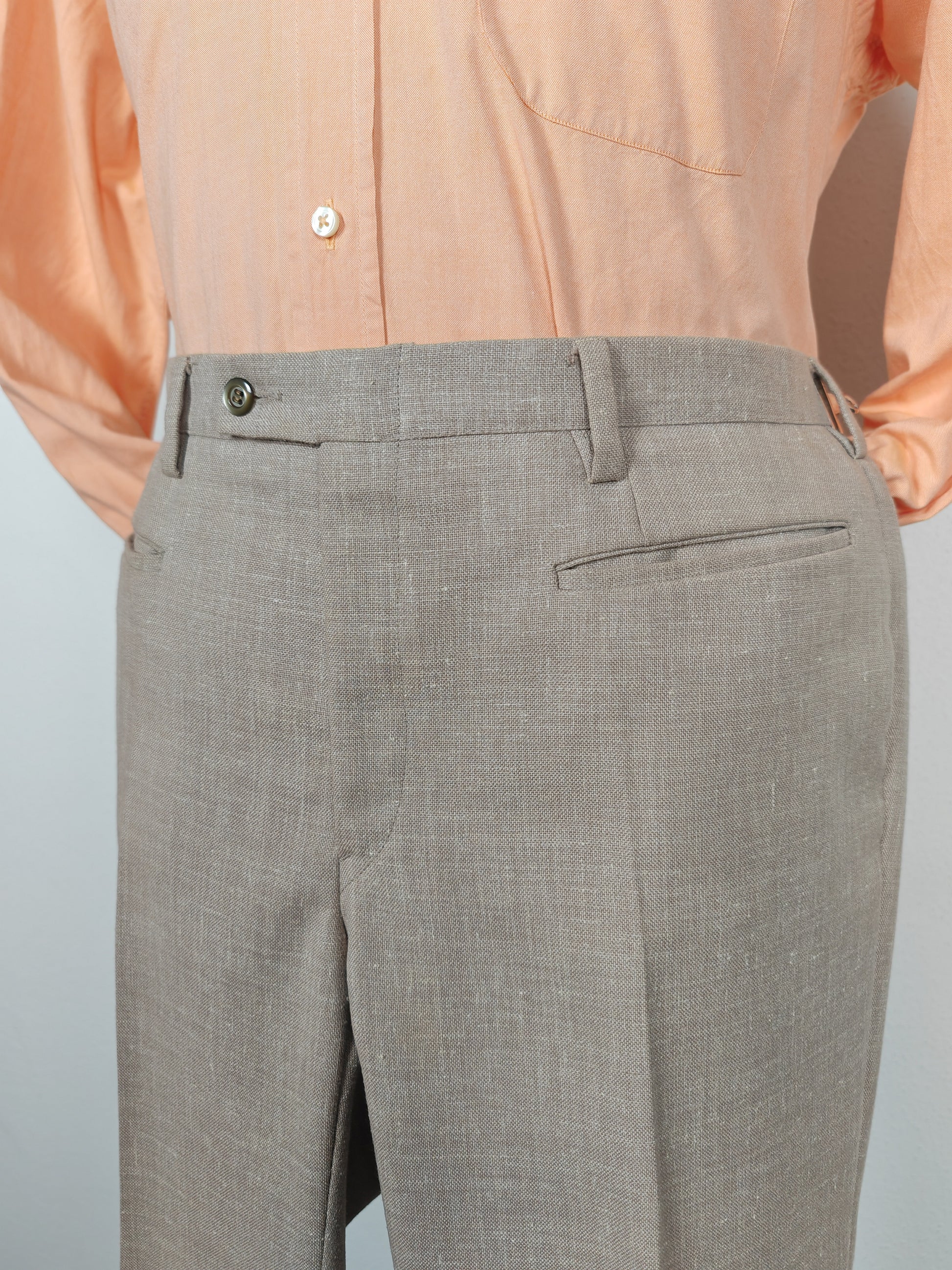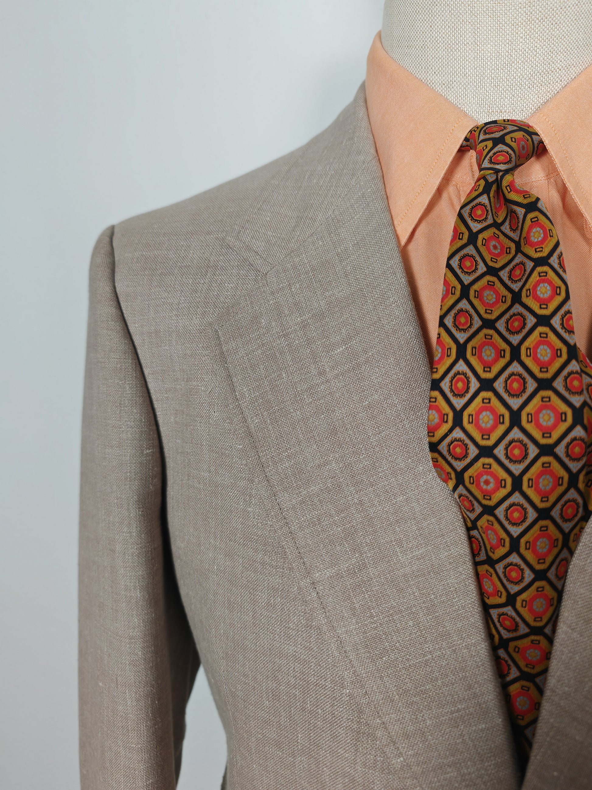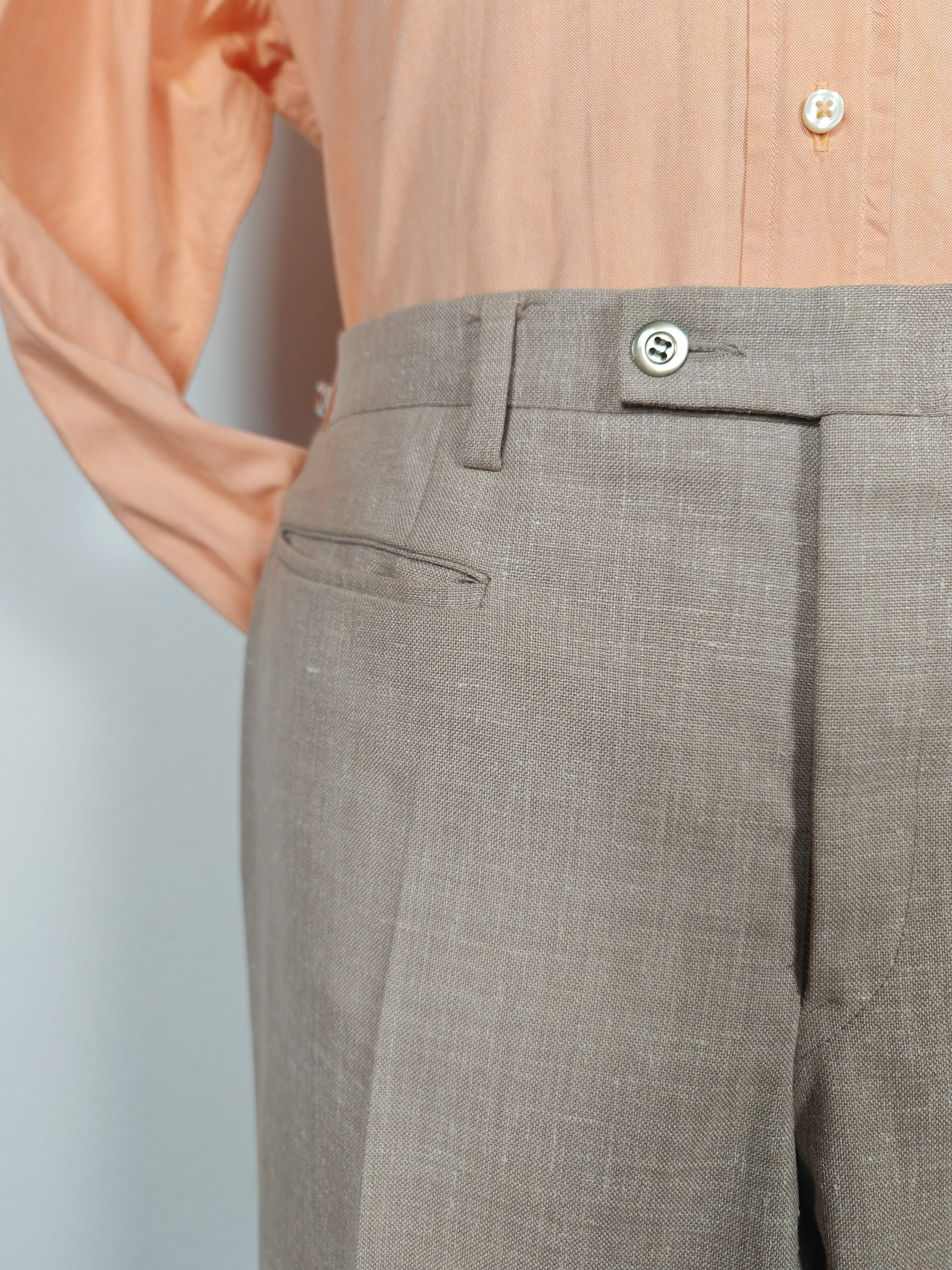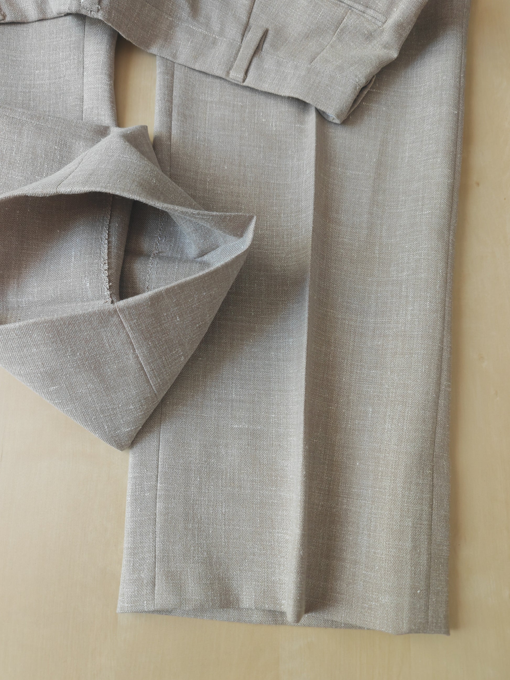 Il tessuto è una tela molto sostenuta in lino con una piccola percentuale di sintetico (terital). Nonostante la composizione in parte sintetica (peraltro tipica degli anni '70 in queste mischie), l'abito ha una lavorazione di altissimo livello, con ottime finiture e giacca completamente intelata full canvas e sfoderata: questo garantisce comunque grande comodità, traspirabilità e freschezza al capo.