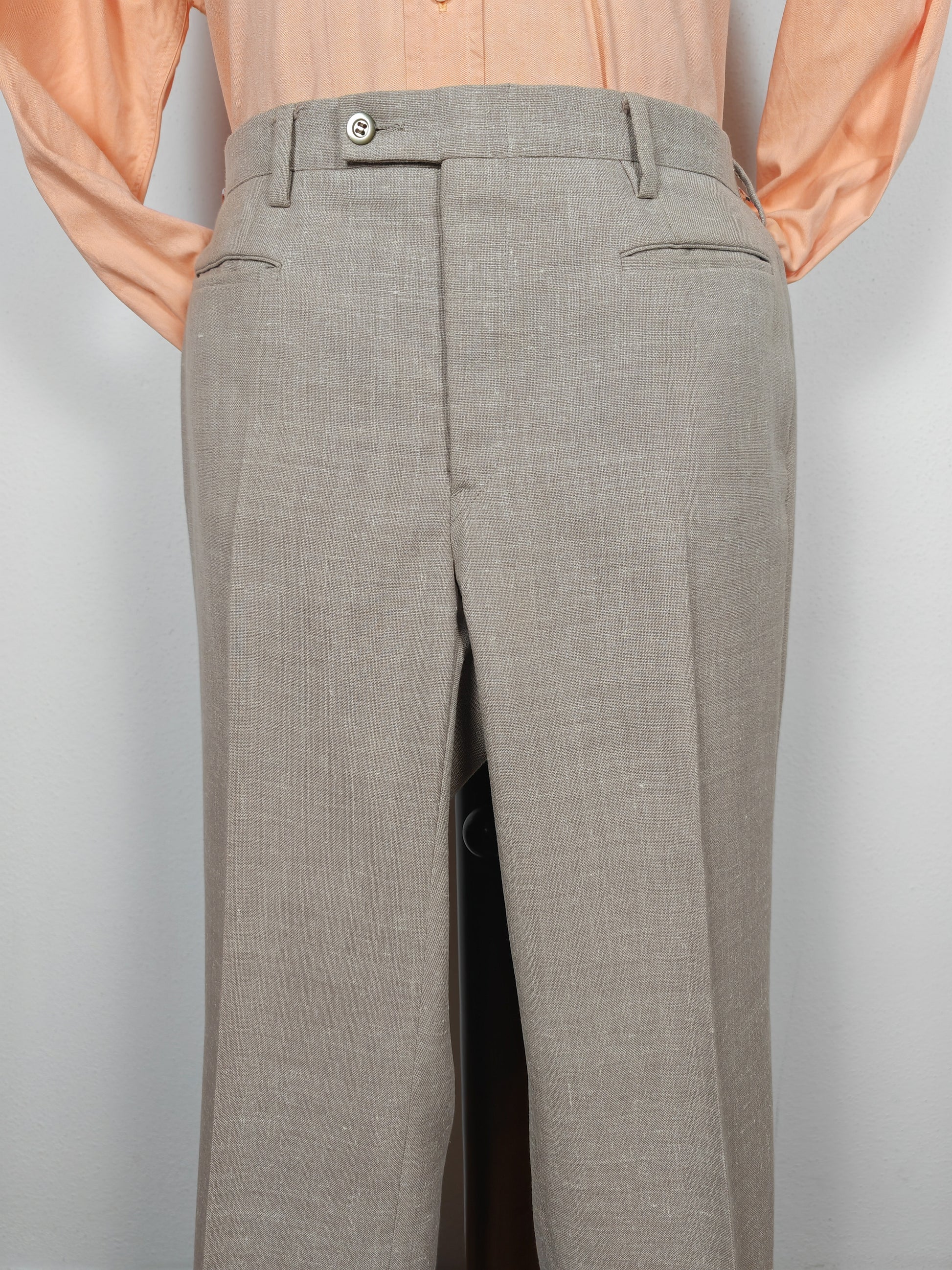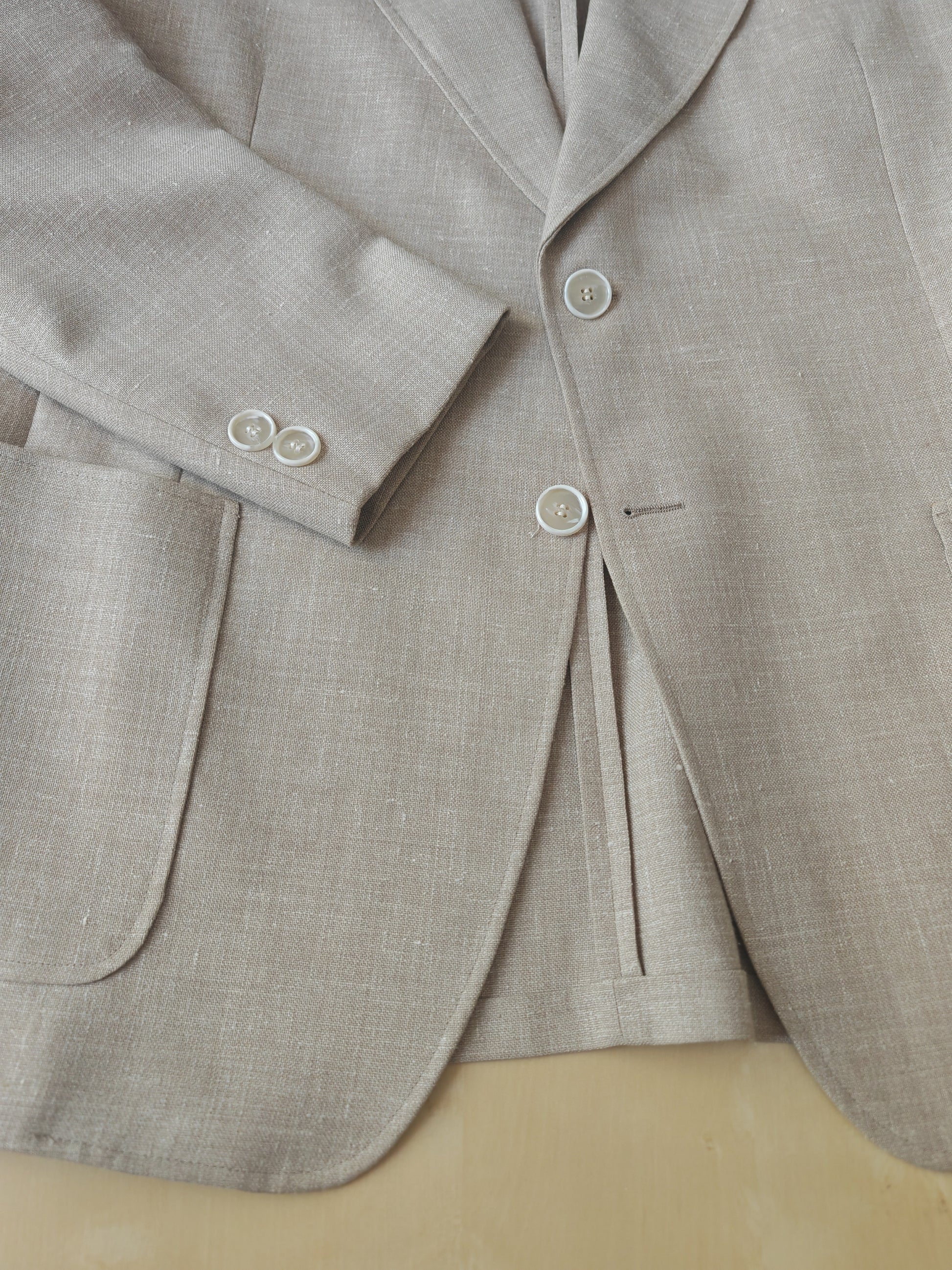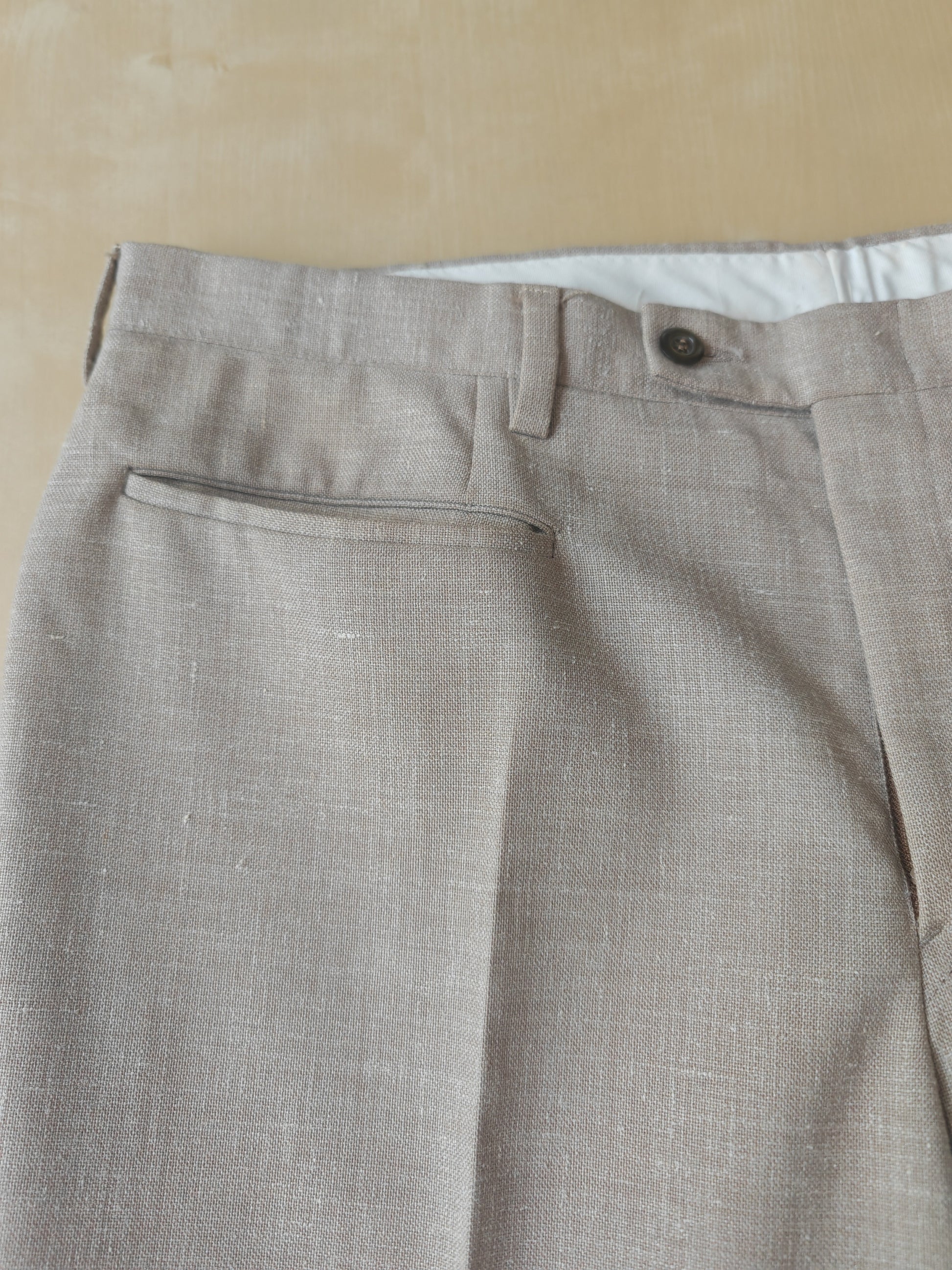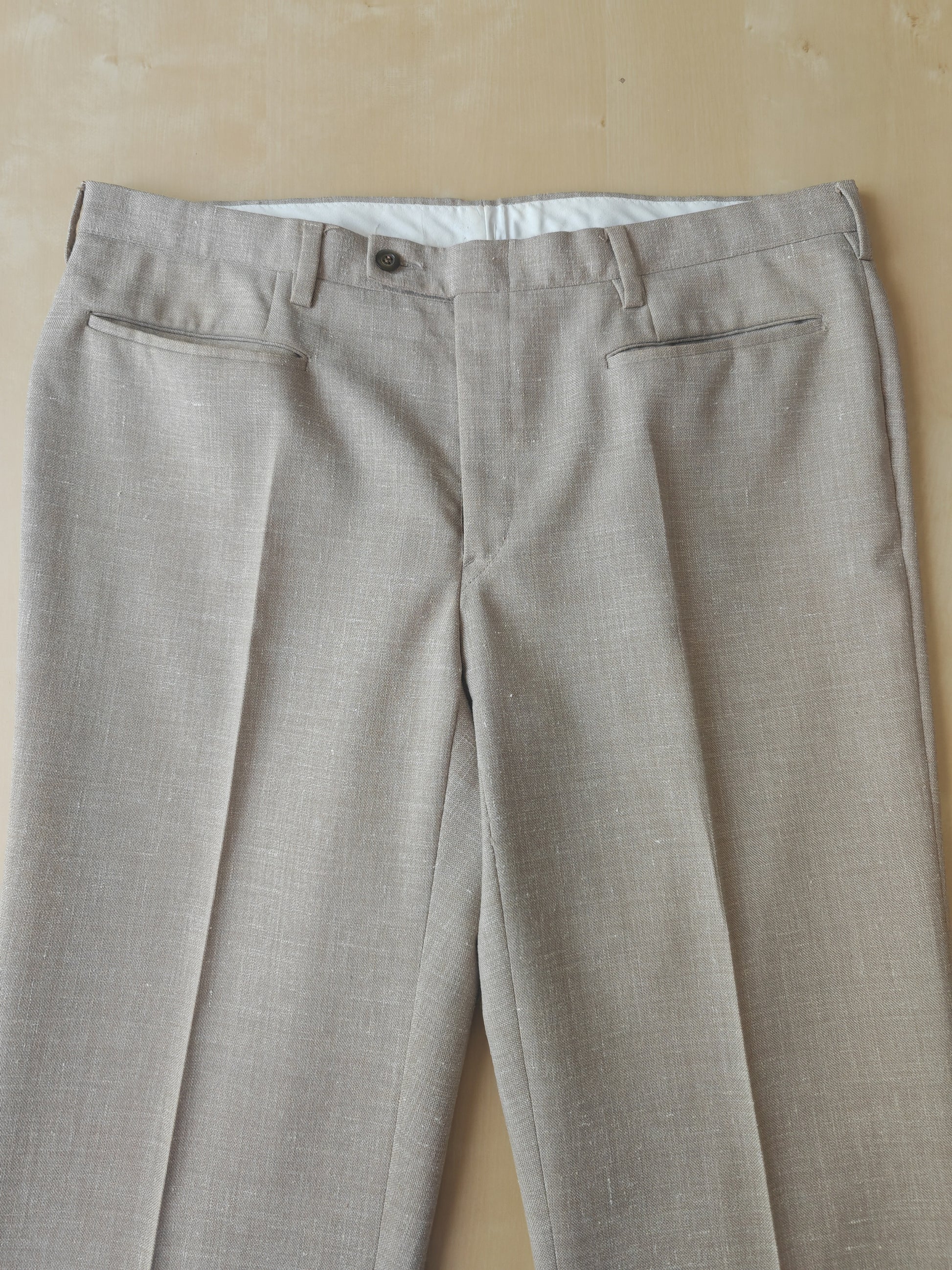 Il tessuto è una tela molto sostenuta in lino con una piccola percentuale di sintetico (terital). Nonostante la composizione in parte sintetica (peraltro tipica degli anni '70 in queste mischie), l'abito ha una lavorazione di altissimo livello, con ottime finiture e giacca completamente intelata full canvas e sfoderata: questo garantisce comunque grande comodità, traspirabilità e freschezza al capo.