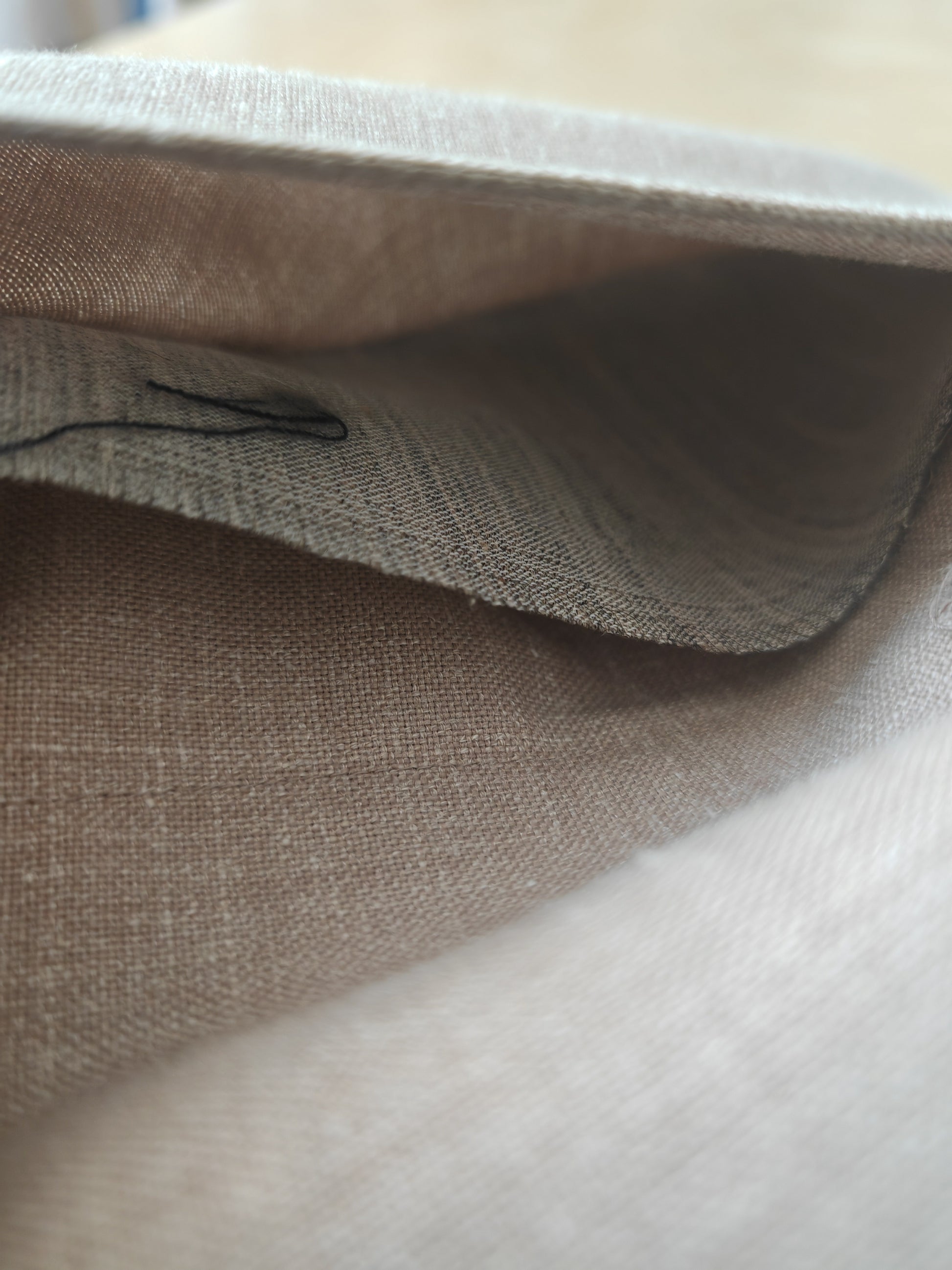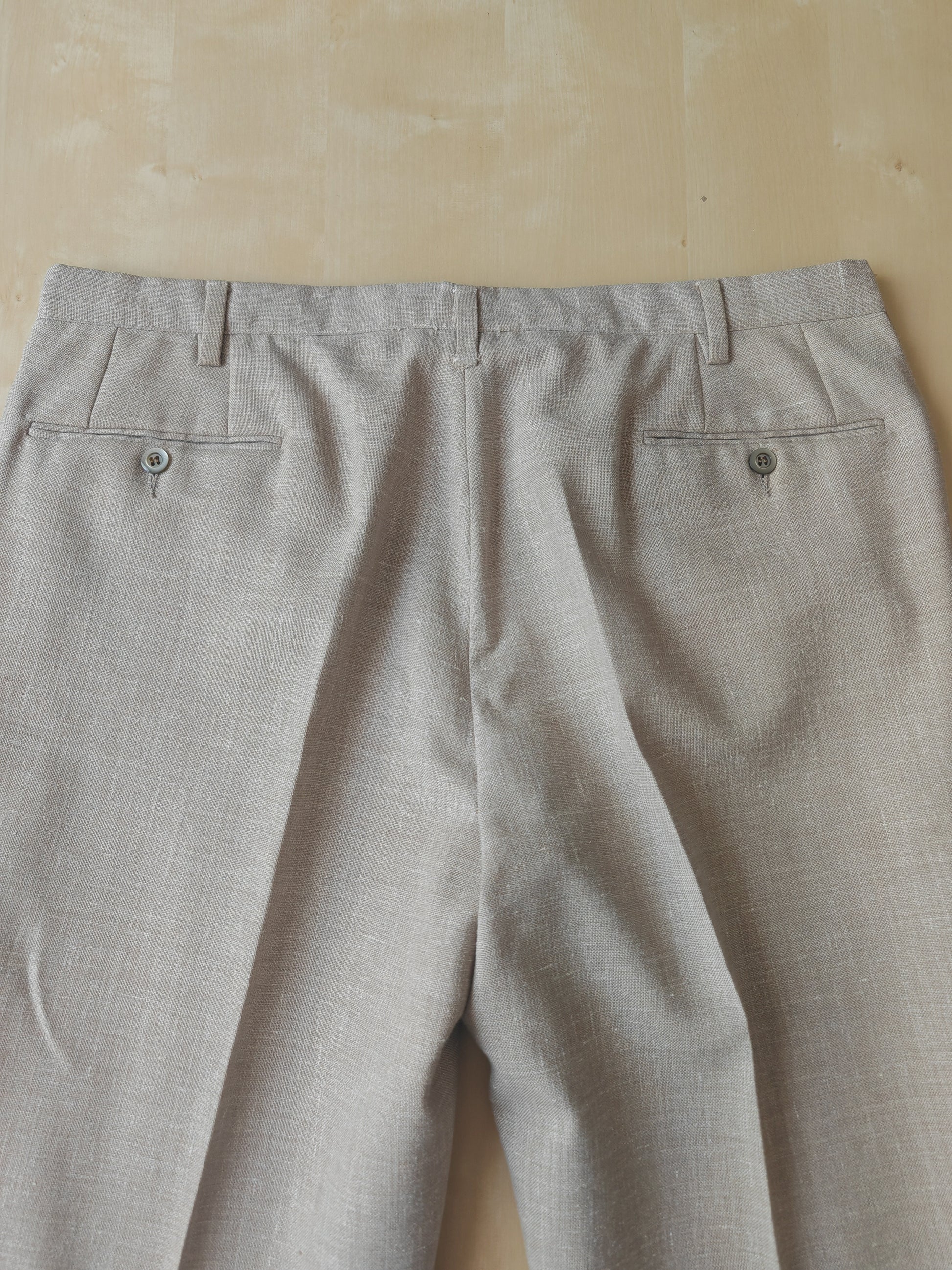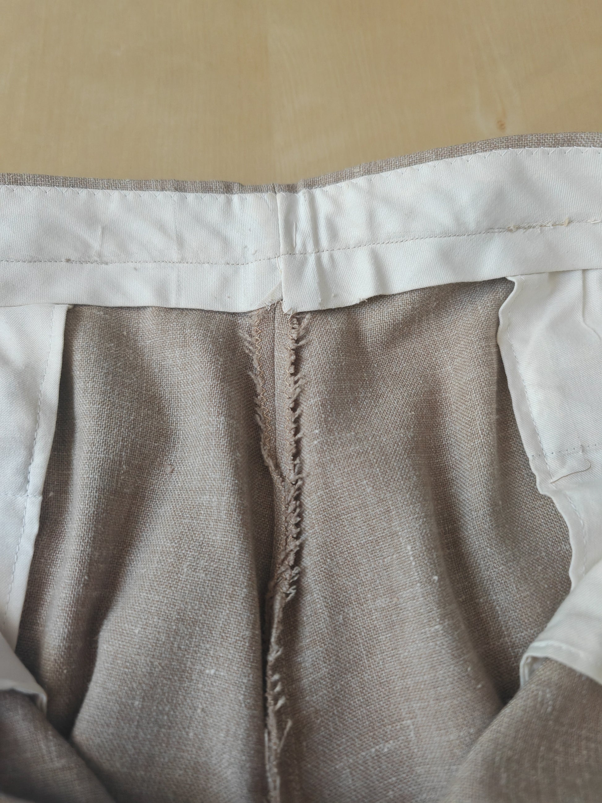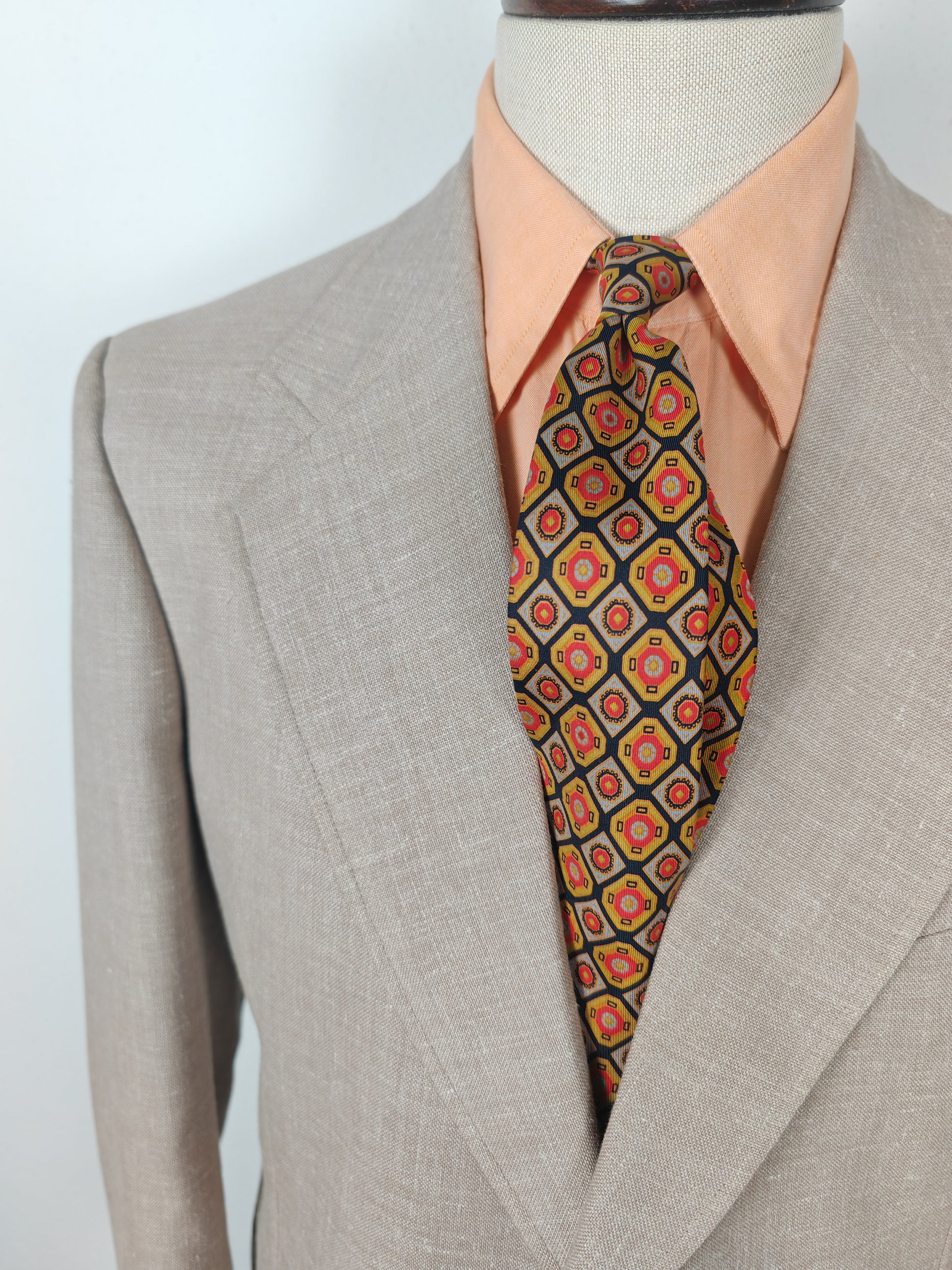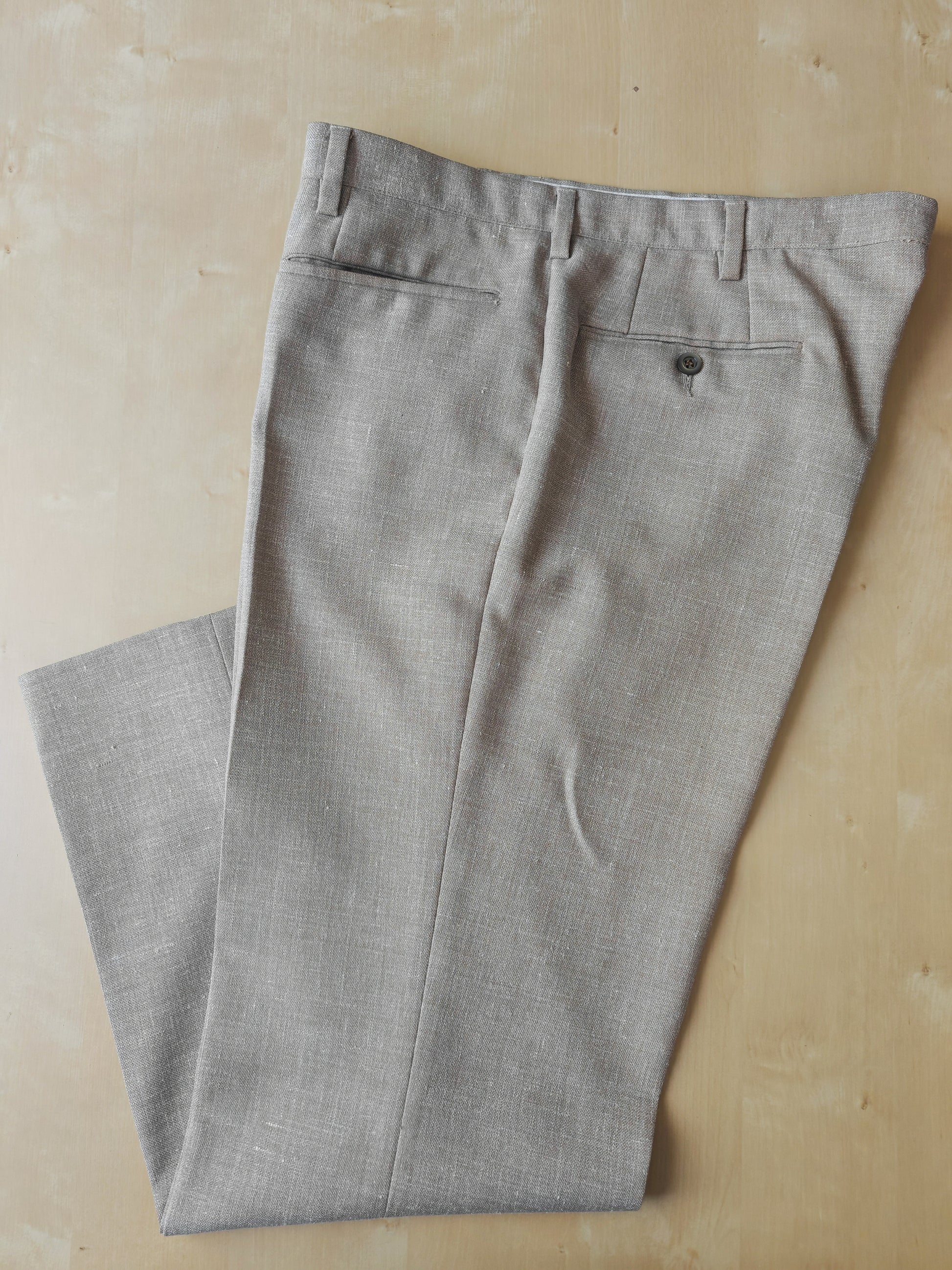 Il tessuto è una tela molto sostenuta in lino con una piccola percentuale di sintetico (terital). Nonostante la composizione in parte sintetica (peraltro tipica degli anni '70 in queste mischie), l'abito ha una lavorazione di altissimo livello, con ottime finiture e giacca completamente intelata full canvas e sfoderata: questo garantisce comunque grande comodità, traspirabilità e freschezza al capo.