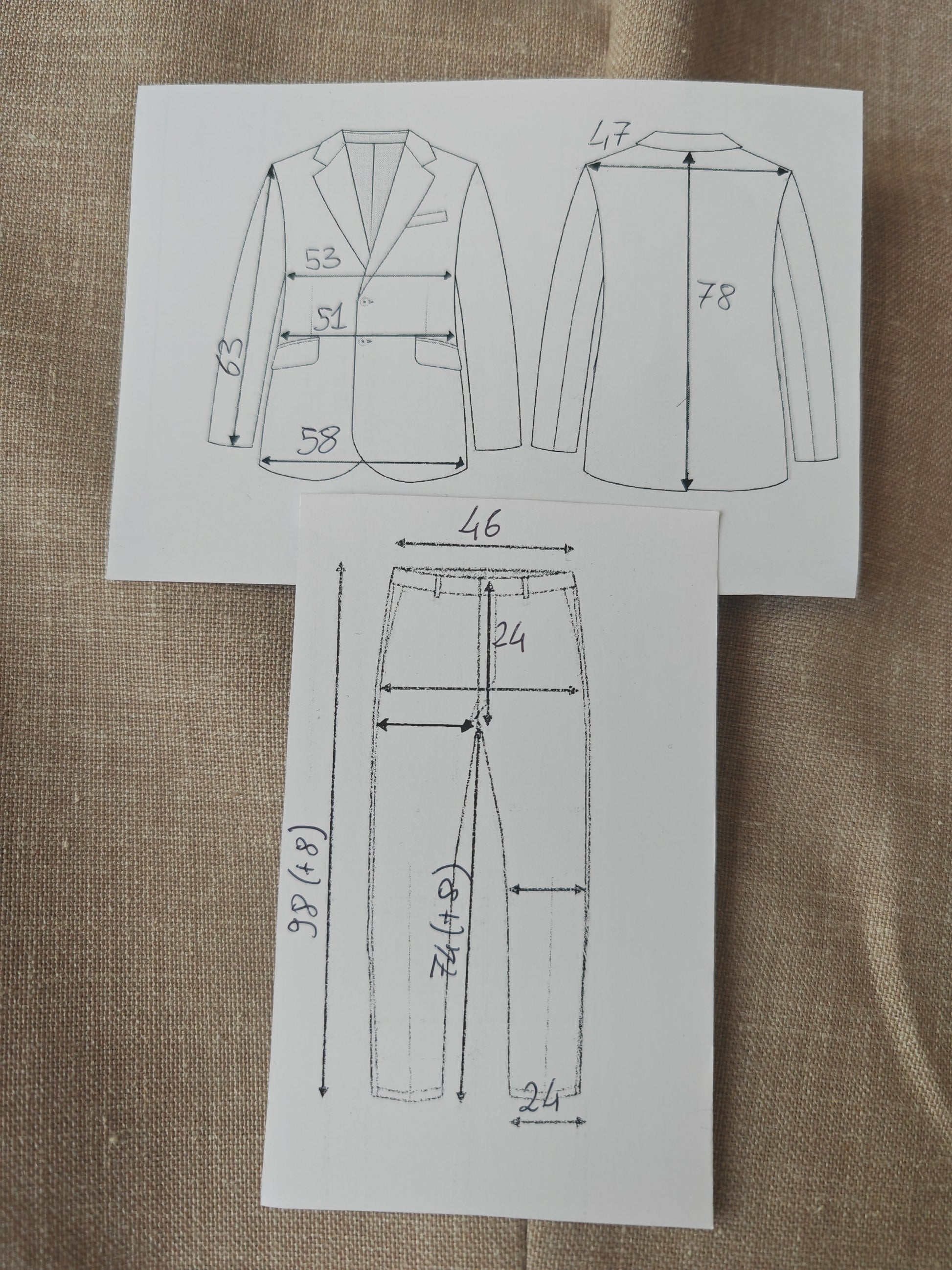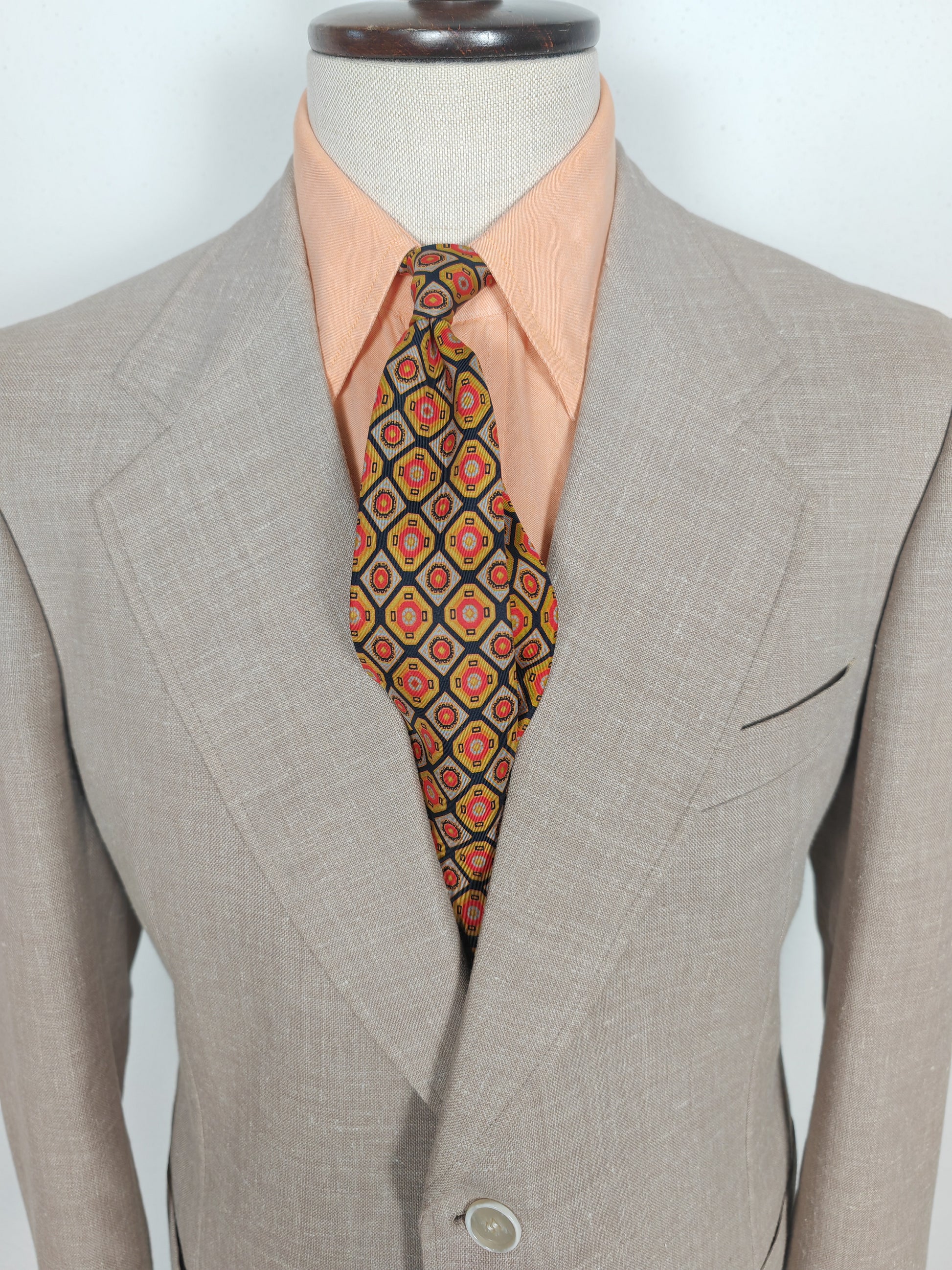 L'abito veste una taglia 48/50. Questo tipo di taglio anni '70 rende al meglio (e risulta più comodo) su corporature abbastanza snelle, dal drop 7 in su. Vedere comunque le misure complete in cm nell'ultima foto. Da segnalare che il pantalone è stato allargato in vita.
