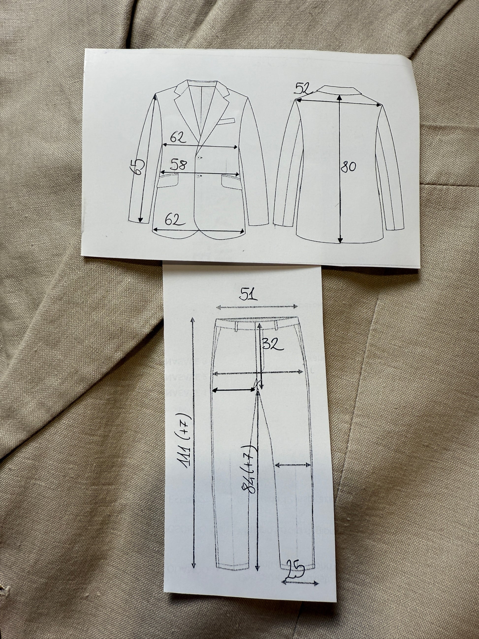⚠️ Per un confronto il più utile e accurato possibile, è necessario confrontare le misure solo fra abiti dal taglio simile: ad esempio, un abito dal taglio classico (giacca morbida e pantalone a vita alta) con un altro abito analogo, non con un abito slim fit o con un abito tipo anni '70 dal taglio snello e avvitato (e viceversa).
